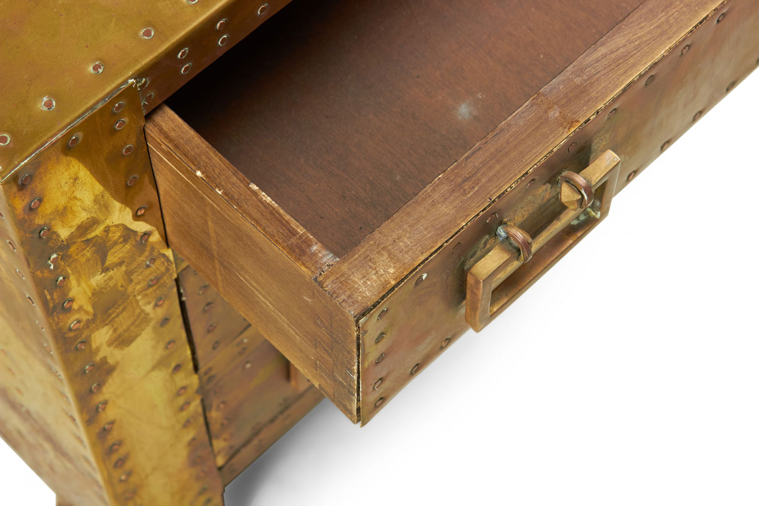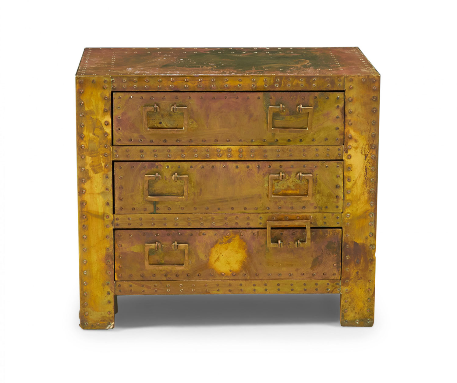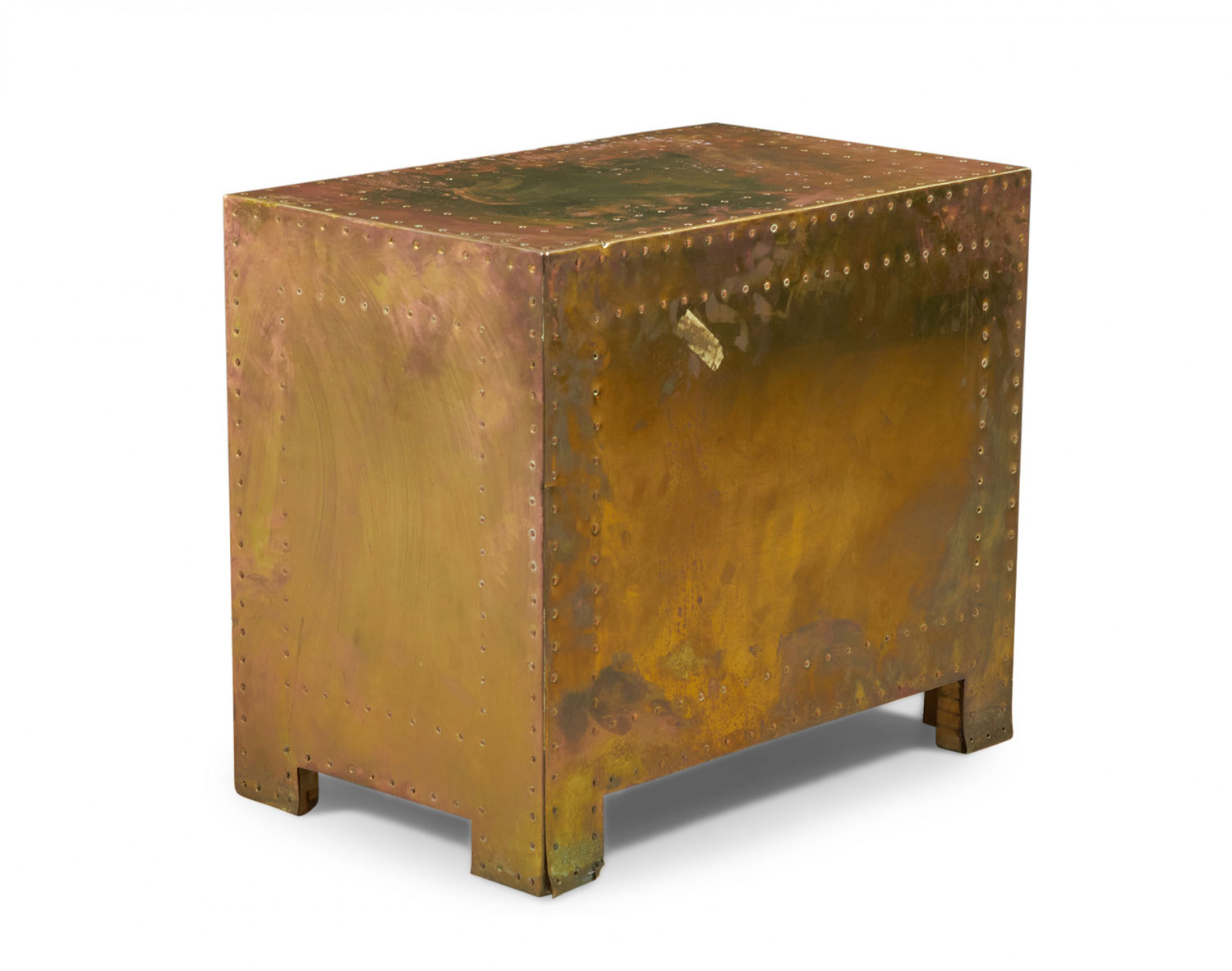 Spanish High Style 'Strongbox' bedside table / commode with brass-clad exterior with natural patina, copper studs, and three drawers with rectangular brass pulls. (SARREID, LTD.)(Similar pieces available with different patinas: DUF0025A-D, similar occasional tables: DUF0026A-F)