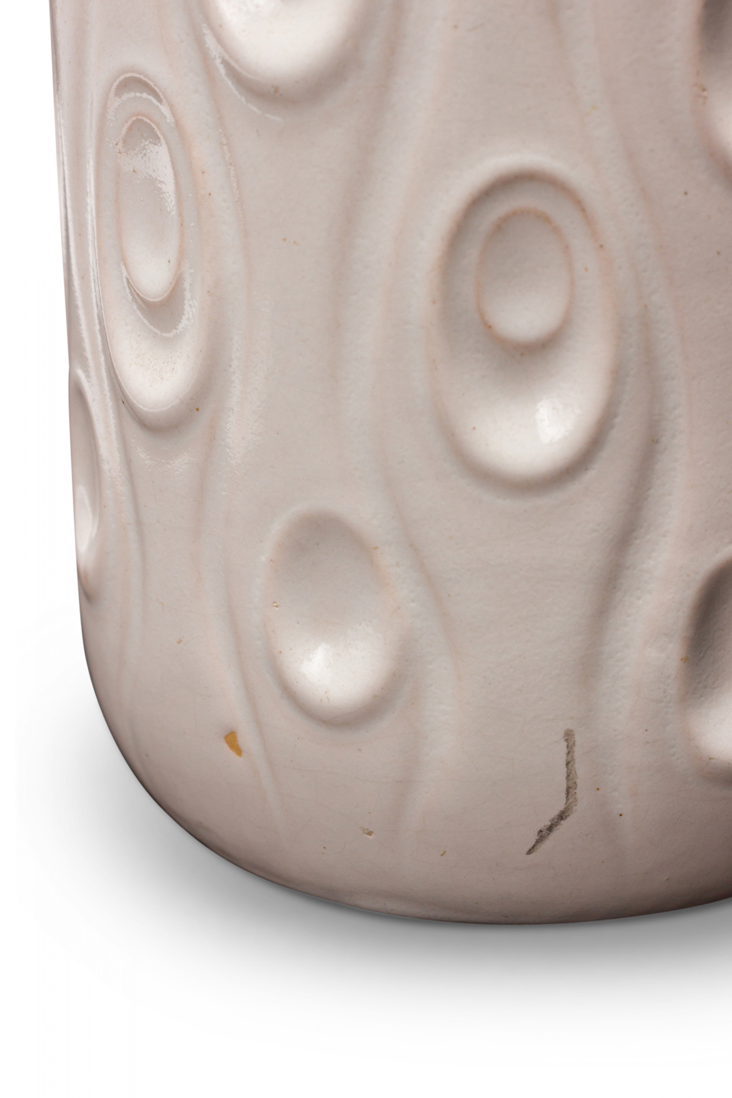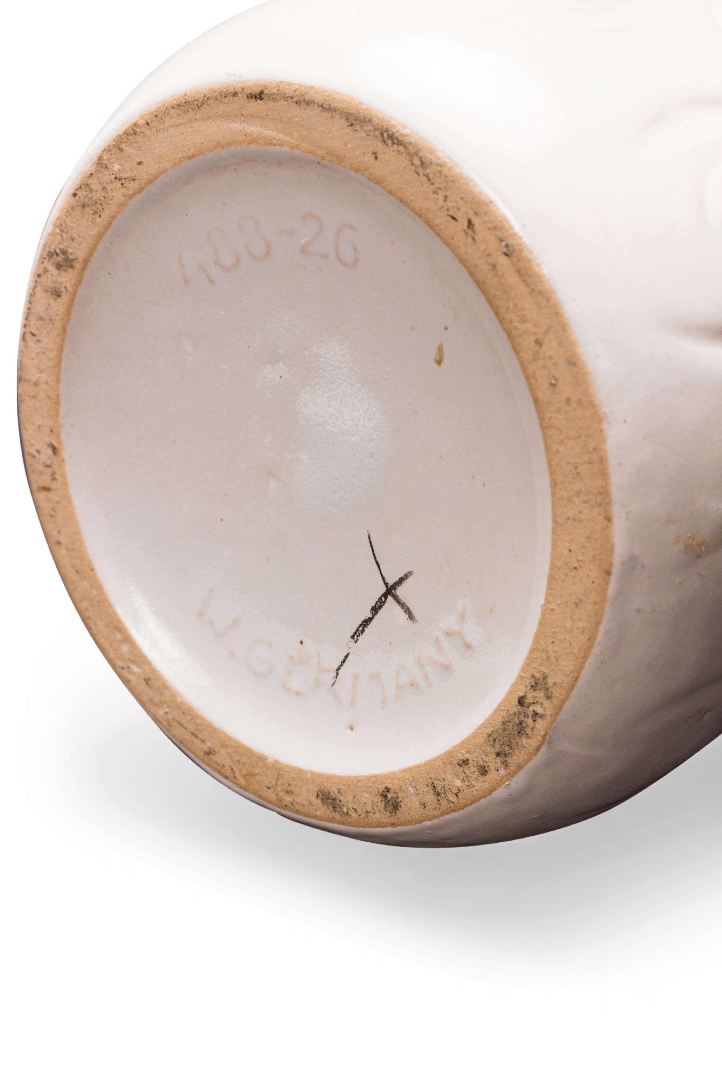 West German Mid-Century white cermaic pitcher with an incised pattern consisting of multi-level ovals between vertical wavy lines called "Koralle" below a horizontally ribbed lip and handle. (SCHEURICH, mark on bottom, W. GERMANY 488-26)