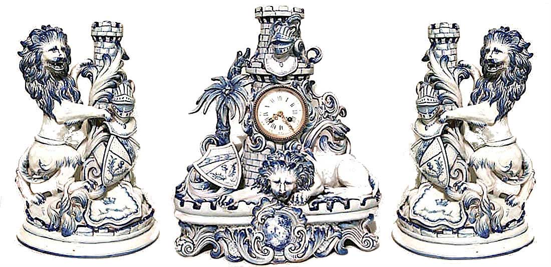 Set of 3 French Victorian Porcelain Lion Clock Set