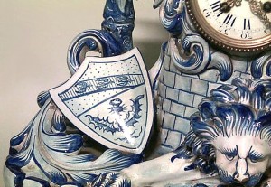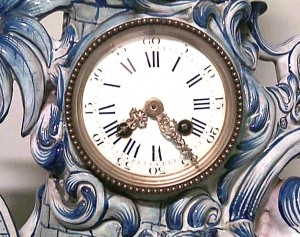 Set of 3 French Victorian blue and white porcelain lion clock and pair of candelabra (signed St. Clement - Estate of Evelyn Walsh McLean) (PRICED AS SET)