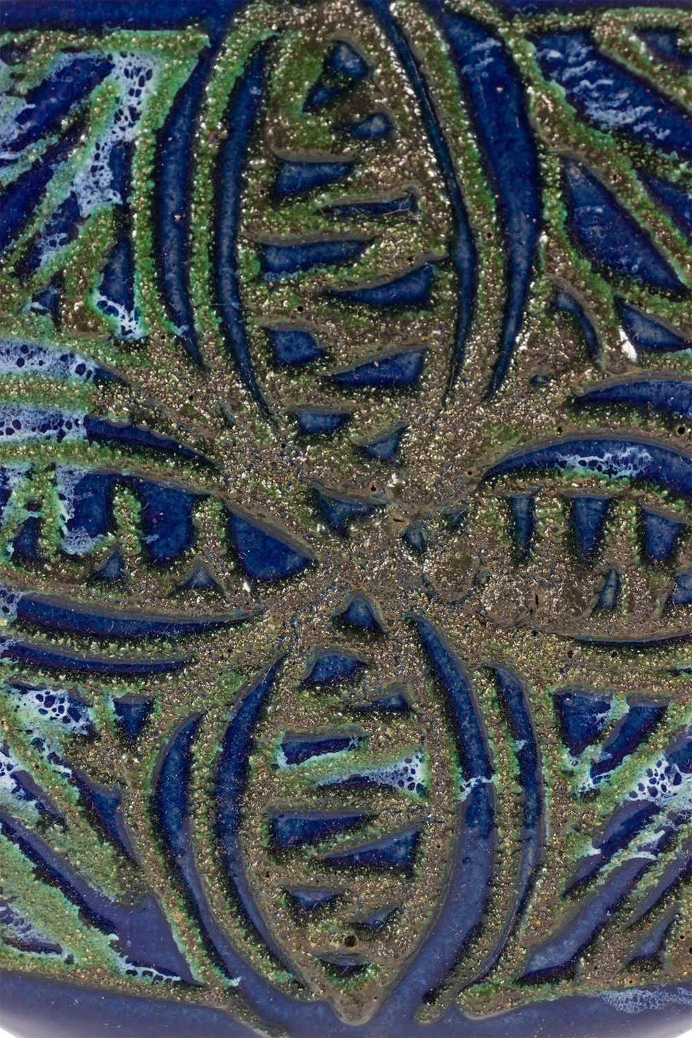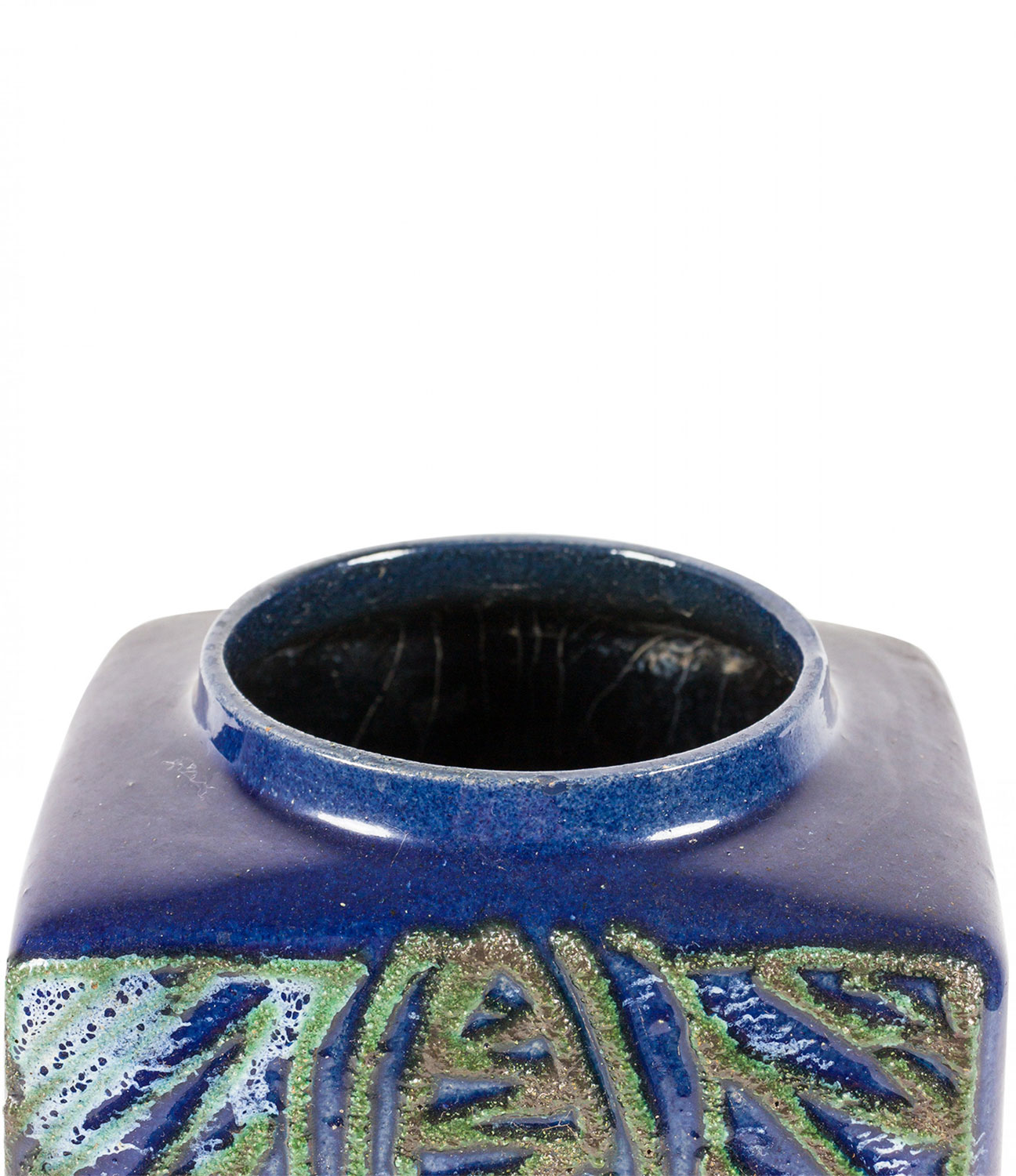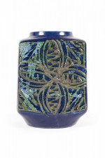 East German Mid-Century square ceramic vase with a raised gold and green clover and line pattern against a deep blue glazed ground. (stamped on bottom, STREHLA MADE IN GDR 7277).