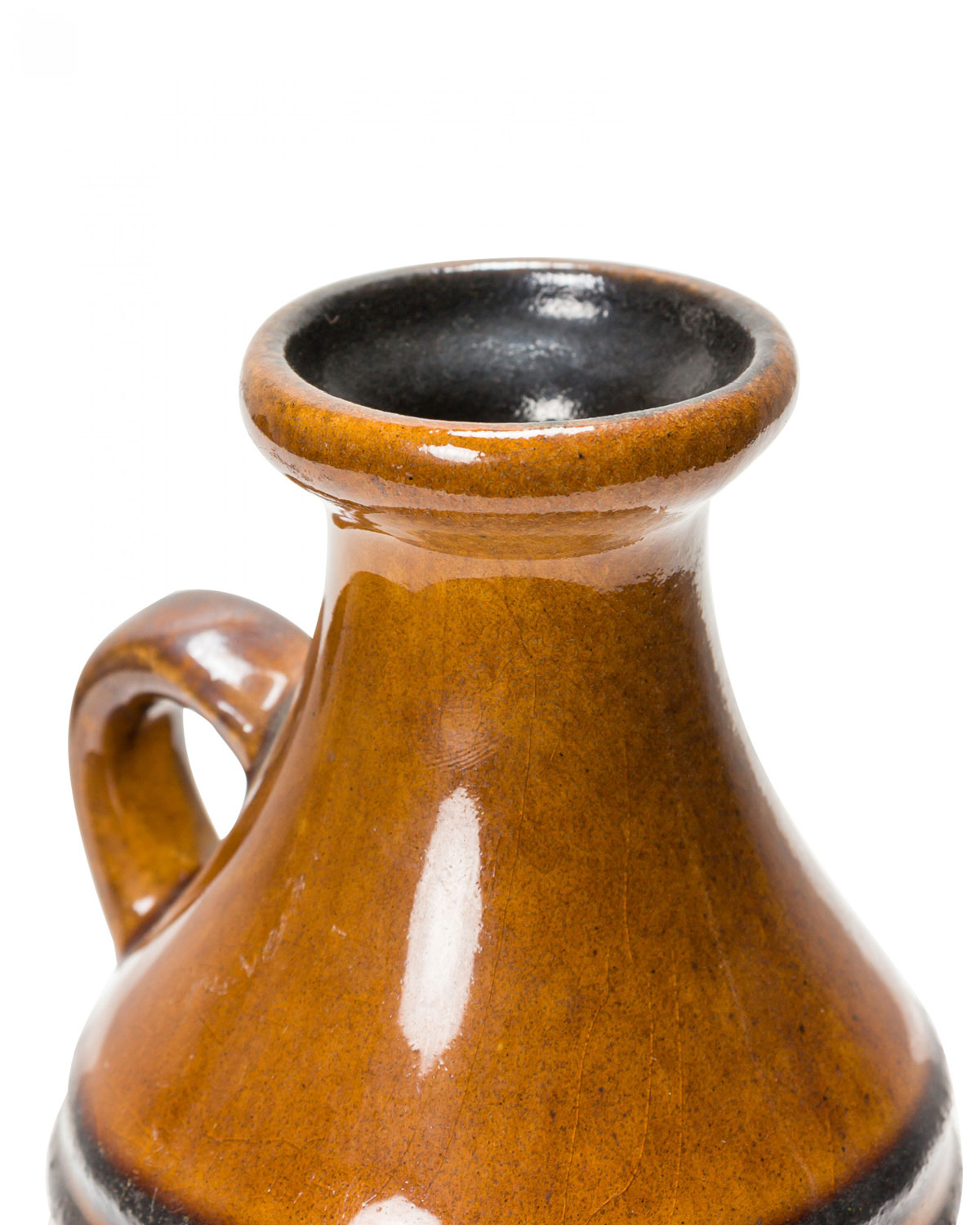 East German Mid-Century ceramic jug with a banded raised green pattern around the body against a glazed yellow ground below a tapered neck with a flared mouth and small handle in a brown glaze. (mark on bottom, STREHLA KERAMIK MADE IN GDR 1390).