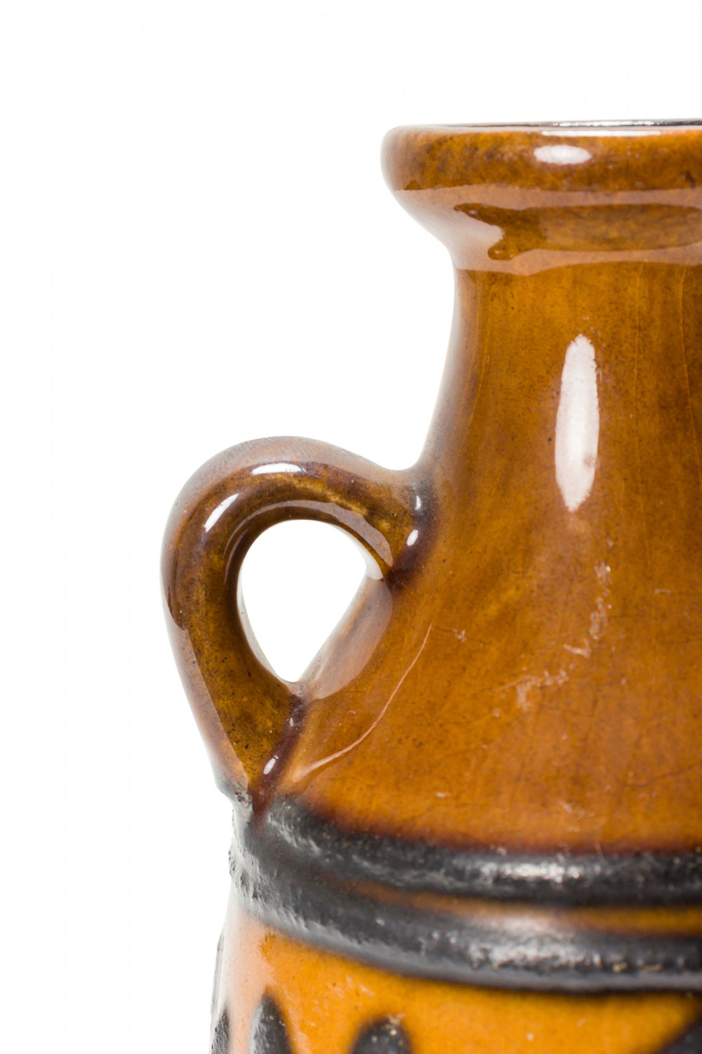 East German Mid-Century ceramic jug with a banded raised green pattern around the body against a glazed yellow ground below a tapered neck with a flared mouth and small handle in a brown glaze. (mark on bottom, STREHLA KERAMIK MADE IN GDR 1390)