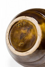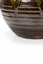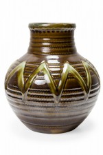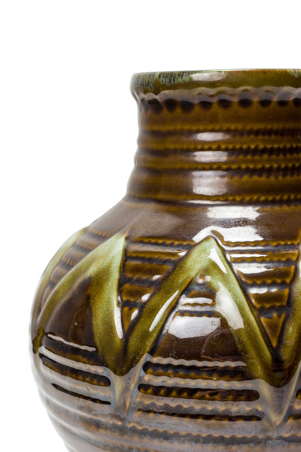 East German Mid-Century horizontally ribbed ceramic vase with a raised green zig-zag design around its bulbous bottom against a dark brown glazed ground. (mark on bottom, STREHLA KERAMIK IMPORT HANDAEMALT 1245)