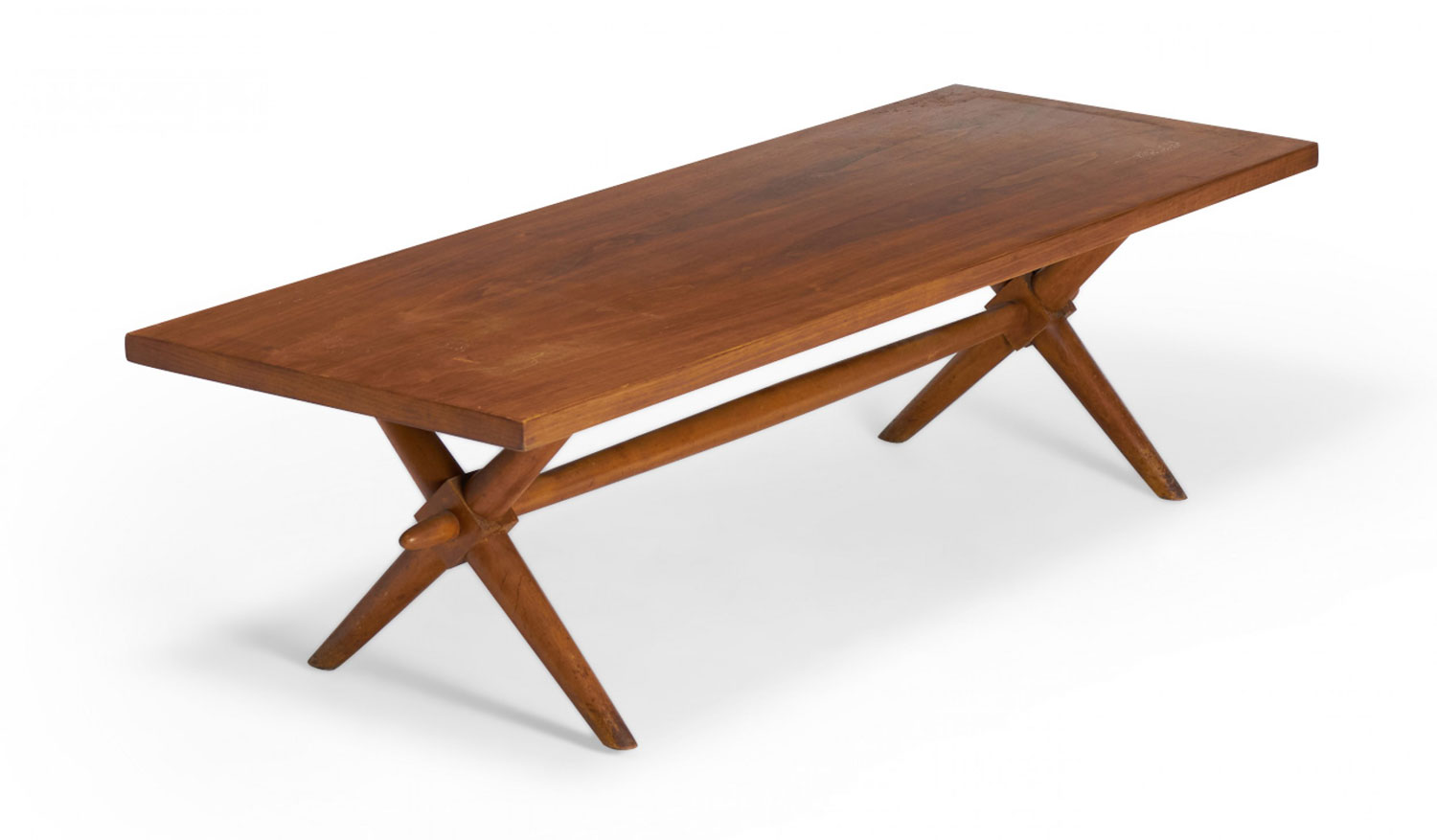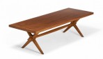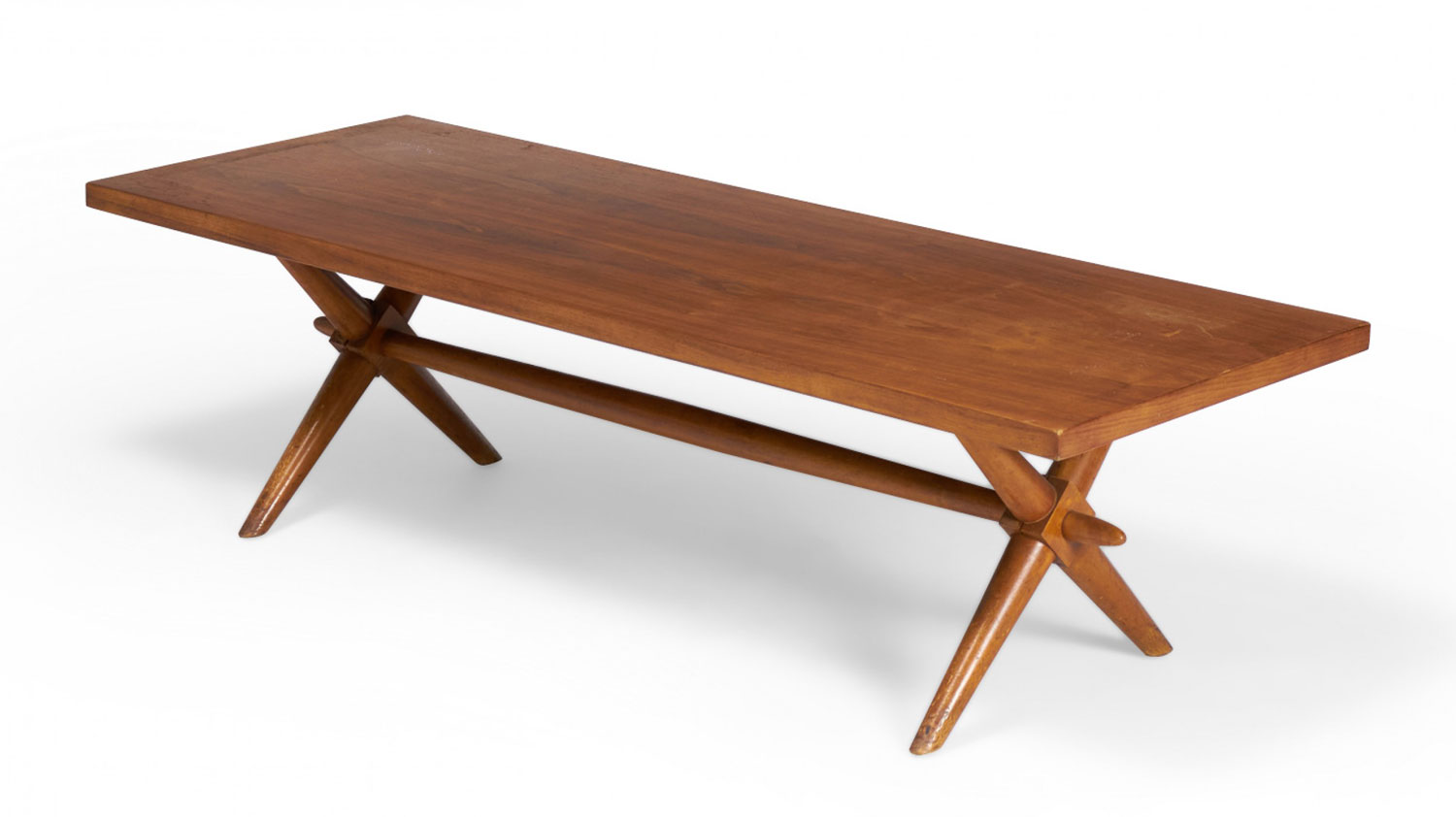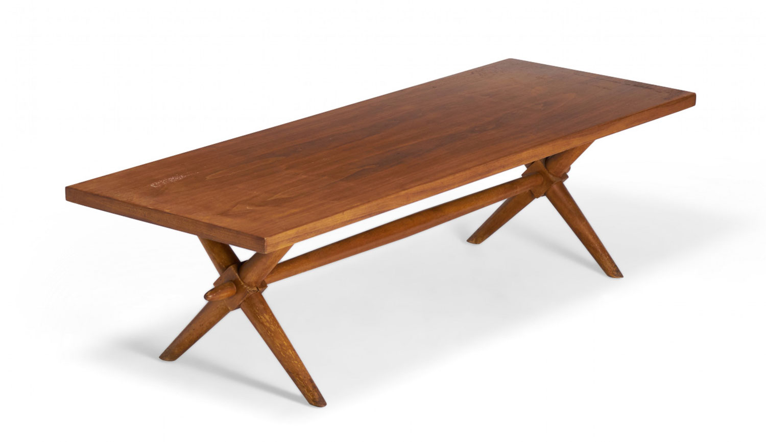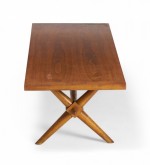 American Mid-Century walnut coffee / cocktail table with a rectangular top resting on a crossed trestle base. (T.H. ROBSJOHN-GIBBINGS)