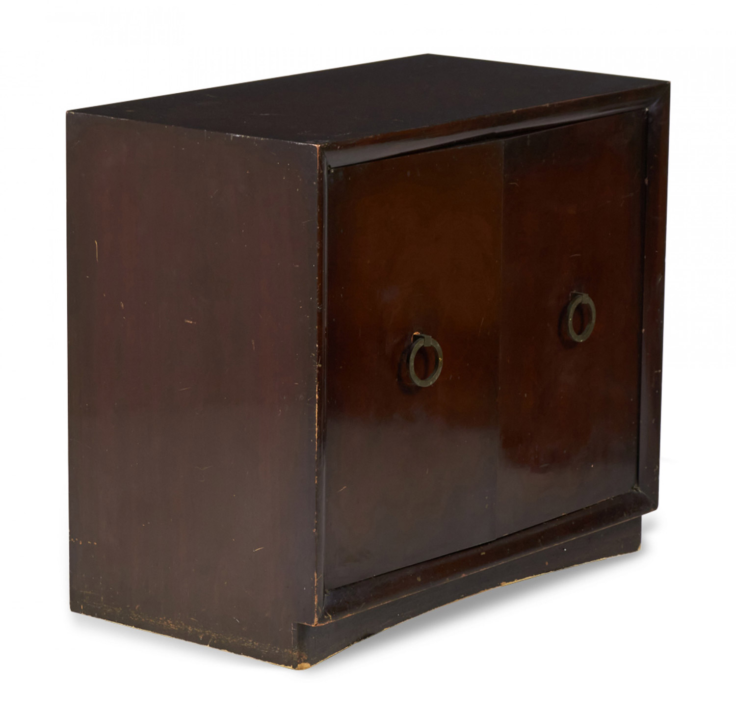American Mid-Century (1950s) two-door mahogany cabinet with brass ring-shaped door pulls, resting on four small concealed casters. (T.H. ROBSJOHN-GIBBINGS FOR WIDDICOMB MODERN)(Similar cabinet: DUF0139B).