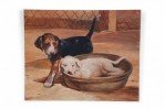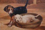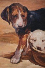 English Victorian style (20th Century) painting of a yellow lab puppy sleeping in a basket, while a brown, black and white puppy walks by, with a chain-link fence in the background, on plywood.