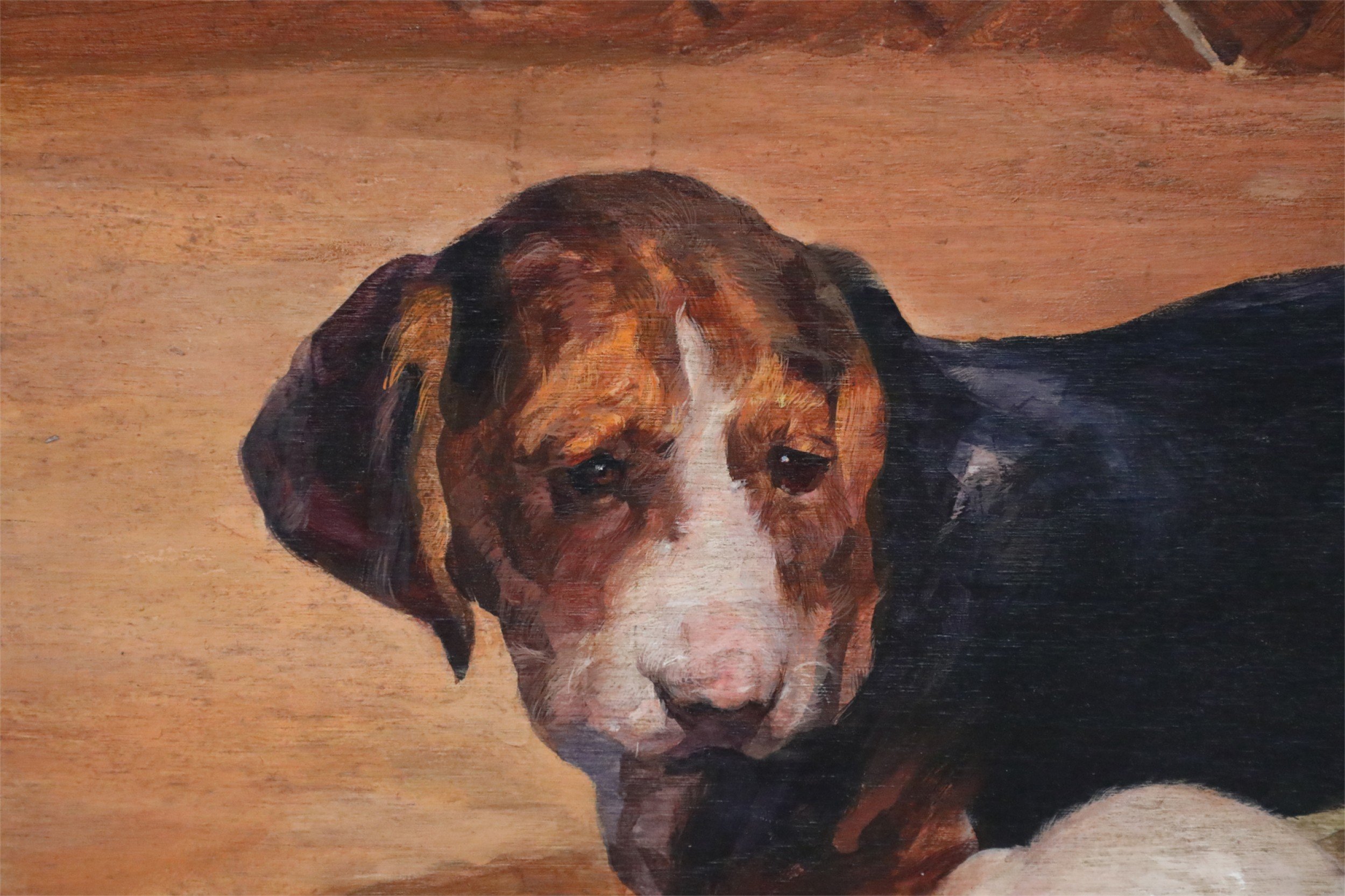 English Victorian style (20th Century) painting of a yellow lab puppy sleeping in a basket, while a brown, black and white puppy walks by, with a chain-link fence in the background, on plywood..
