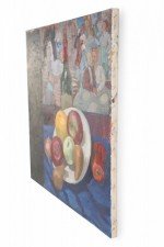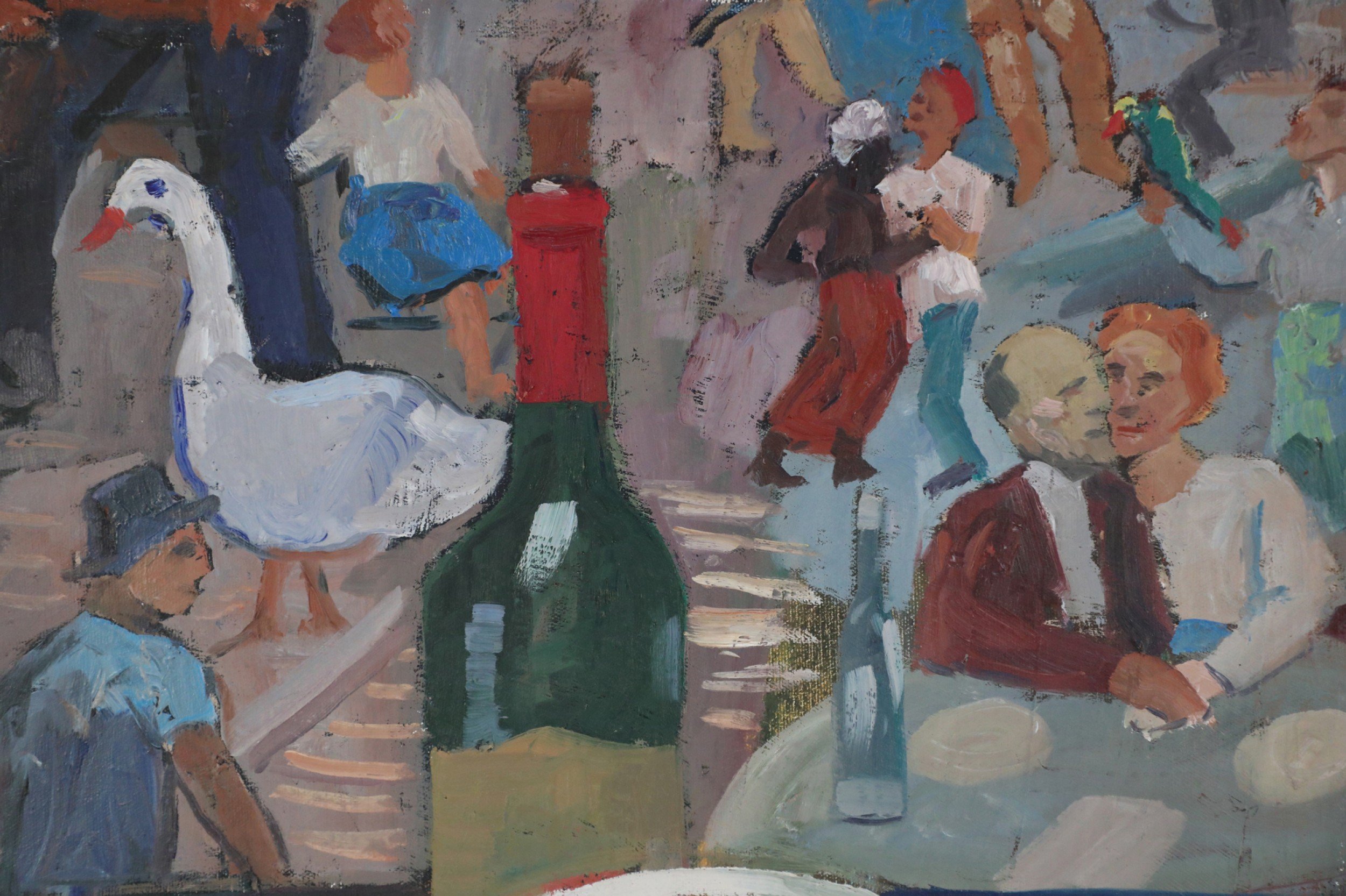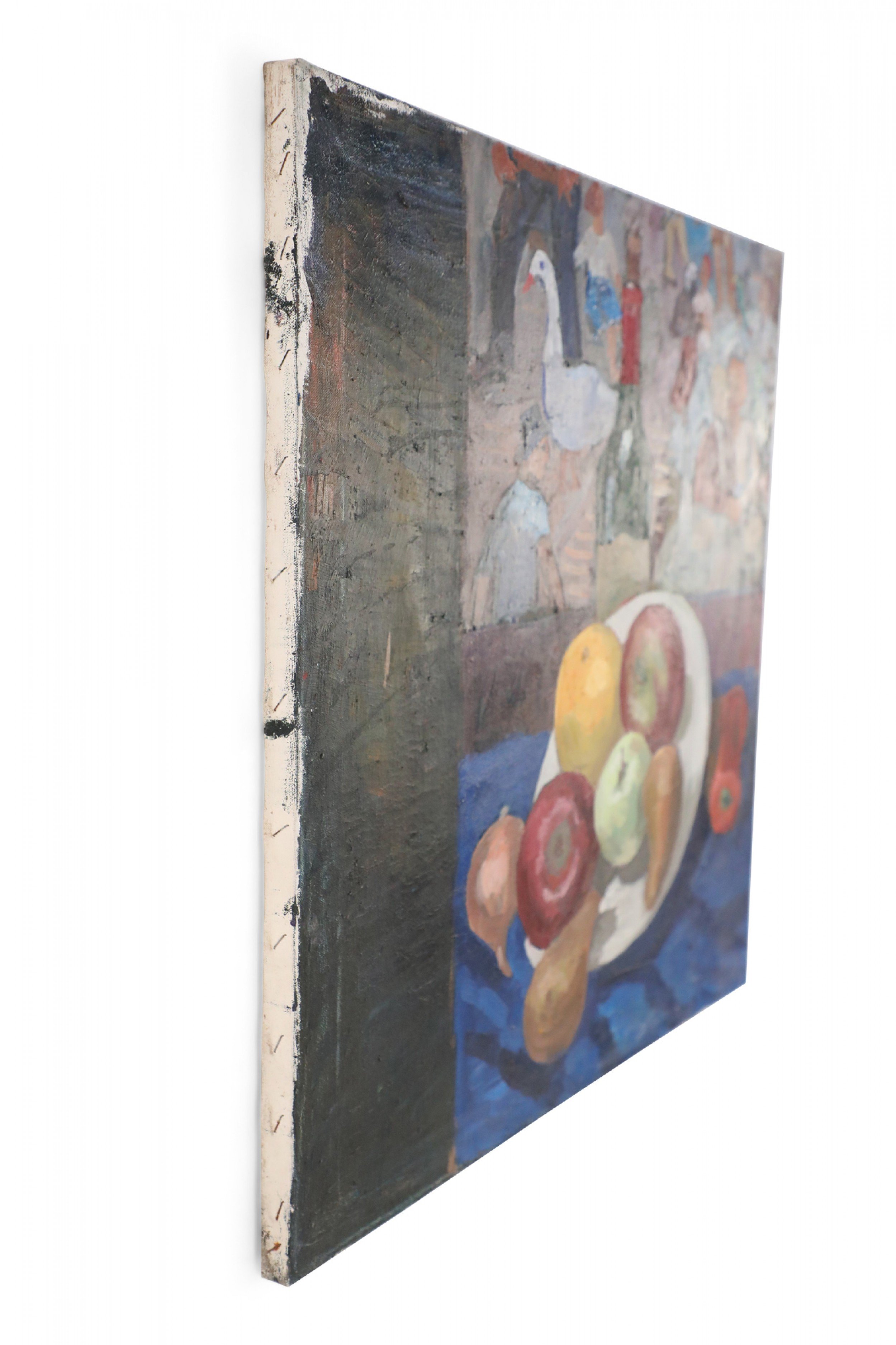 Vintage (20th Century) acrylic painting of a fruit bowl in front of a window revealing a bustling street scene with people and birds, on unframed square canvas..