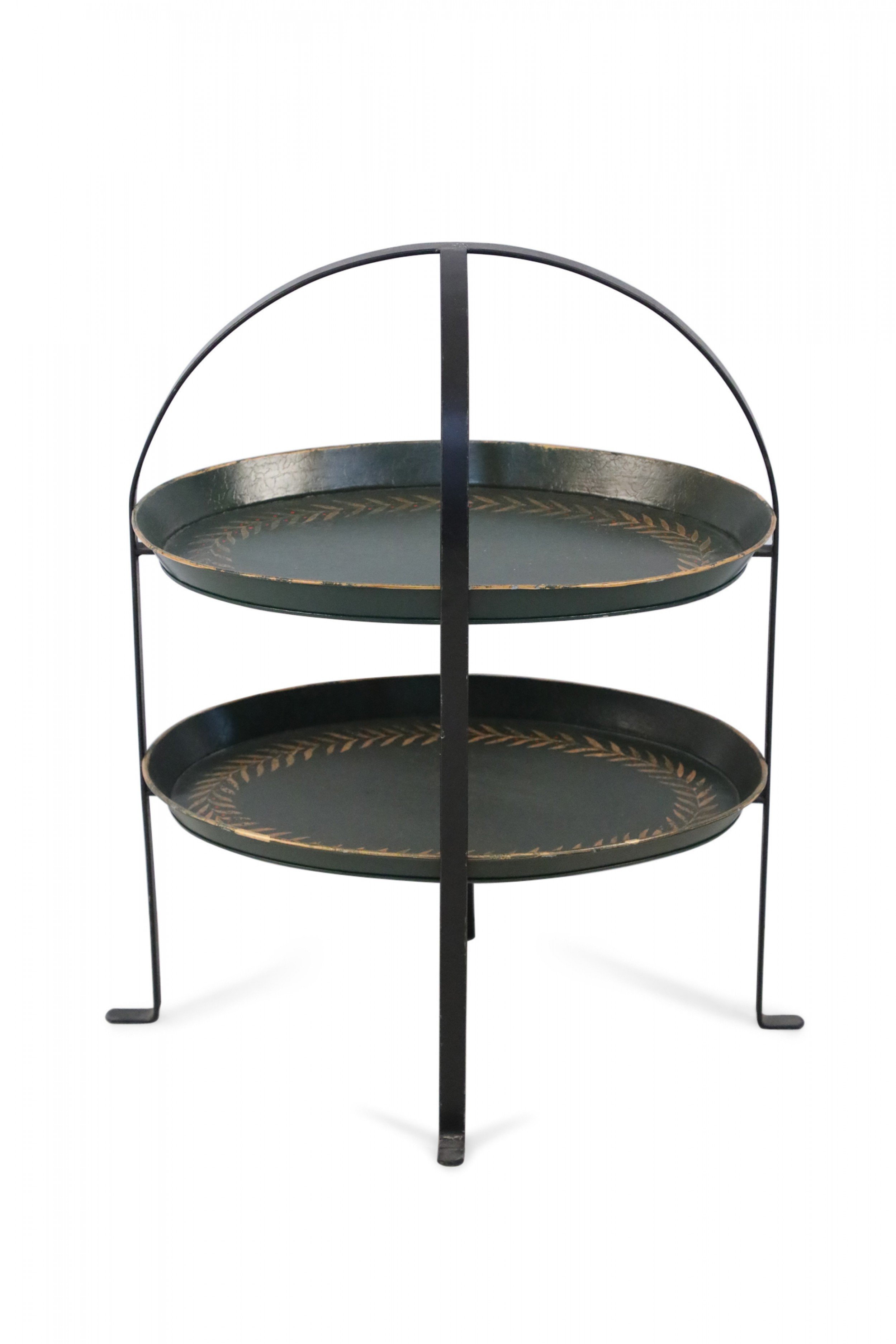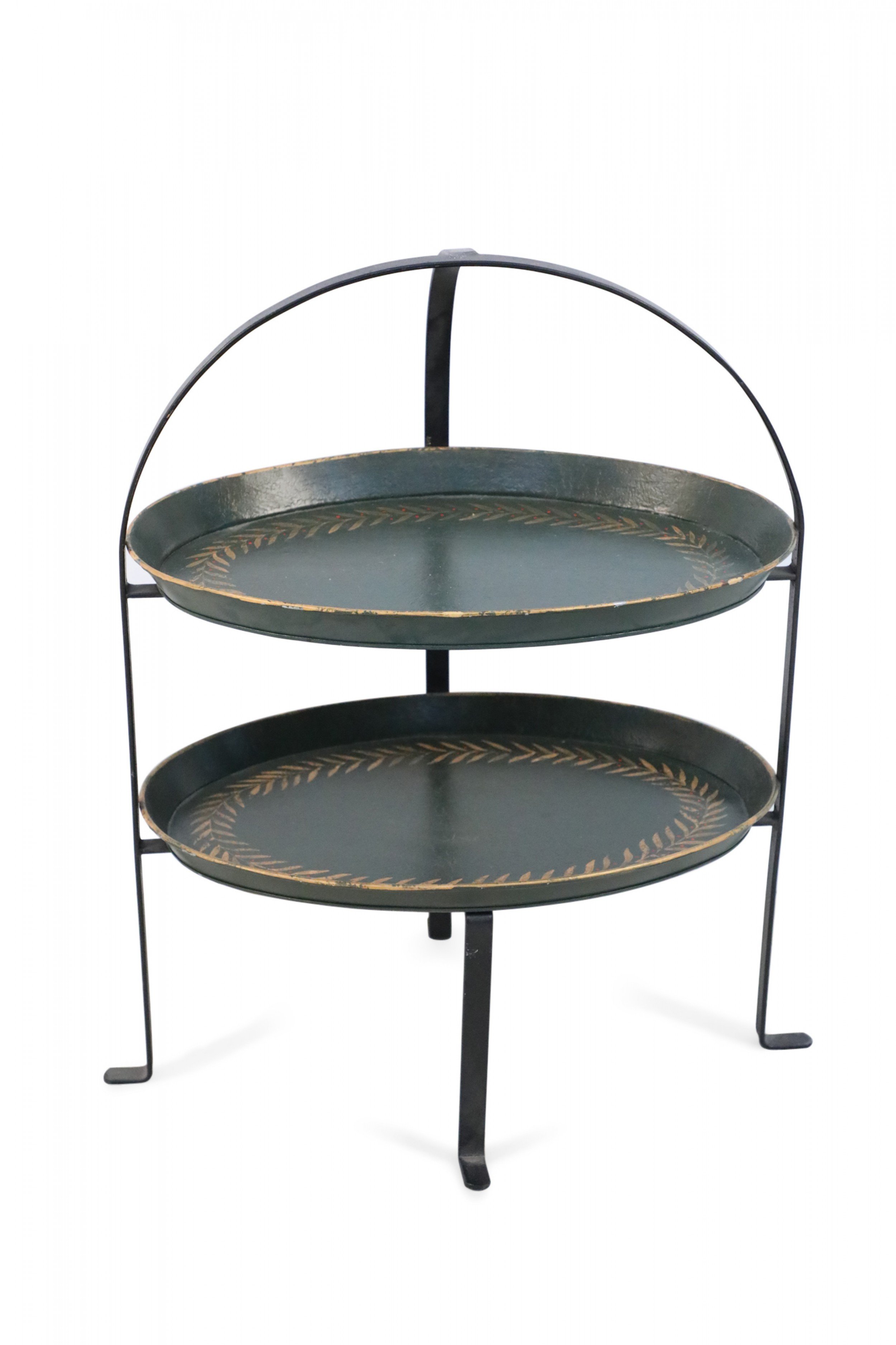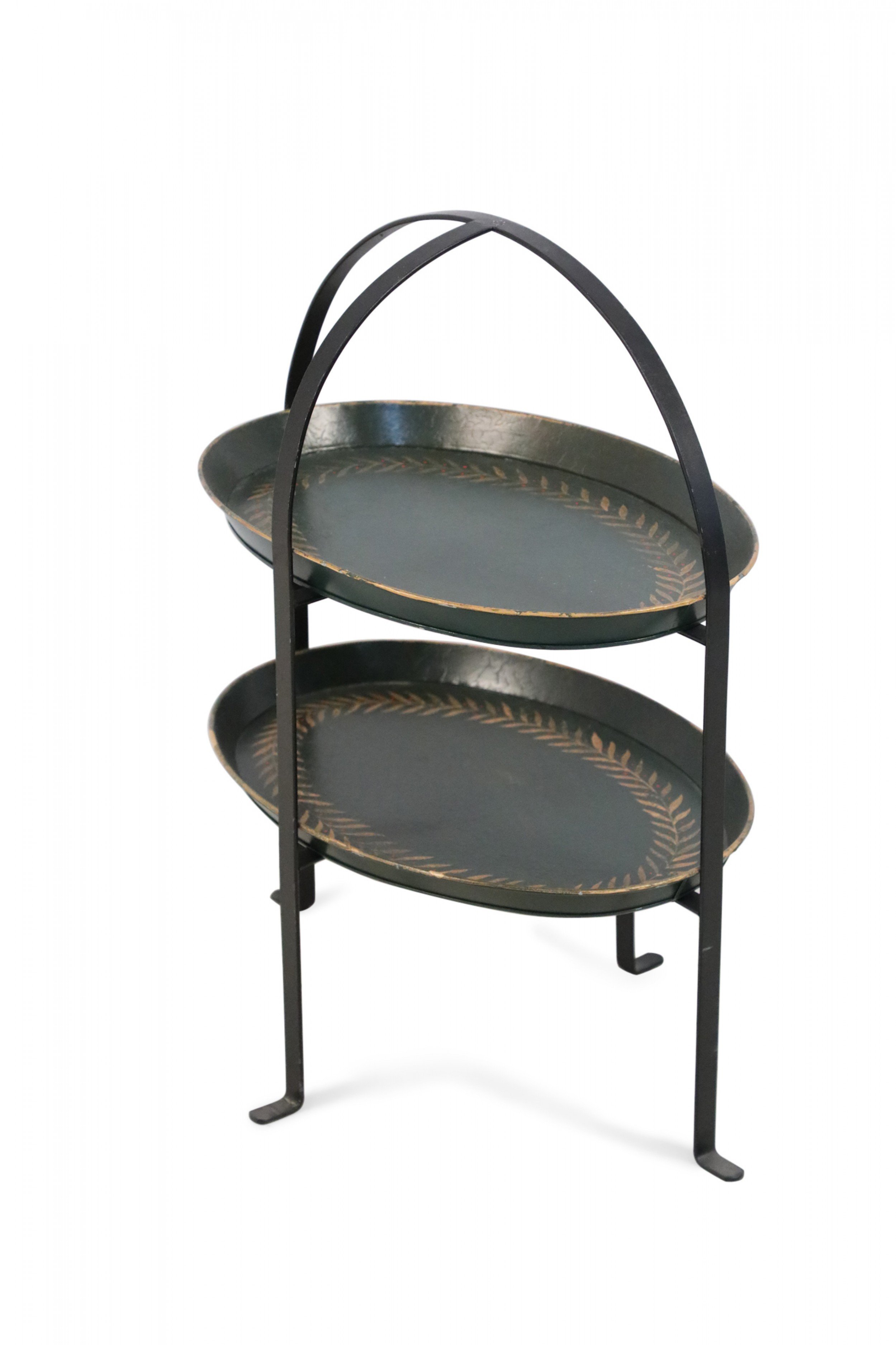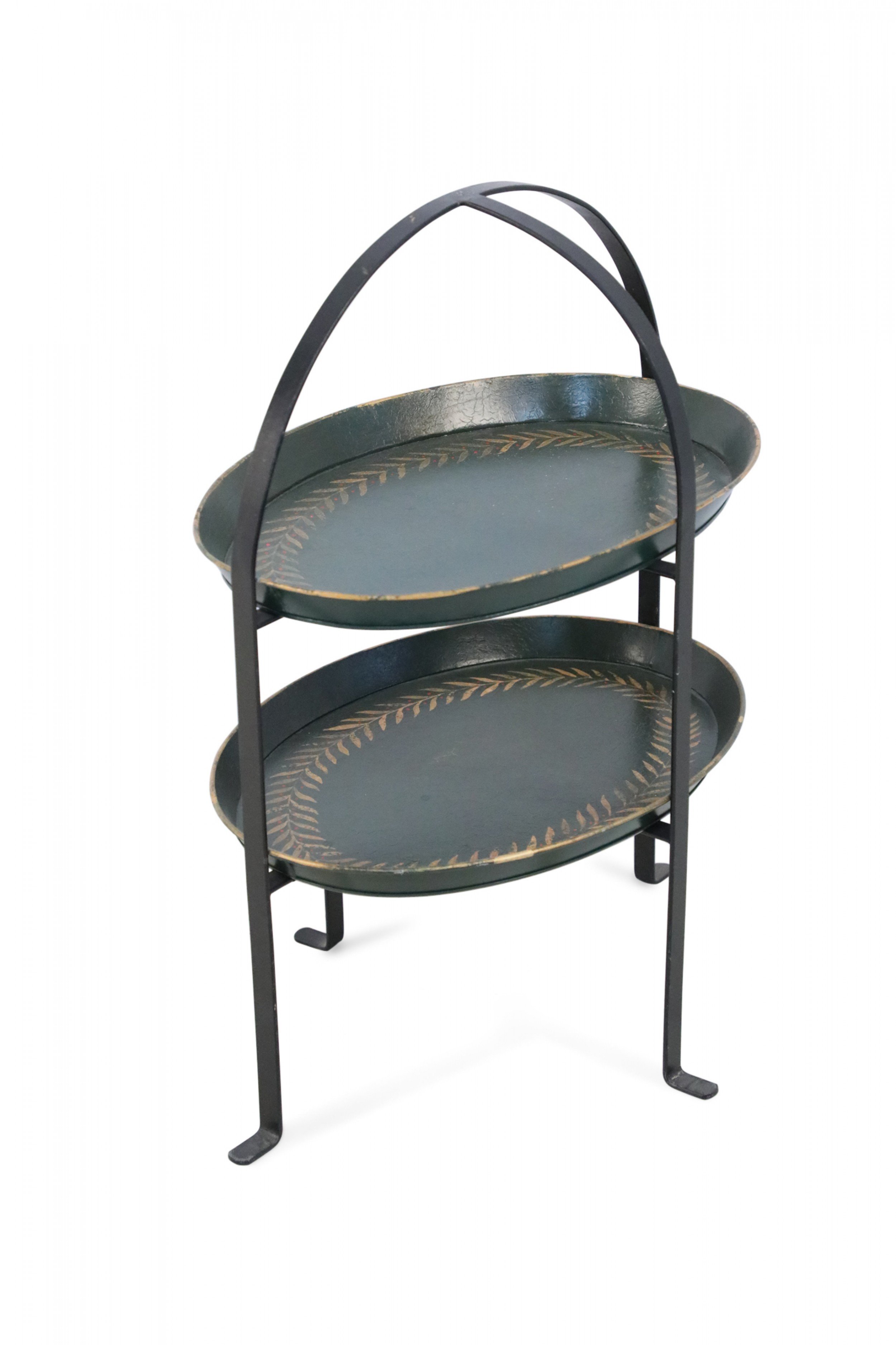 Vintage Chinese dark green tole, two-tiered server with a black metal frame holding two oval shelves decorated in a garland border of gold leaves with red dots (Available in black: NWL2451)..