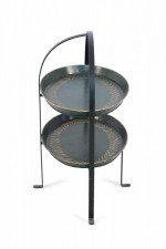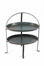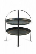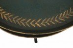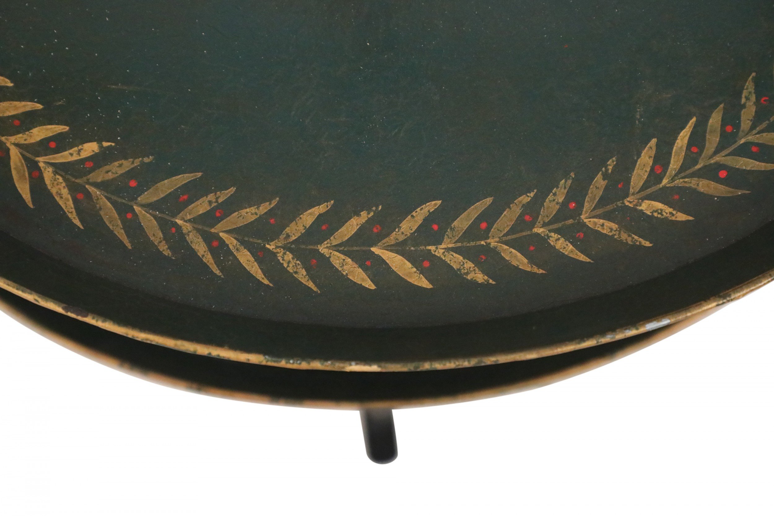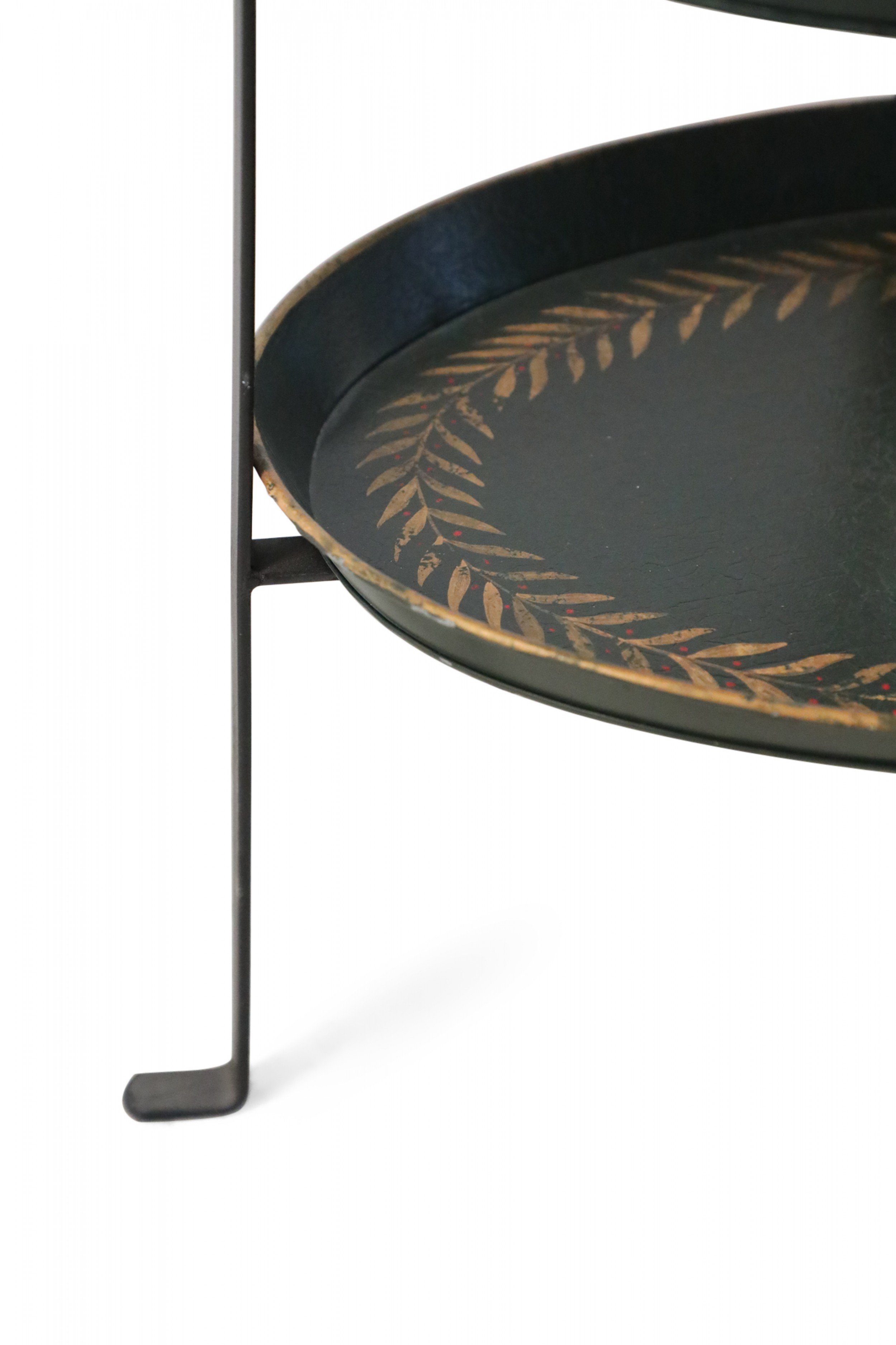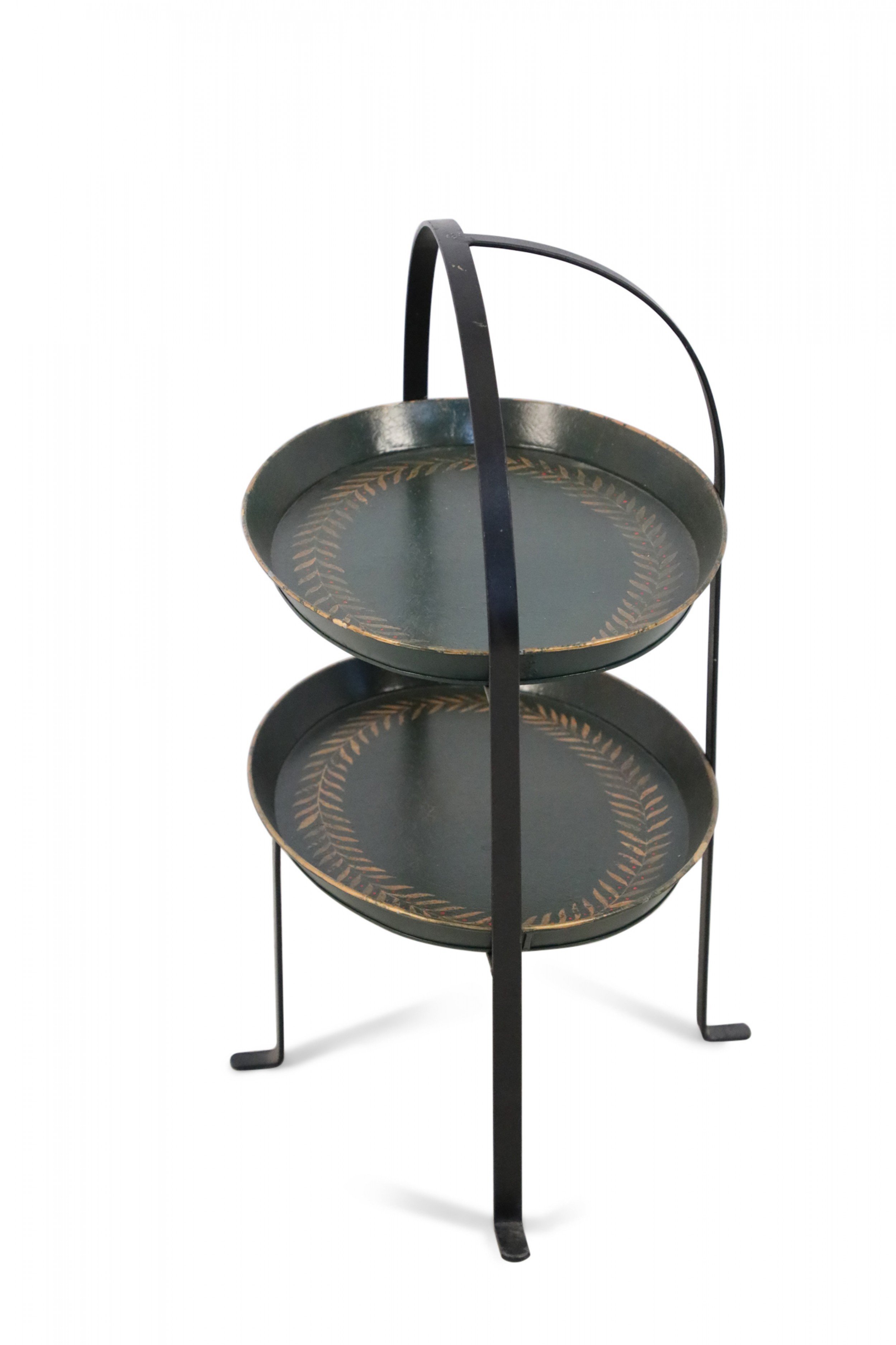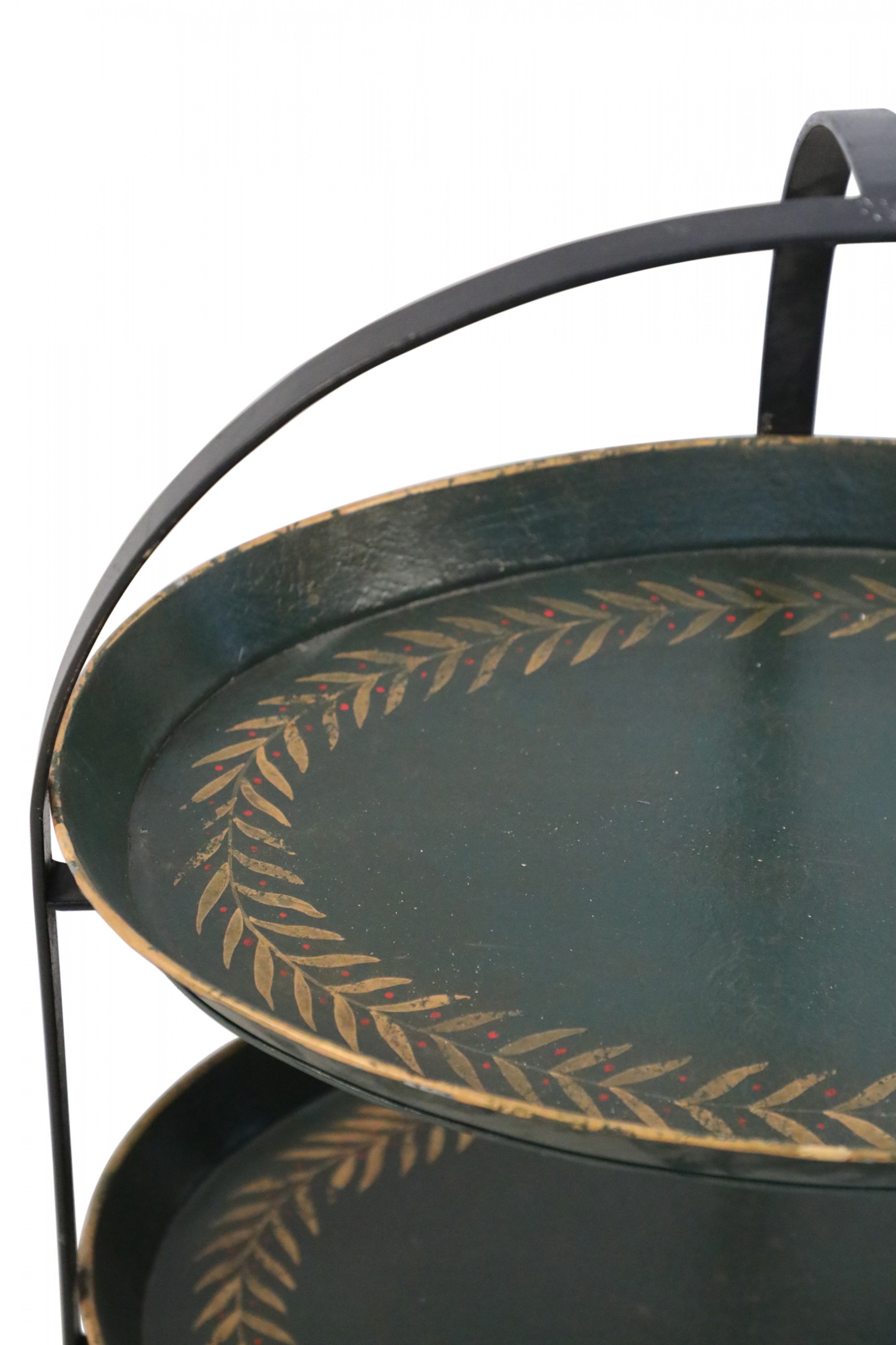 Vintage Chinese dark green tole, two-tiered server with a black metal frame holding two oval shelves decorated in a garland border of gold leaves with red dots (Available in black: NWL2451)..