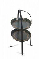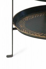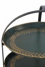 Vintage Chinese dark green tole, two-tiered server with a black metal frame holding two oval shelves decorated in a garland border of gold leaves with red dots (Available in black: NWL2451).