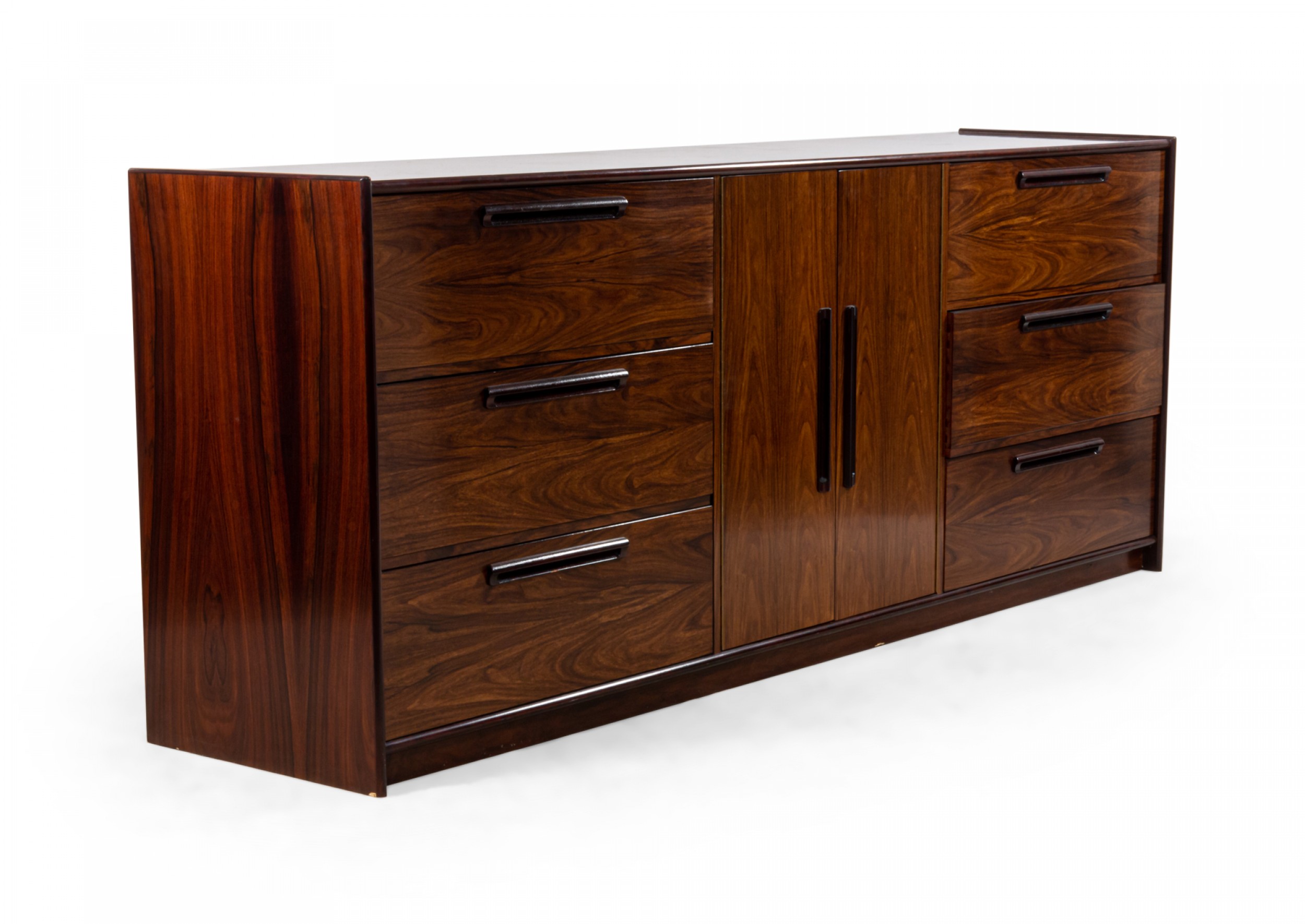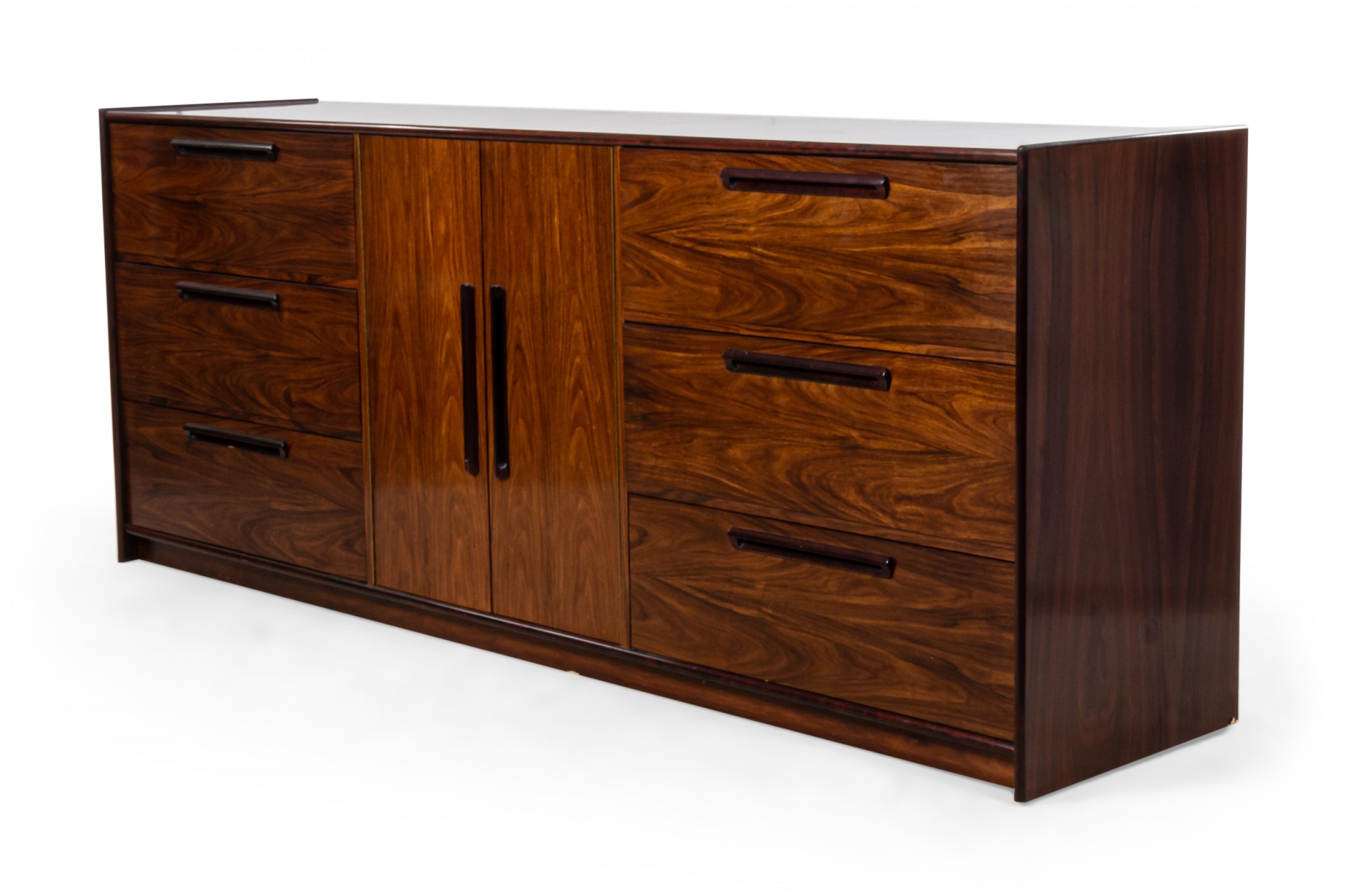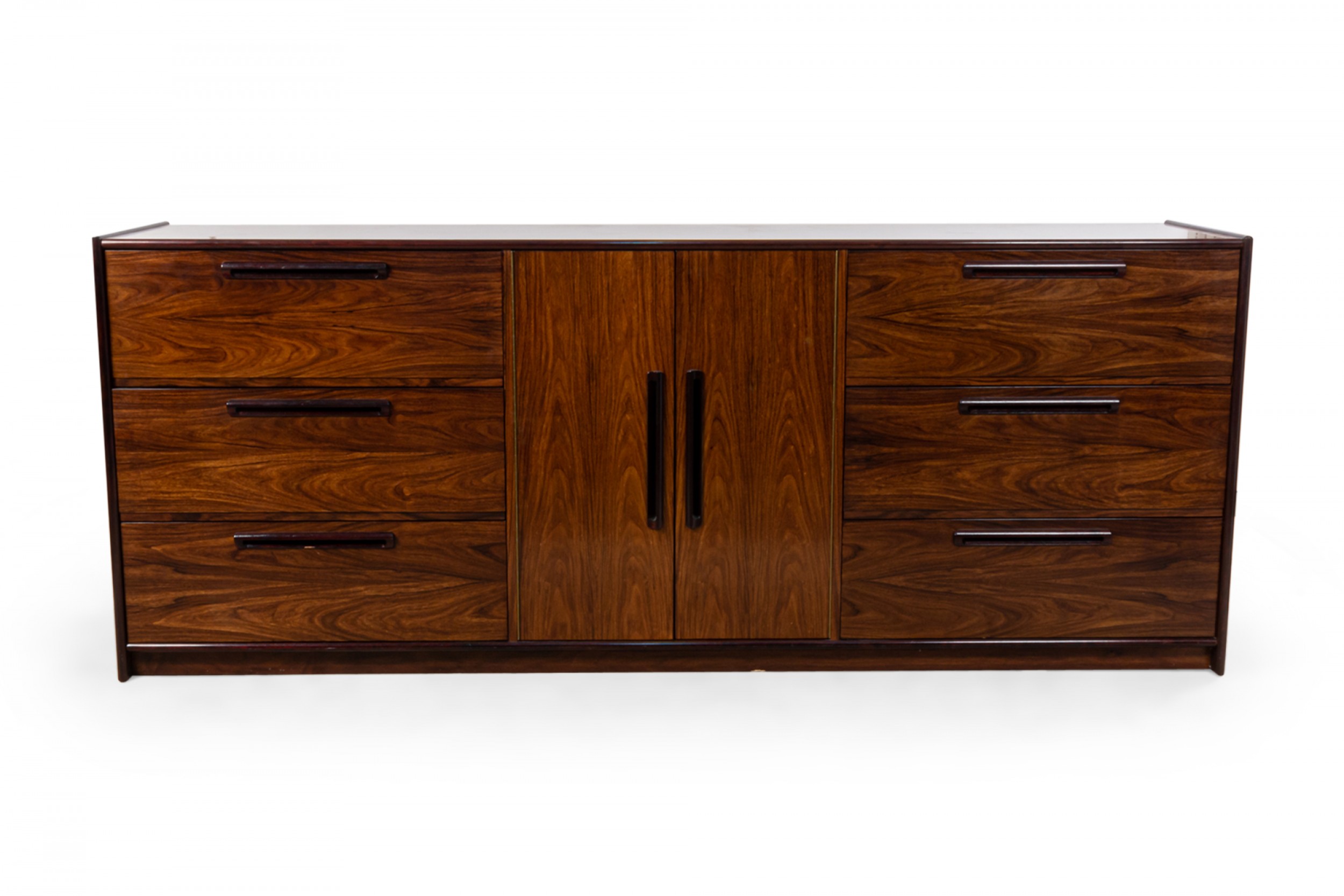 Scandinavian Mid-Century rosewood veneer dresser with 3 drawers on either side and a 2-door cabinet compartment containing two wooden shelves (WESTNOFA) (Related item: NWL081).