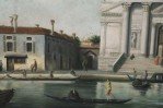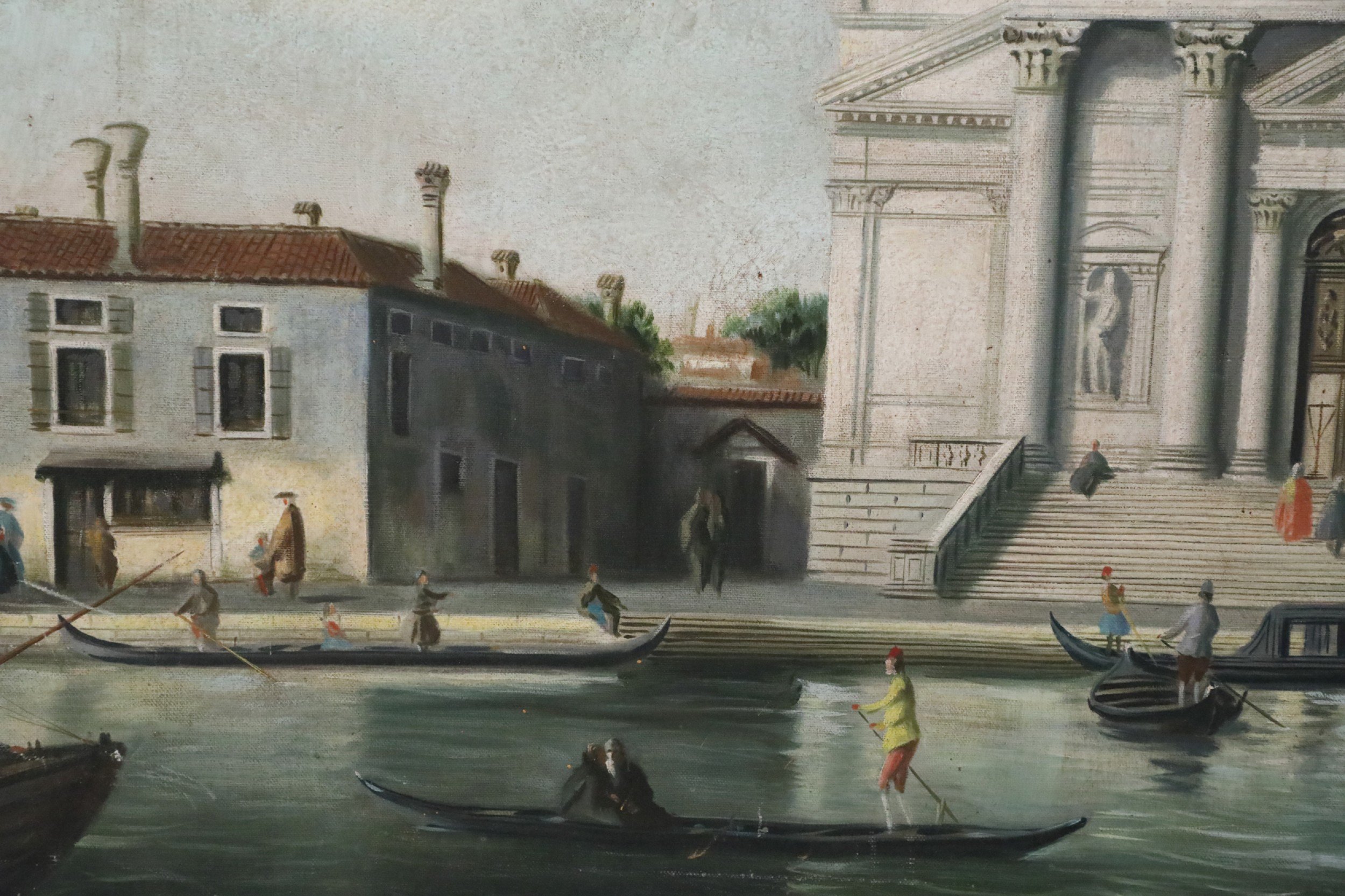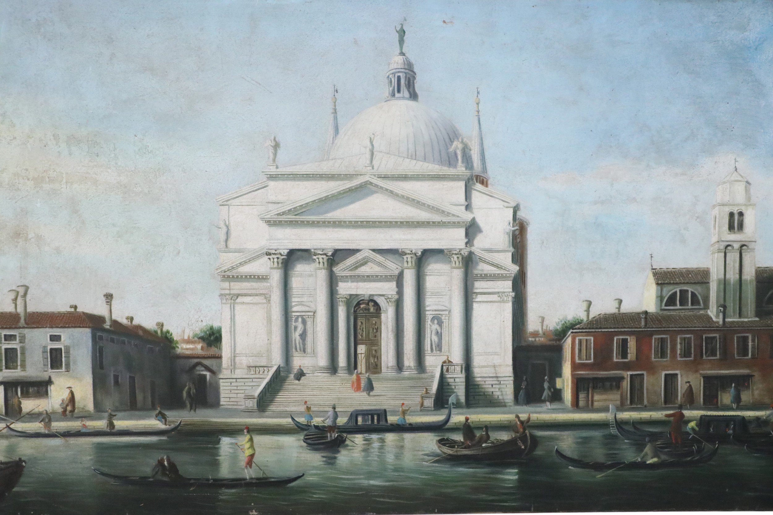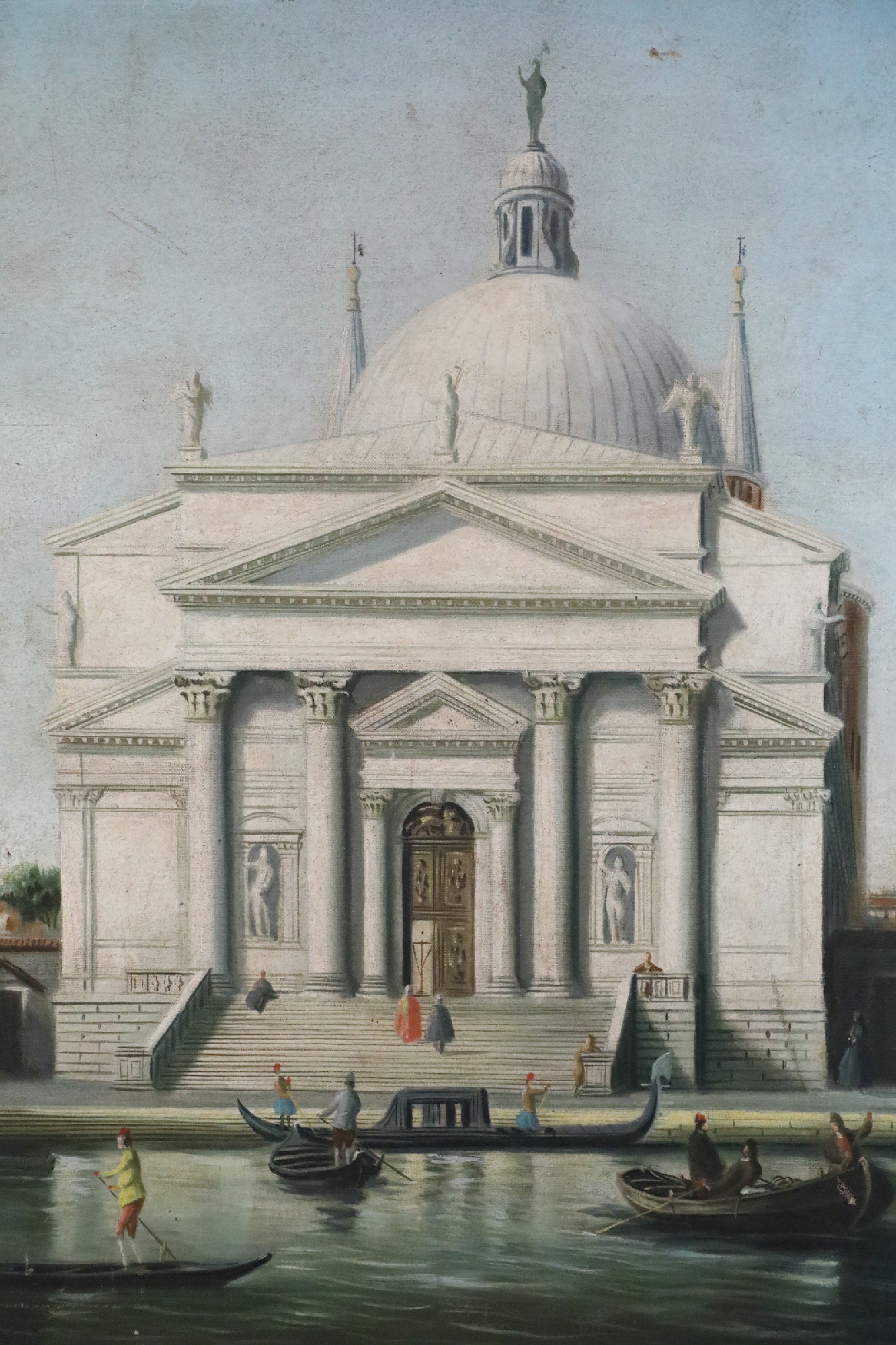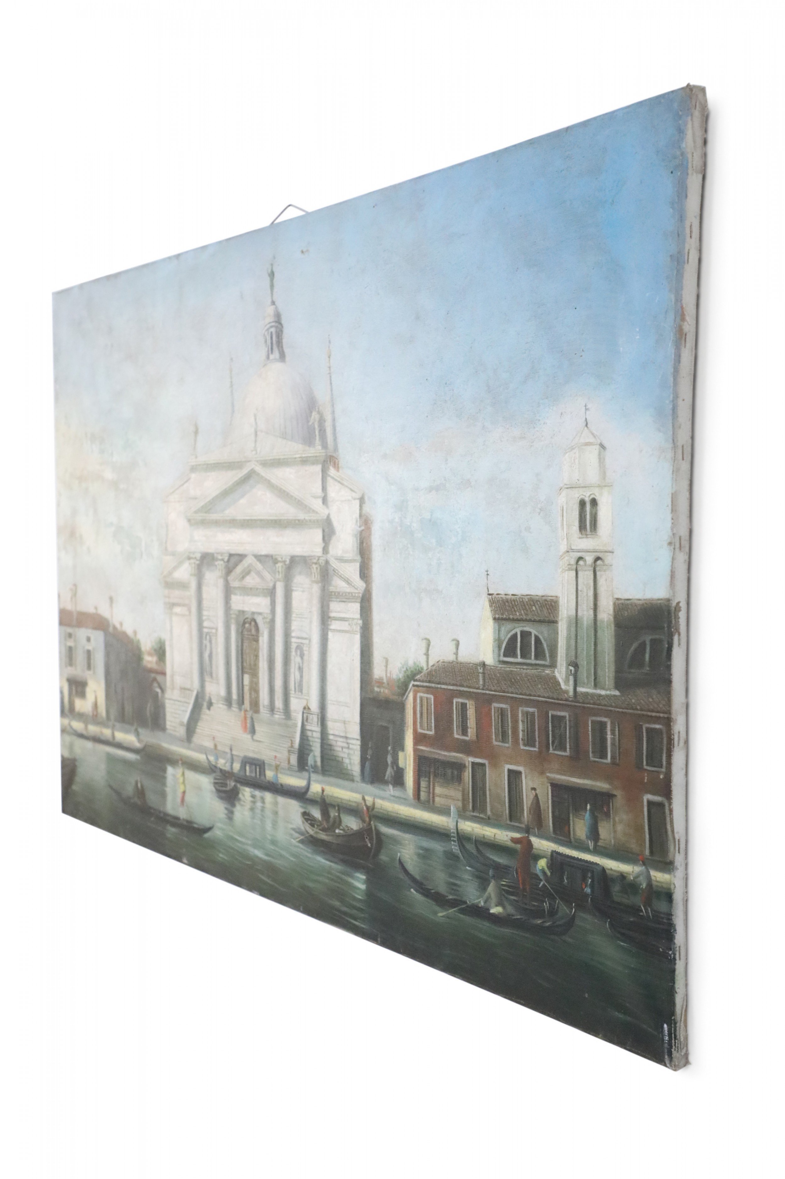 Italian Venetian-Style (20th Century) painting of a white classical, domed church, resembling the Church of San Giorgio Maggiore, directly on a canal filled with gondolas in transit. Painted on unframed, rectangular canvas.