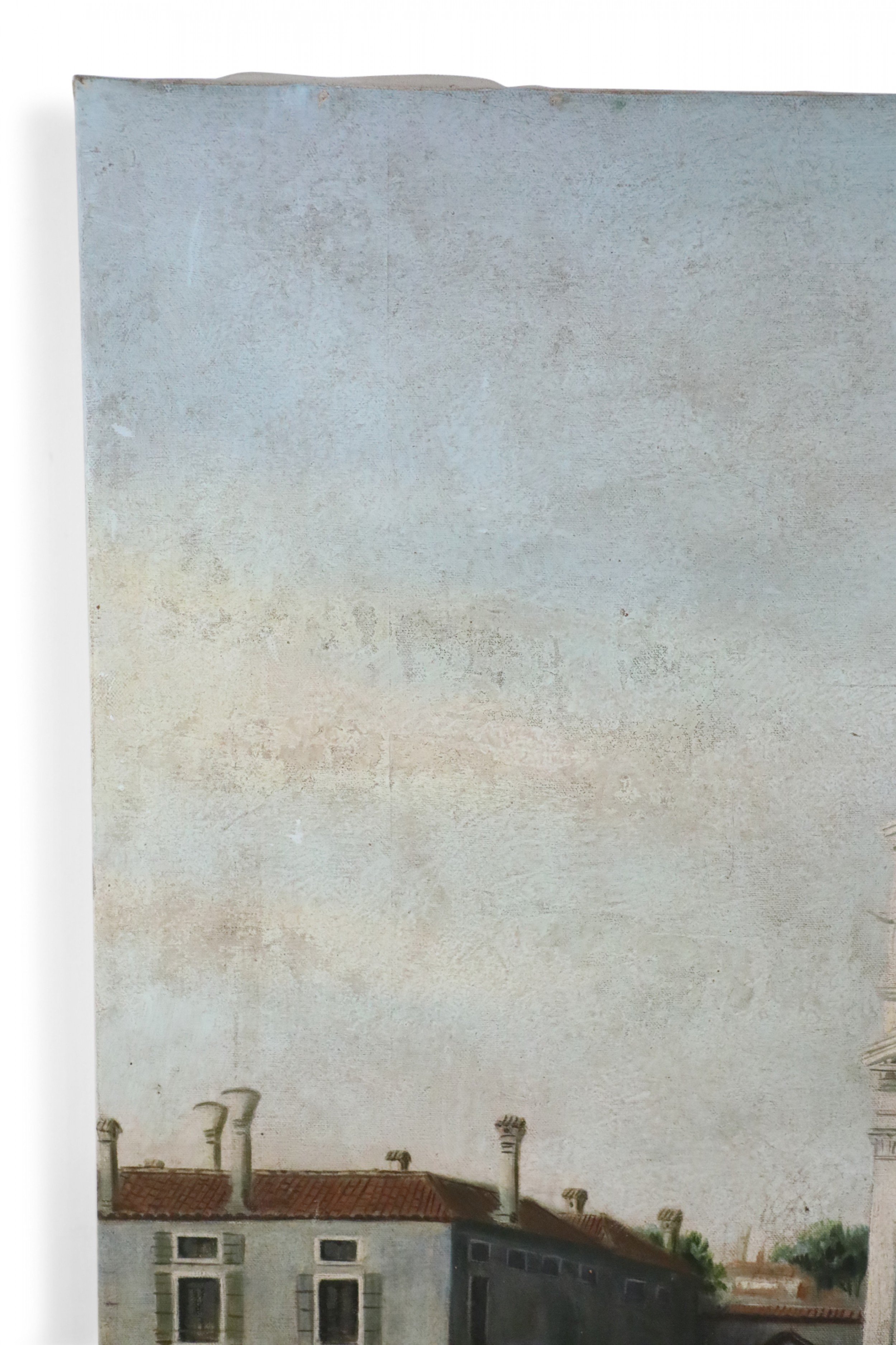 Italian Venetian-Style (20th Century) painting of a white classical, domed church, resembling the Church of San Giorgio Maggiore, directly on a canal filled with gondolas in transit. Painted on unframed, rectangular canvas..