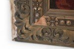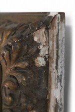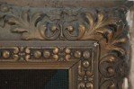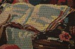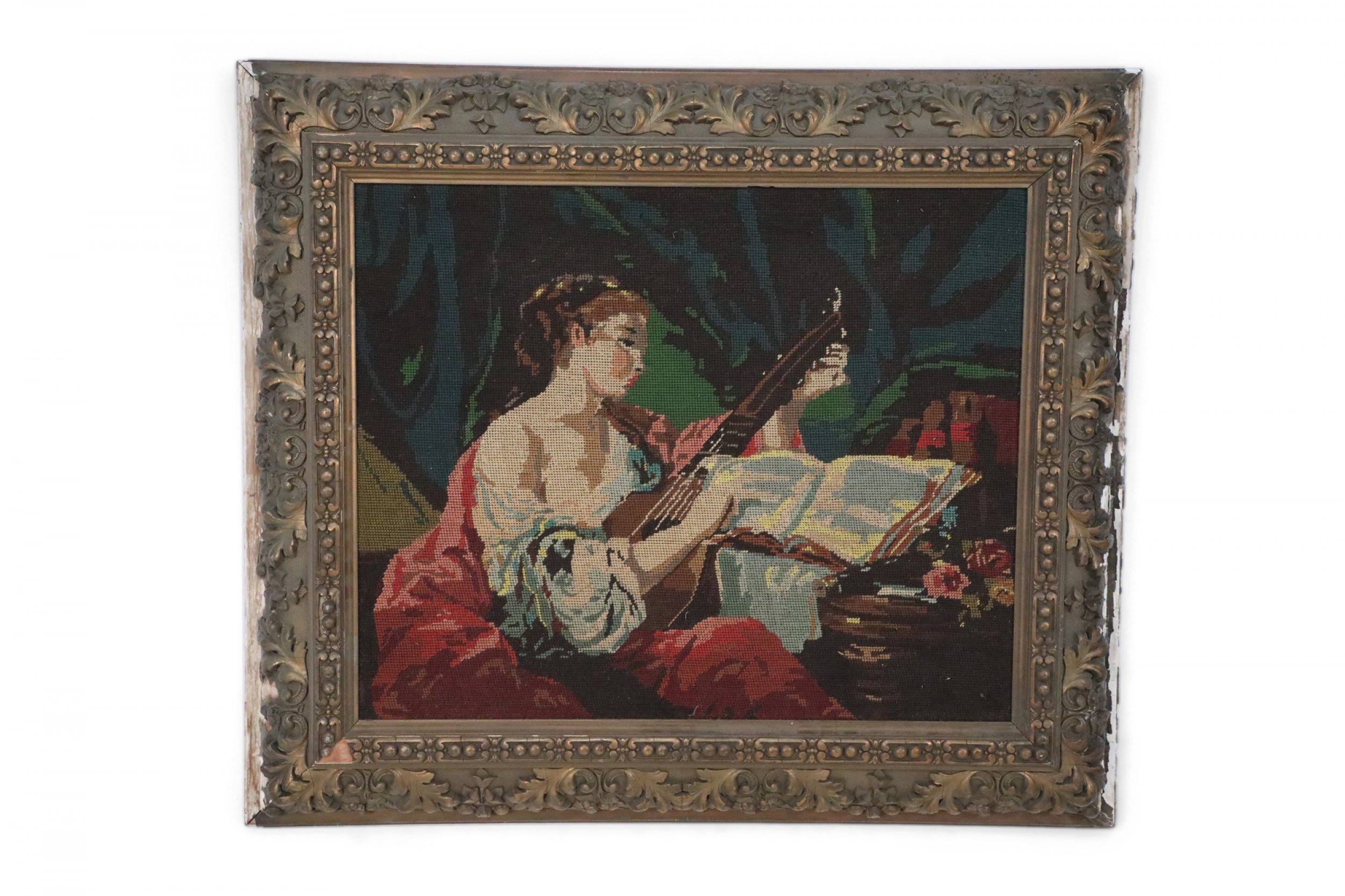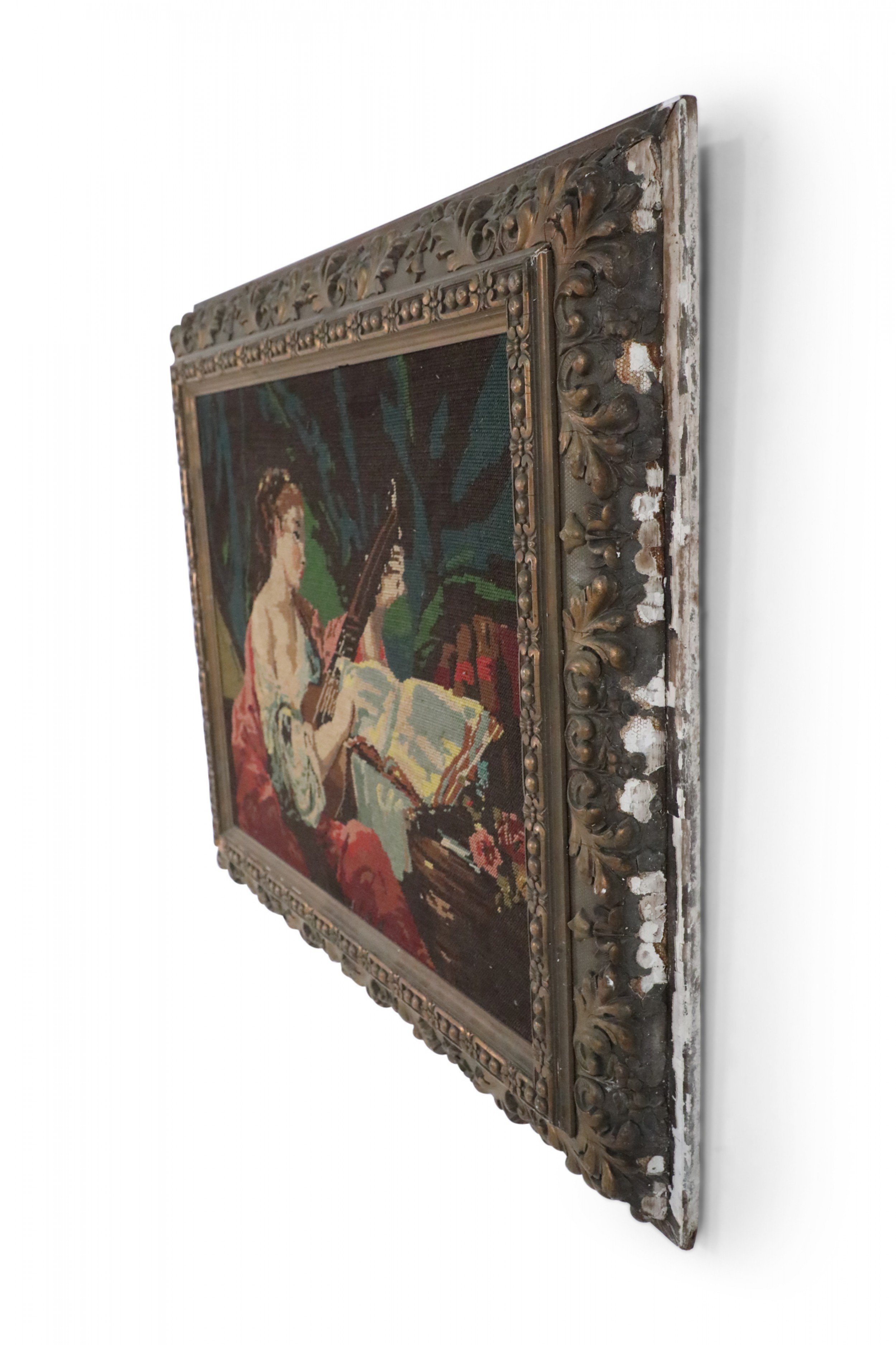Vintage (20th Century) tapestry featuring a woman playing a lute, alongside an open book and flowers, set in a wooden, bronze-finished frame carved with acanthus leaf designs.