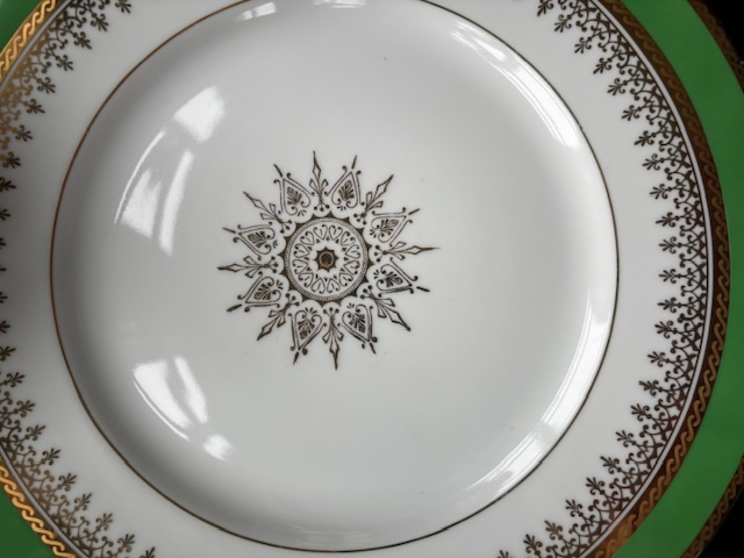 SET of 12 Continental Neo-classic style white and green-bordered porcelain dinner plates with gold trim and a centered sunburst design (Czechoslovakia) (PRICED AS SET).