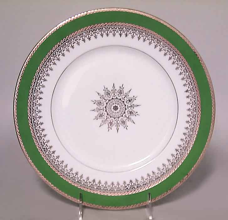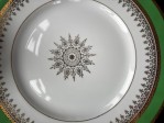 SET of 12 Continental Neo-classic style white and green-bordered porcelain dinner plates with gold trim and a centered sunburst design (Czechoslovakia) (PRICED AS SET)