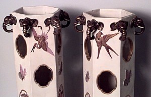 PAIR of English Regency style (19th Cent) hexagonal shaped beige porcelain vases with elephant heads and decorated with frogs and herons (PRICED AS PAIR).
