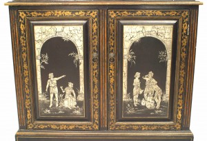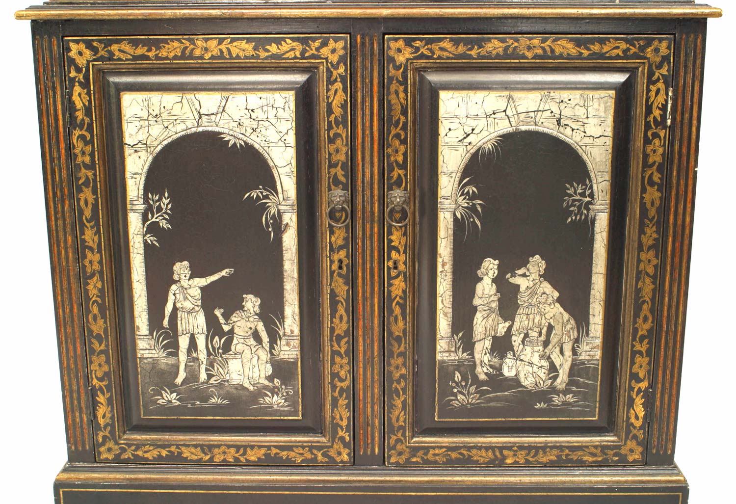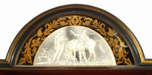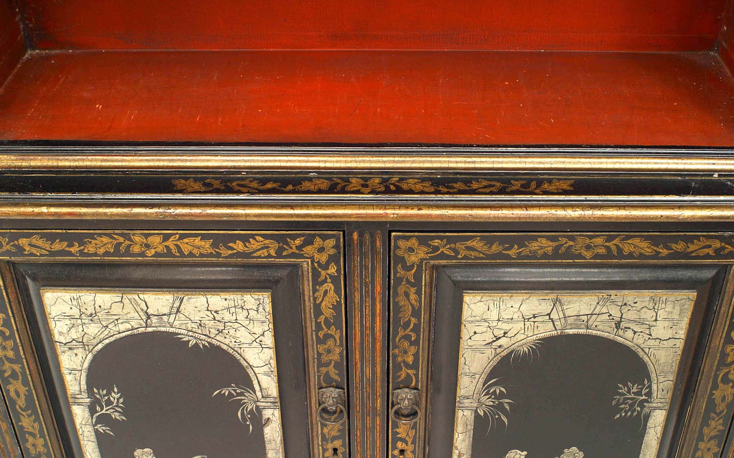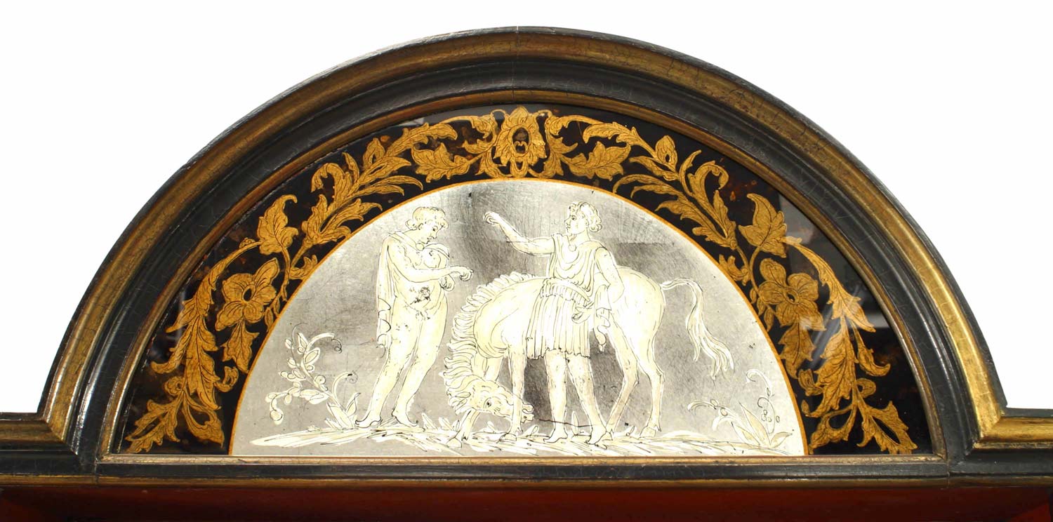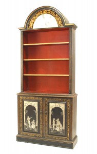 Style: English Materials & Techniques: Glass, lacquered, pediment, stenciled Category: Cabinets & Case Goods, Office/Library