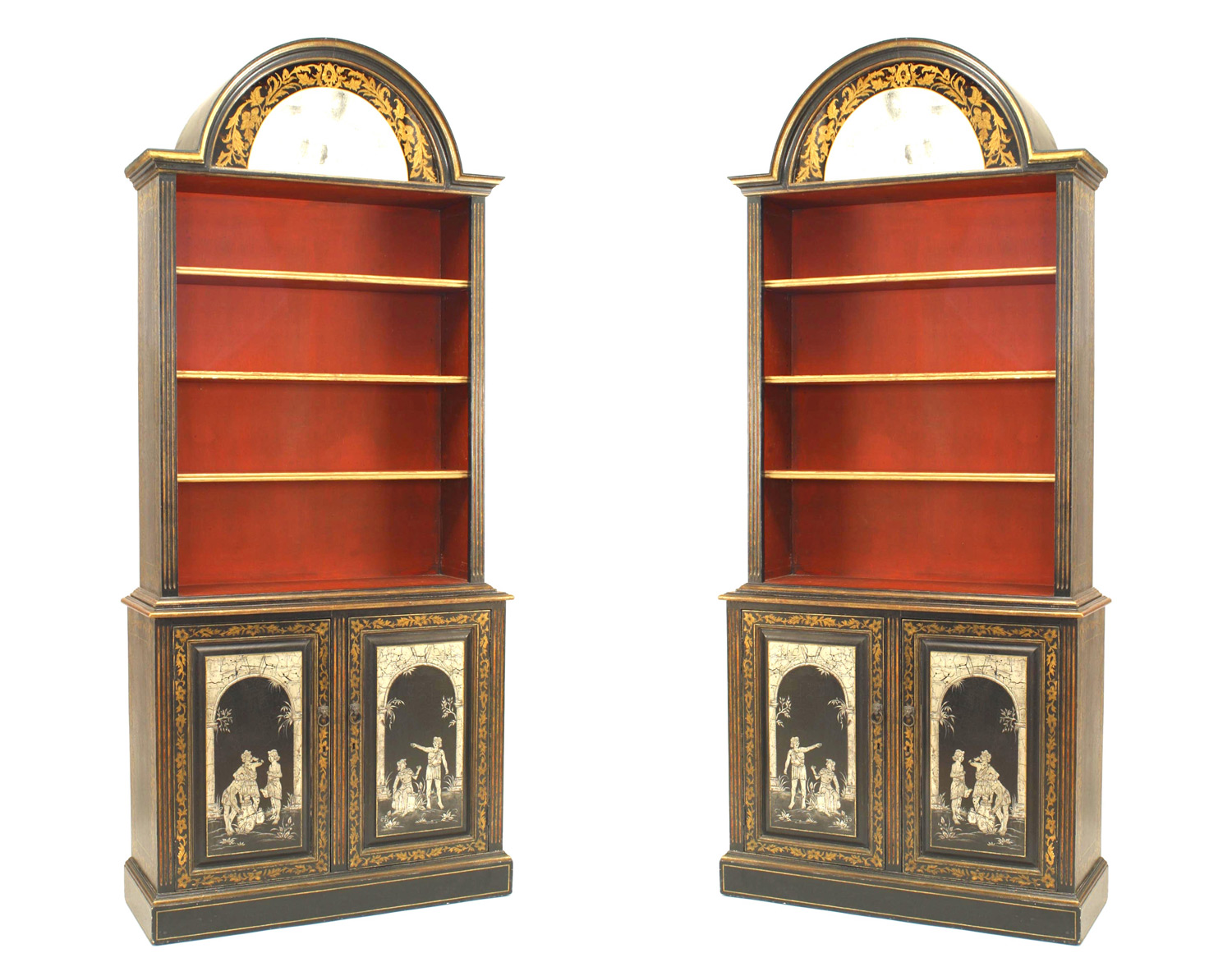 PAIR of English Adam-style (20th Century) black lacquered and gilt trimmed Neo-classic bookcases with 3 shelves centered between 2 lower doors and pediment top.all having egomise decorated glass (PRICED AS PAIR).