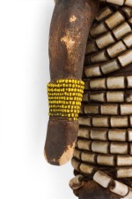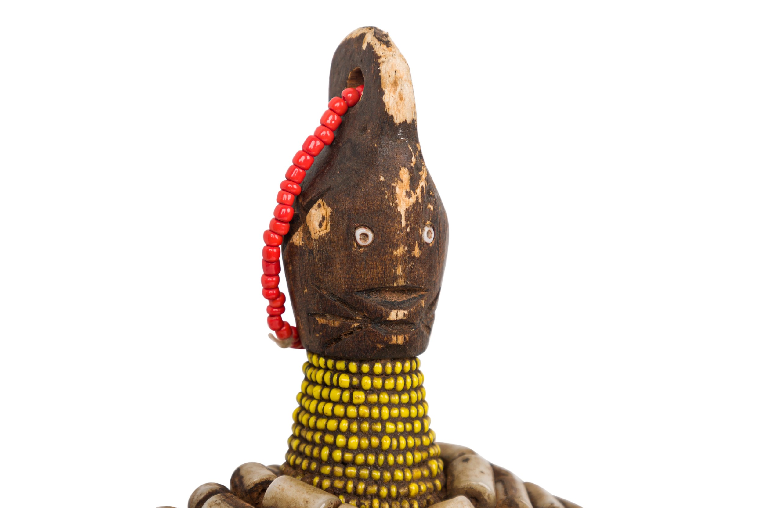 African Cameroon 20th Century carved wood Namur female fertility doll in a stylized curved form, wrapped with white, yellow & red beaded necklaces.
