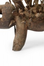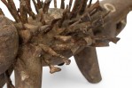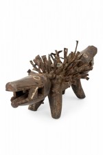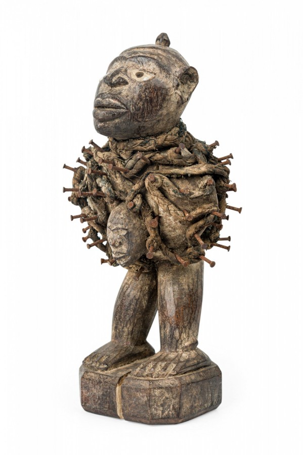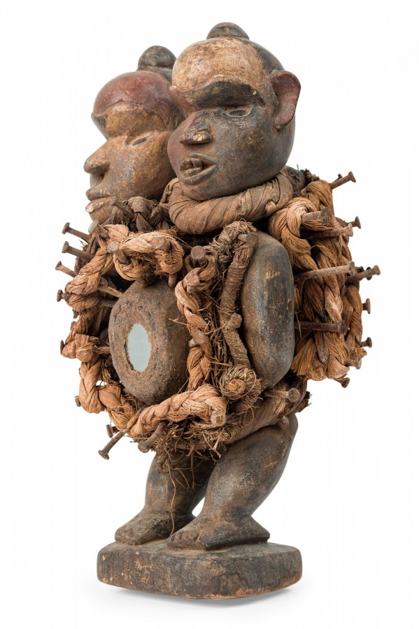 African Democratic Republic of Congo 20th Century carved wood nail fetish figure in 2-headed dog form ("Nkisi Koso"), its torso wrapped with rope entwined around embedded metal nails, open fanged mouth, small inlaid circular glass disc at the center top standing on 4 tapered legs. The dog is thought to be the mediator between the natural and spiritual world, having four eyes, manifested in this 2-headed statue. (Similar items: NWL6885, NWL6886, NWL6884, NWL6887, NWL6888, NWL.