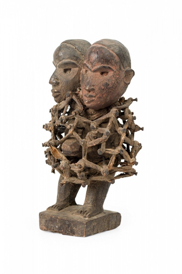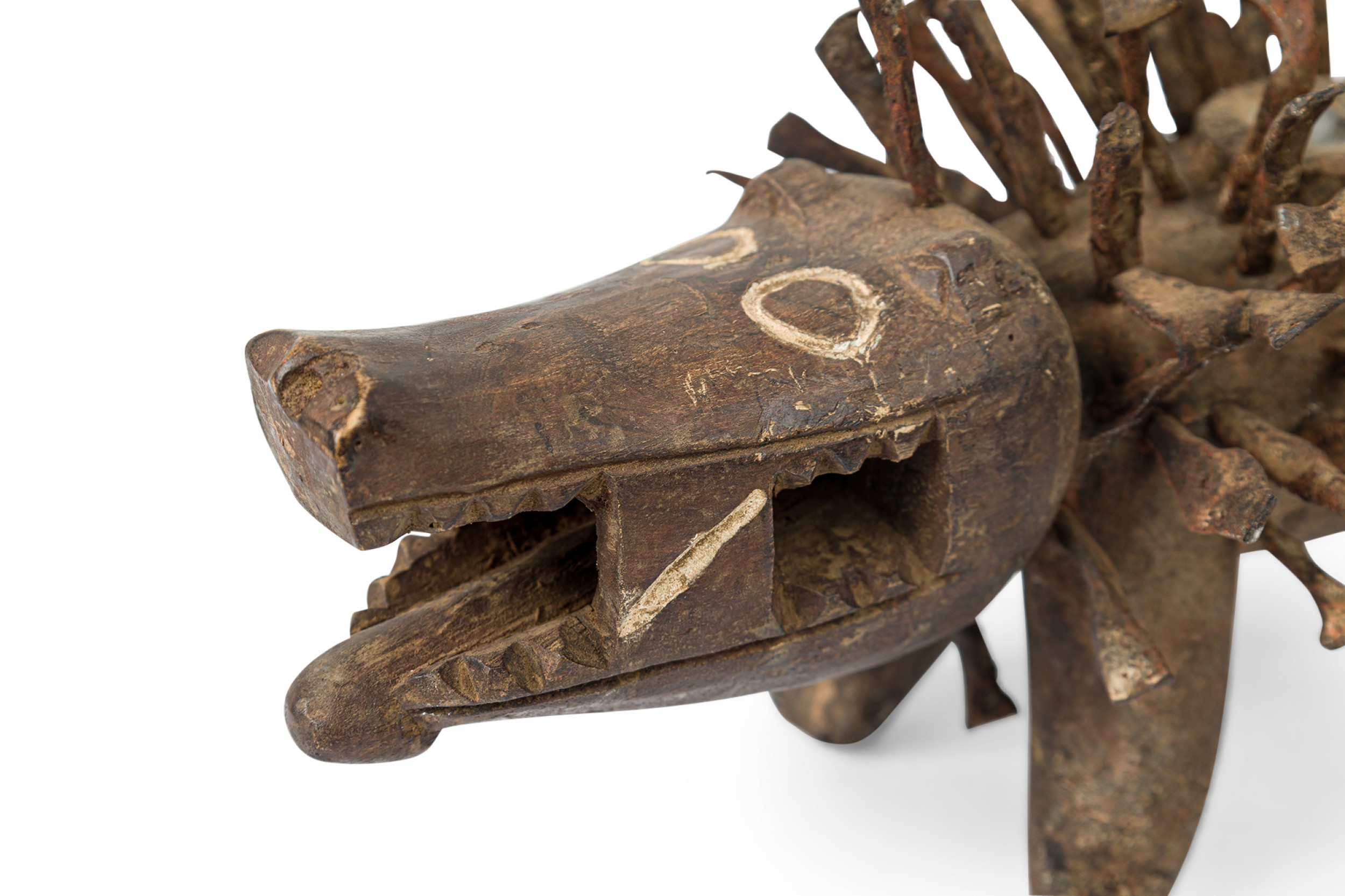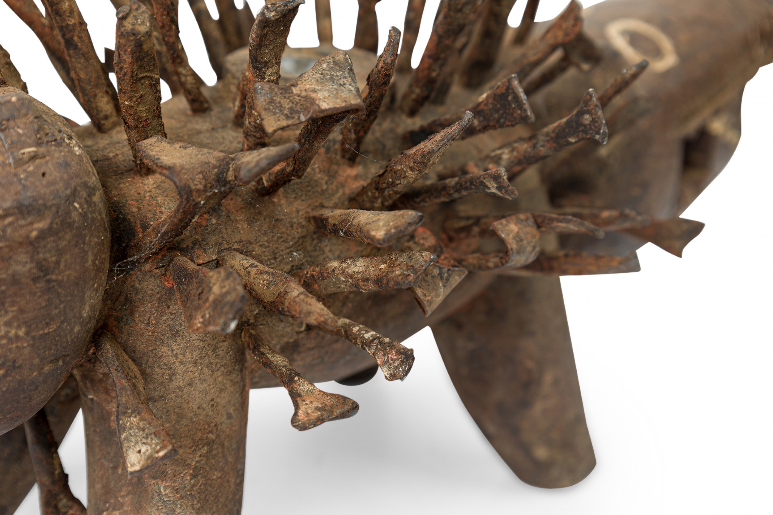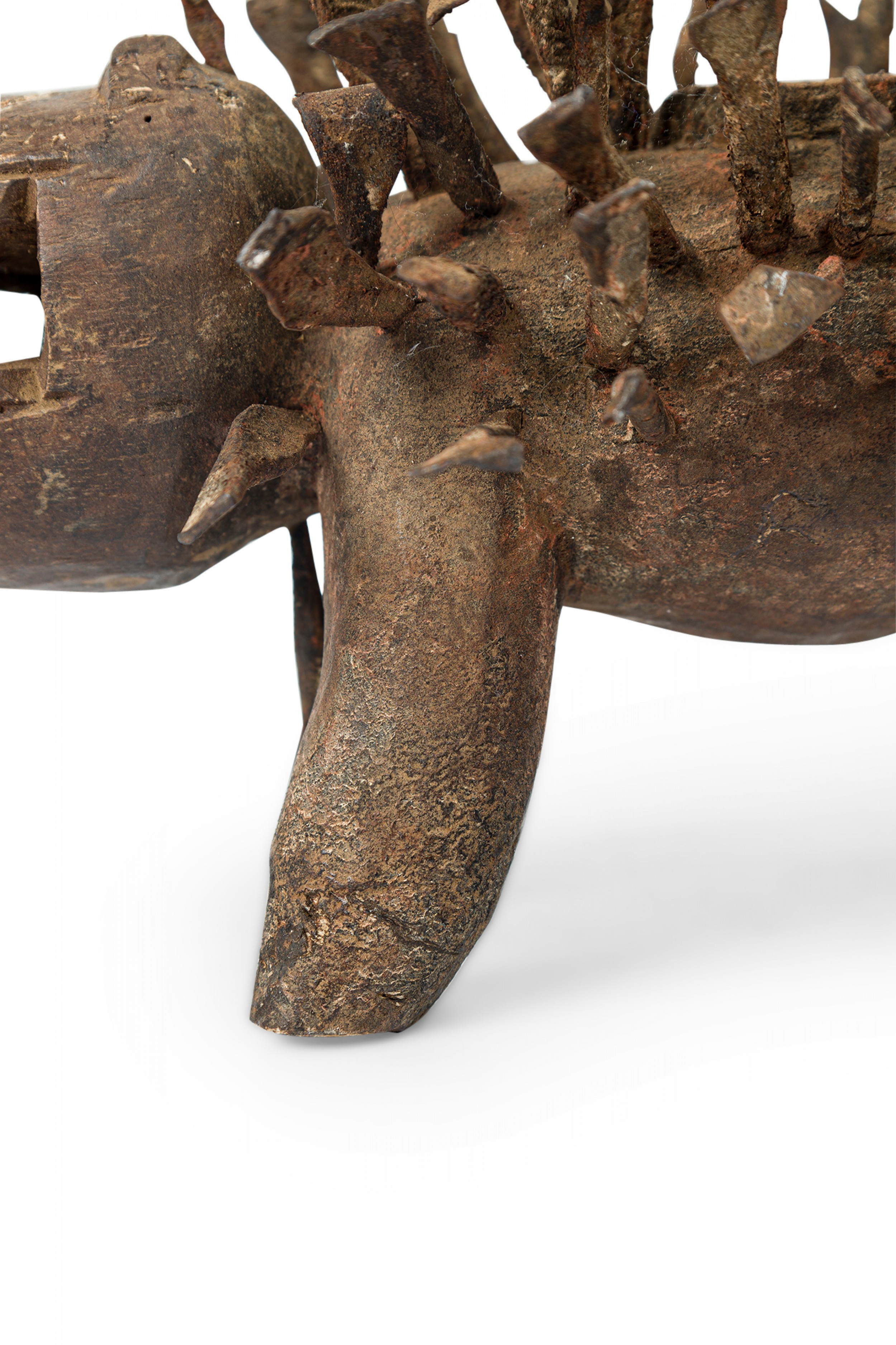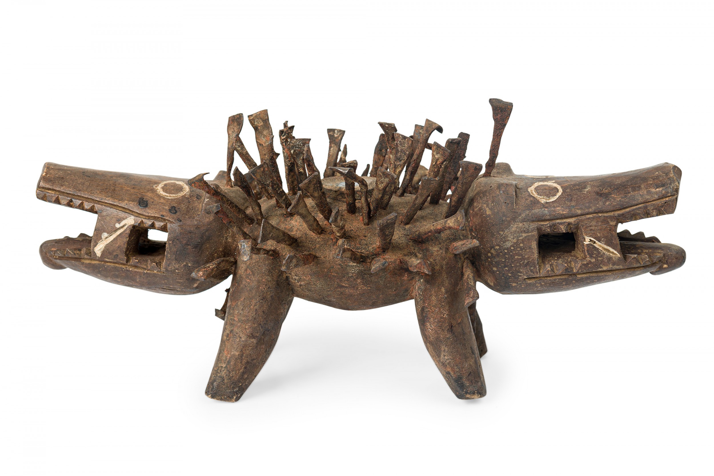 African D.R. Congo 20th Century Carved Wood Nkisi Koso 2-Headed Dog Nail Fetish Figure