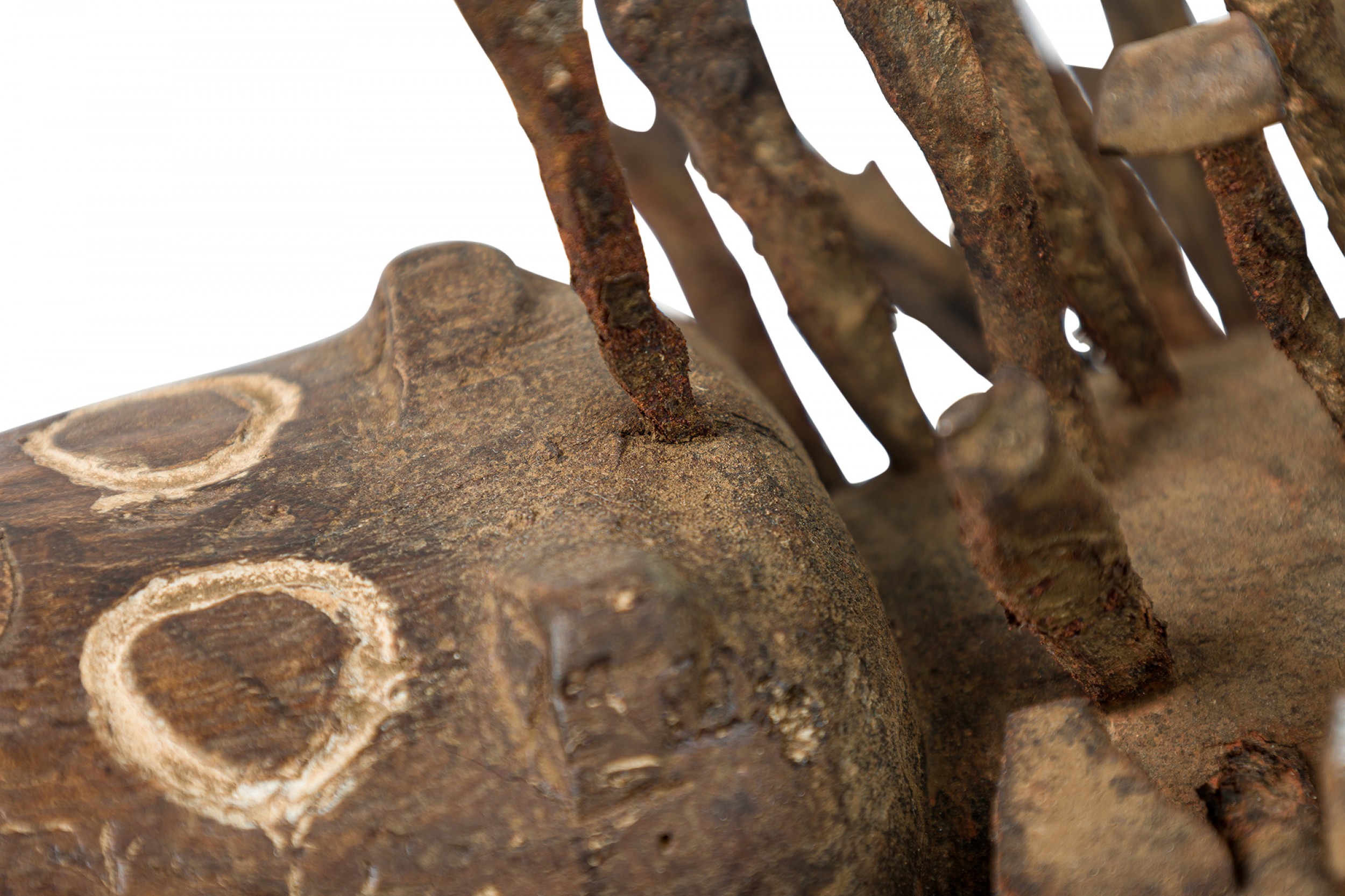 African Democratic Republic of Congo 20th Century carved wood nail fetish figure in 2-headed dog form ("Nkisi Koso"), its torso wrapped with rope entwined around embedded metal nails, open fanged mouth, small inlaid circular glass disc at the center top standing on 4 tapered legs. The dog is thought to be the mediator between the natural and spiritual world, having four eyes, manifested in this 2-headed statue. (Similar items: NWL6885, NWL6886, NWL6884, NWL6887, NWL6888, NWL