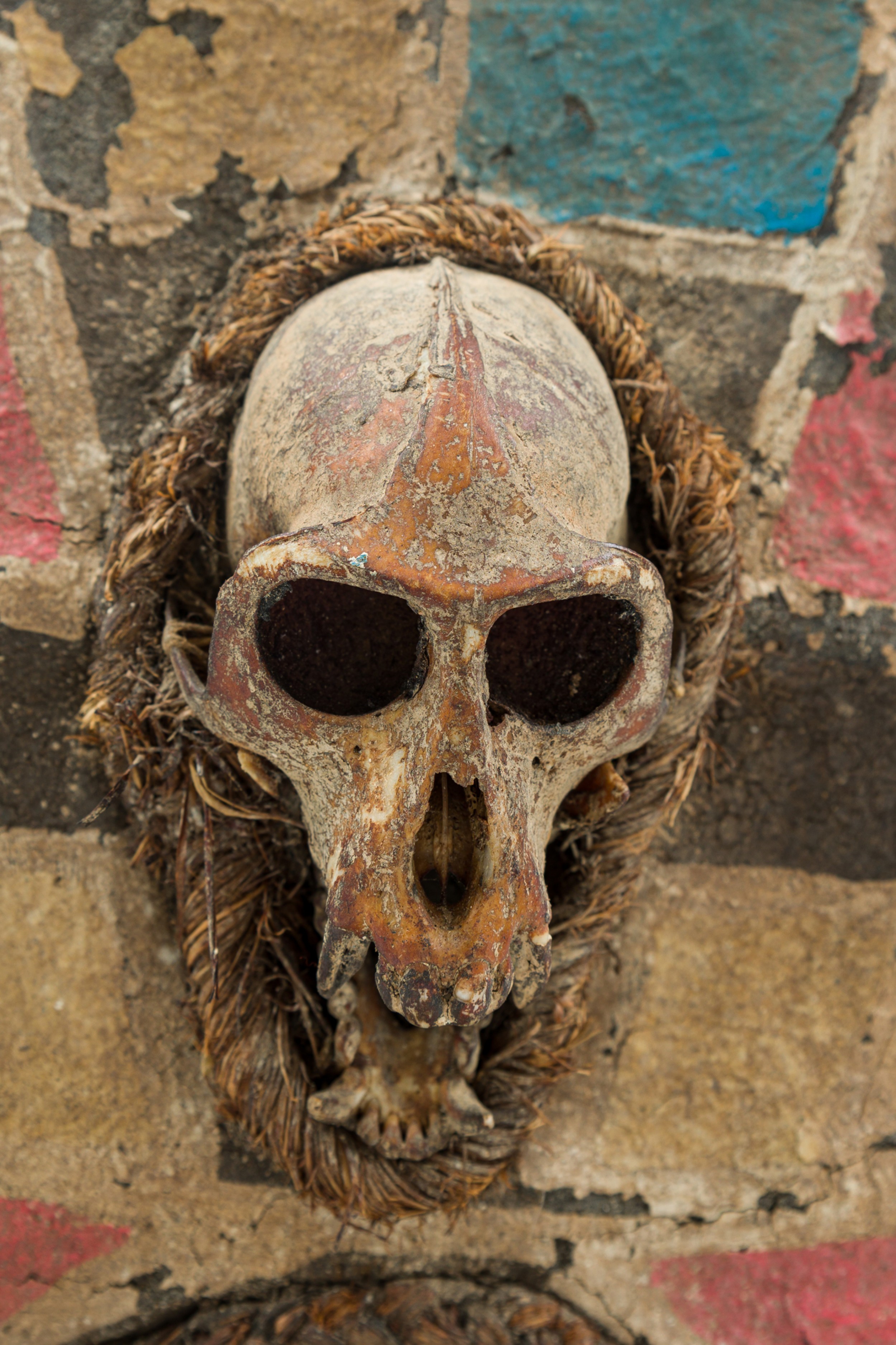 African Gabon Late 20th Century Carved & Painted Wood Fang Headdress Mask with Monkey Skull