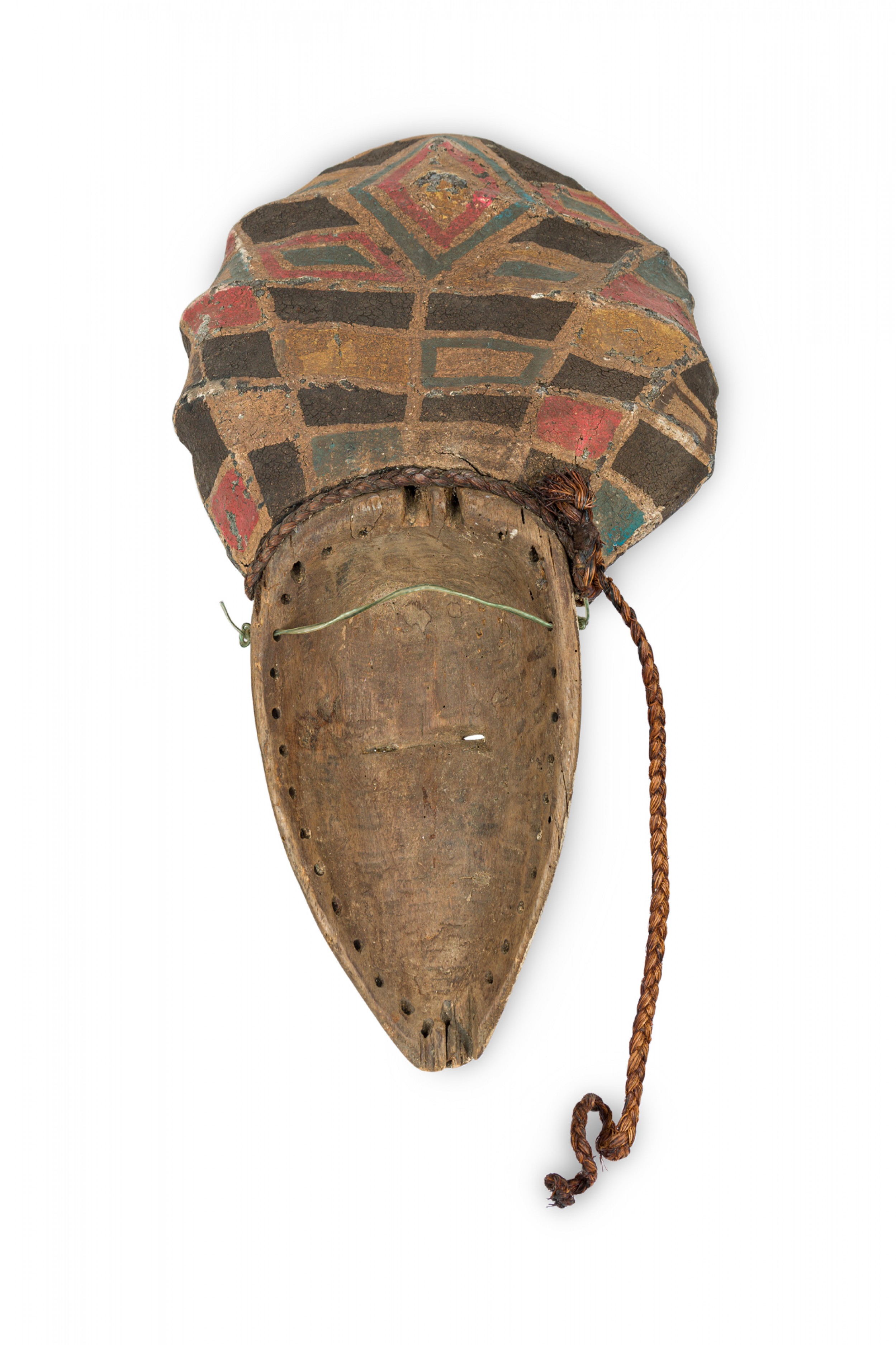 African Gabon Late 20th Century (1990s) carved wood Fang ceremonial mask features a curved & tapered ovoid head with large headress including an inlaid monkey skull, a painted grid pattern in blue and red, 2 eye slits, rope inlay and irregularly spaced rim holes around the face. (Fang masks were noted as being an inspiration for Modigliani).