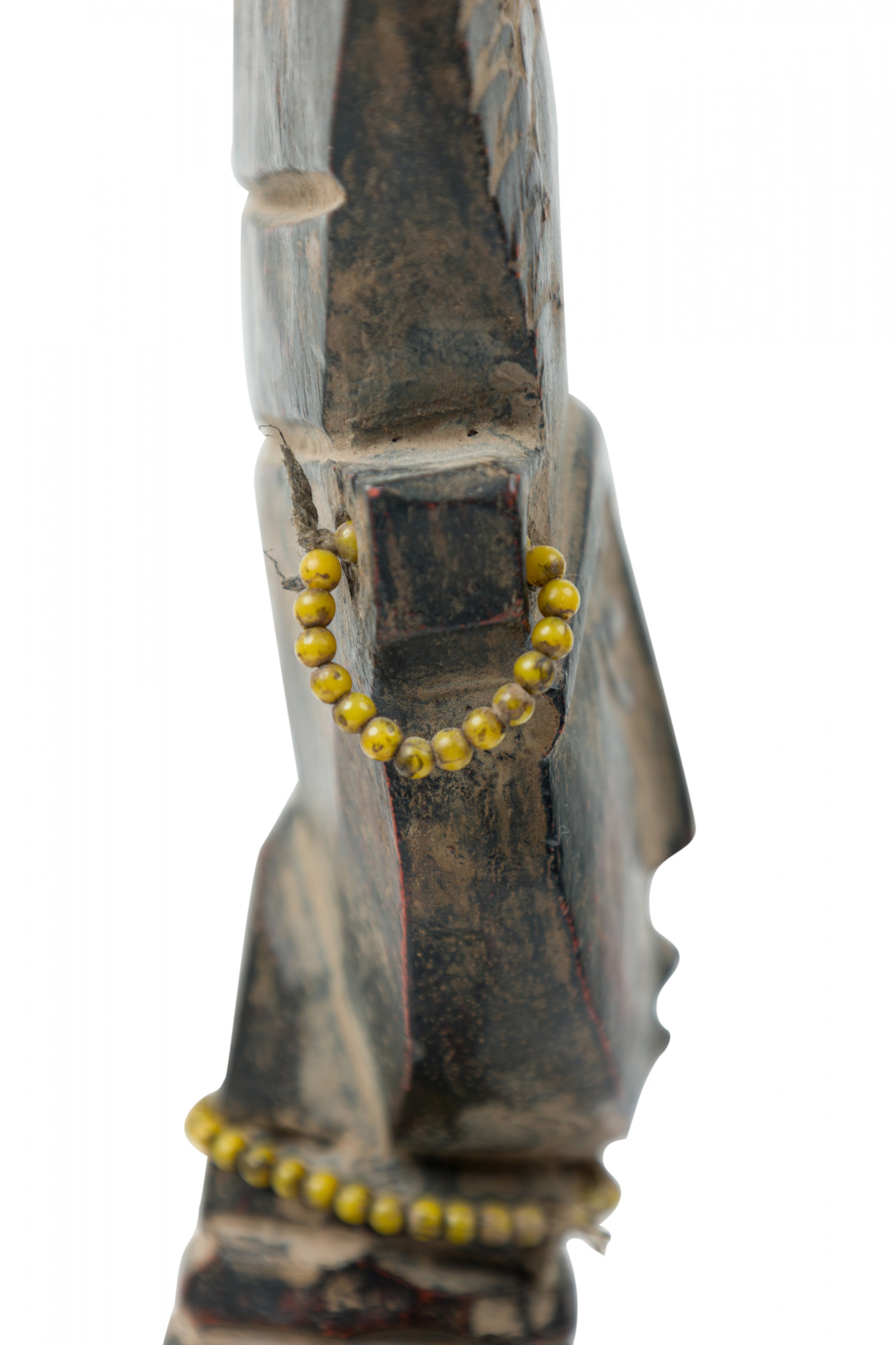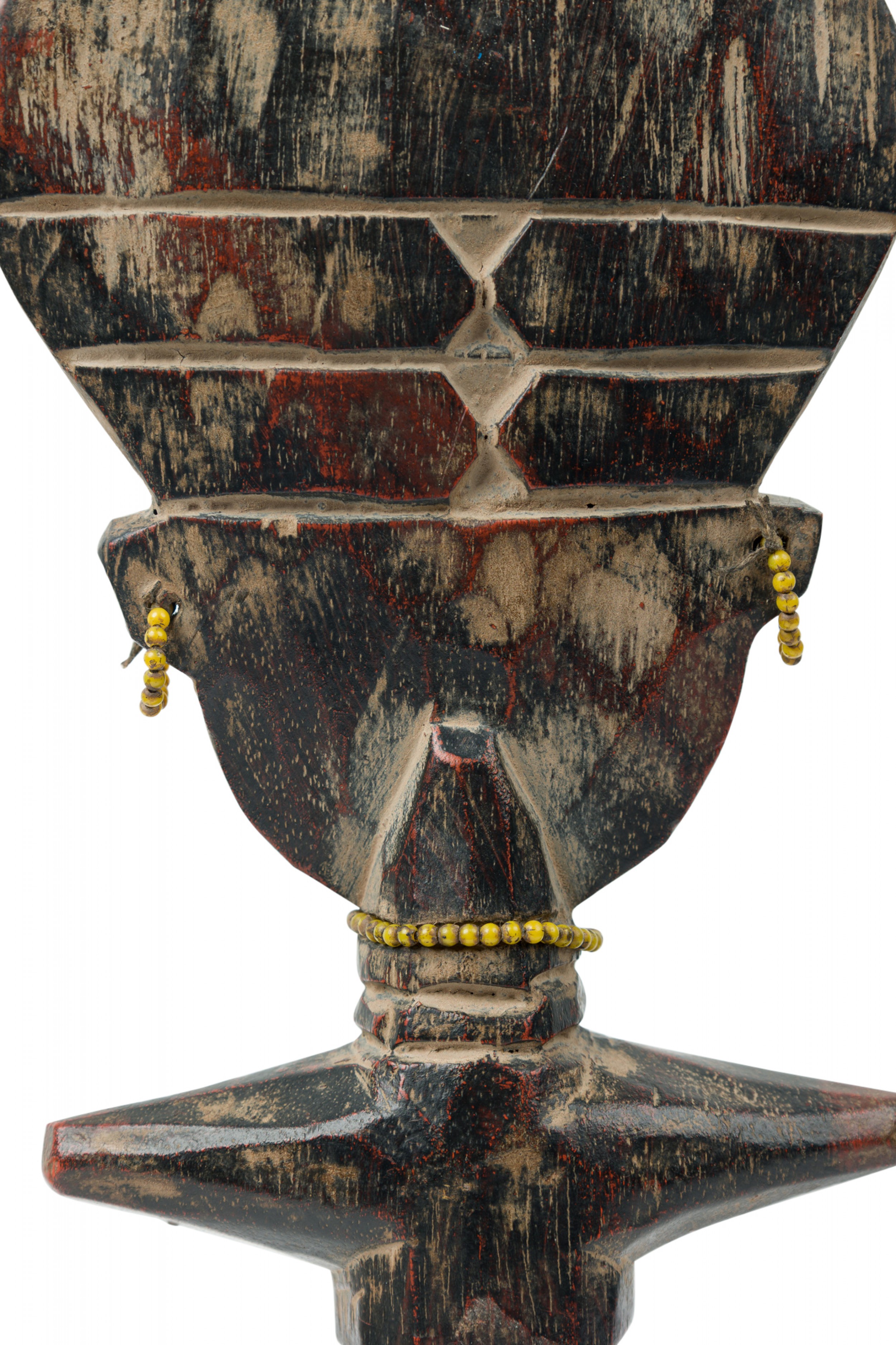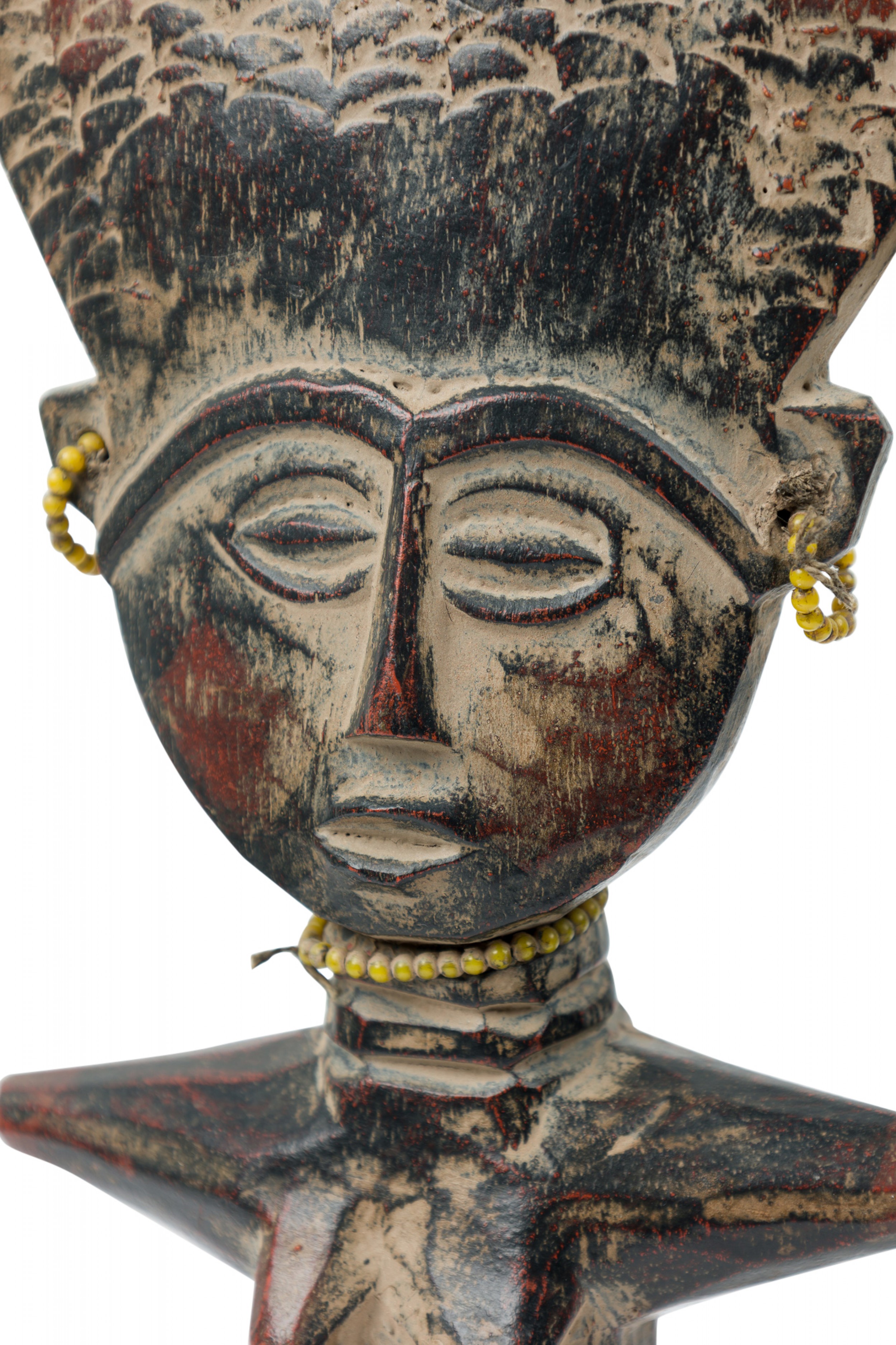 African Ghana Contemporary carved wood Ashanti fertility doll in a minimalist style features a flattened ovoid head, incised hair texture, shallow relief brow and facial features, tapered arms, cylindrical body with decorative bands plus beaded earrings and foot bracelet wrapped around the bottom.