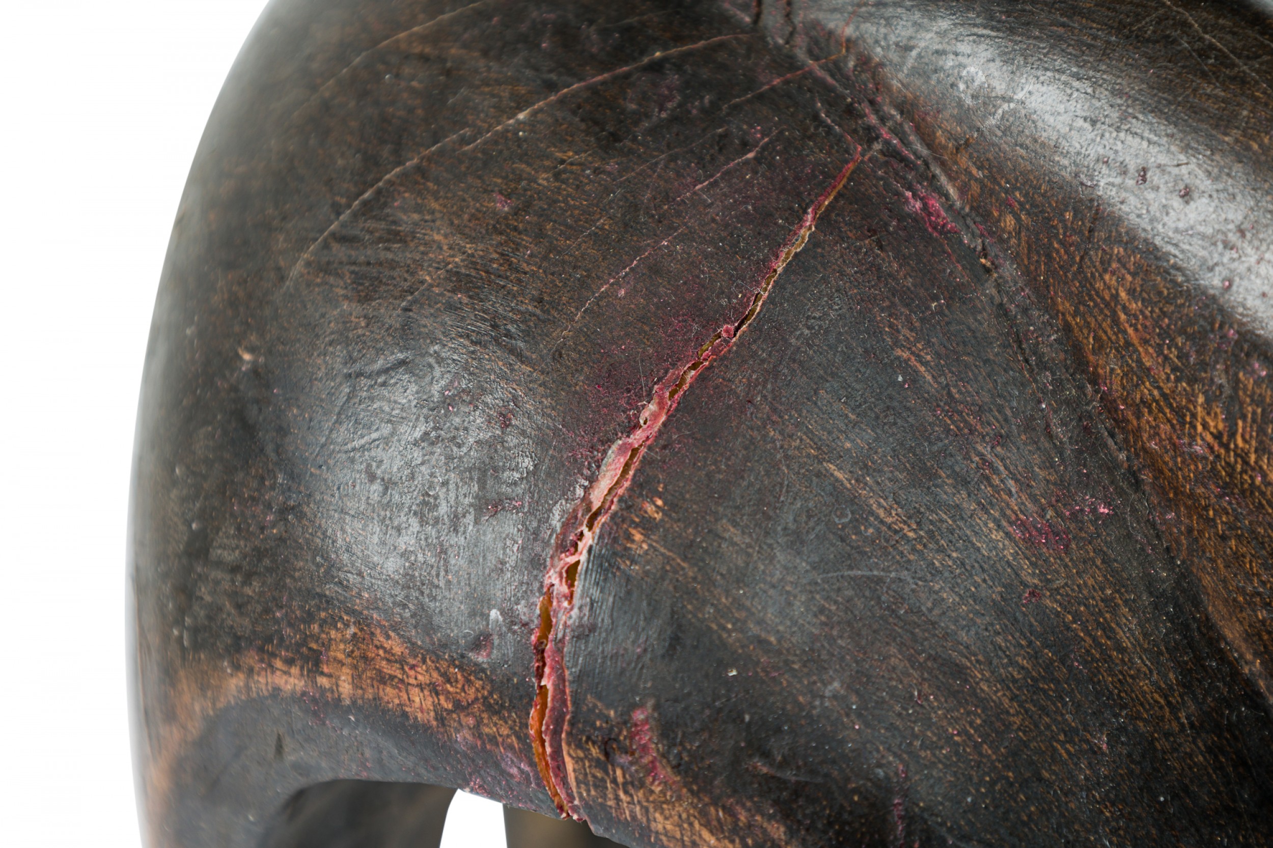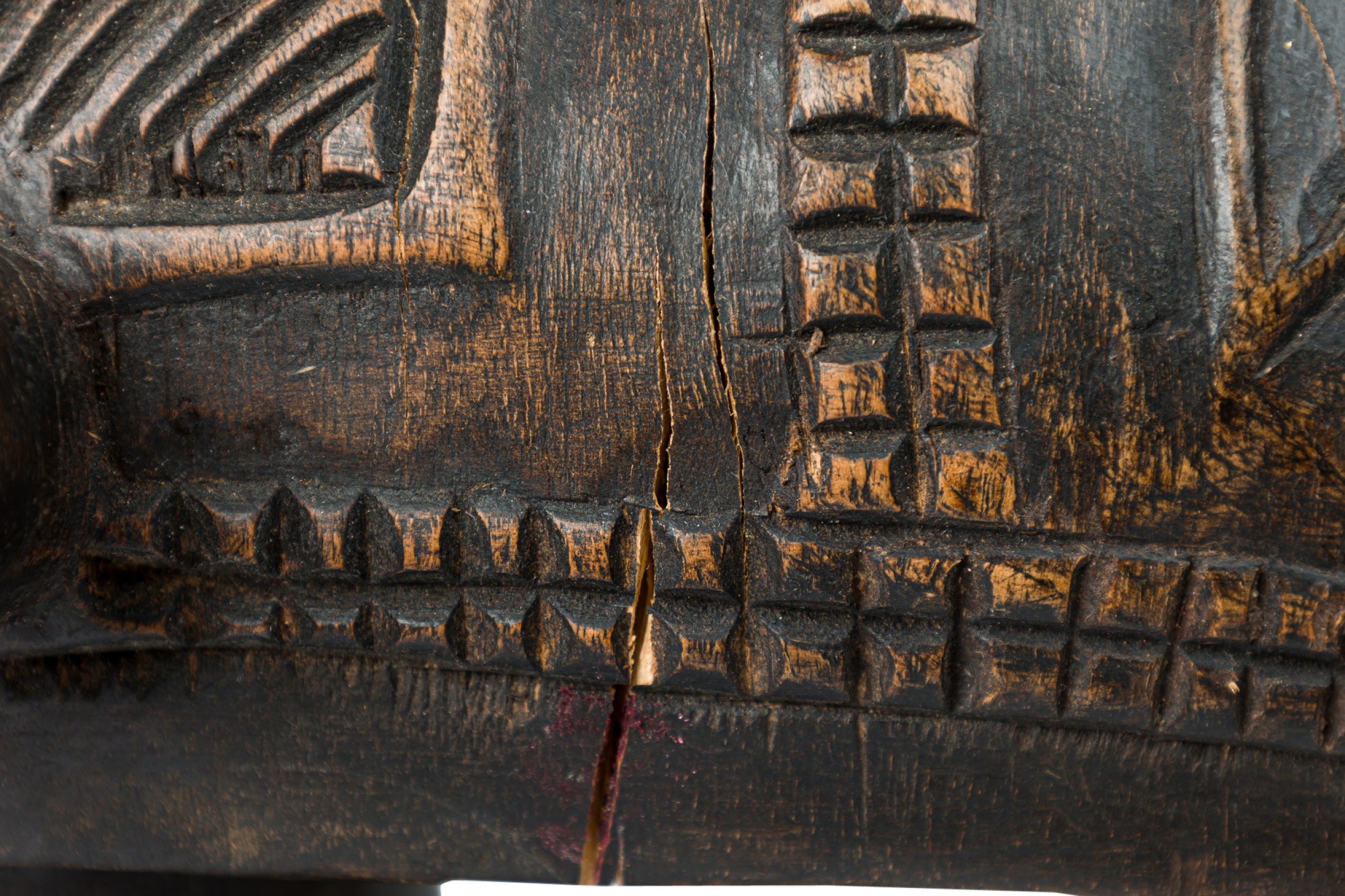 Style: Misc. Style Materials & Techniques: Carved, incised, wood Category: Cleared Art, Rugs/Textile Condition: Wear to finish, natural wood splits, some small losses Good; Wear consistent with age and use