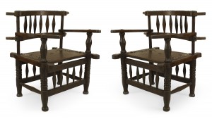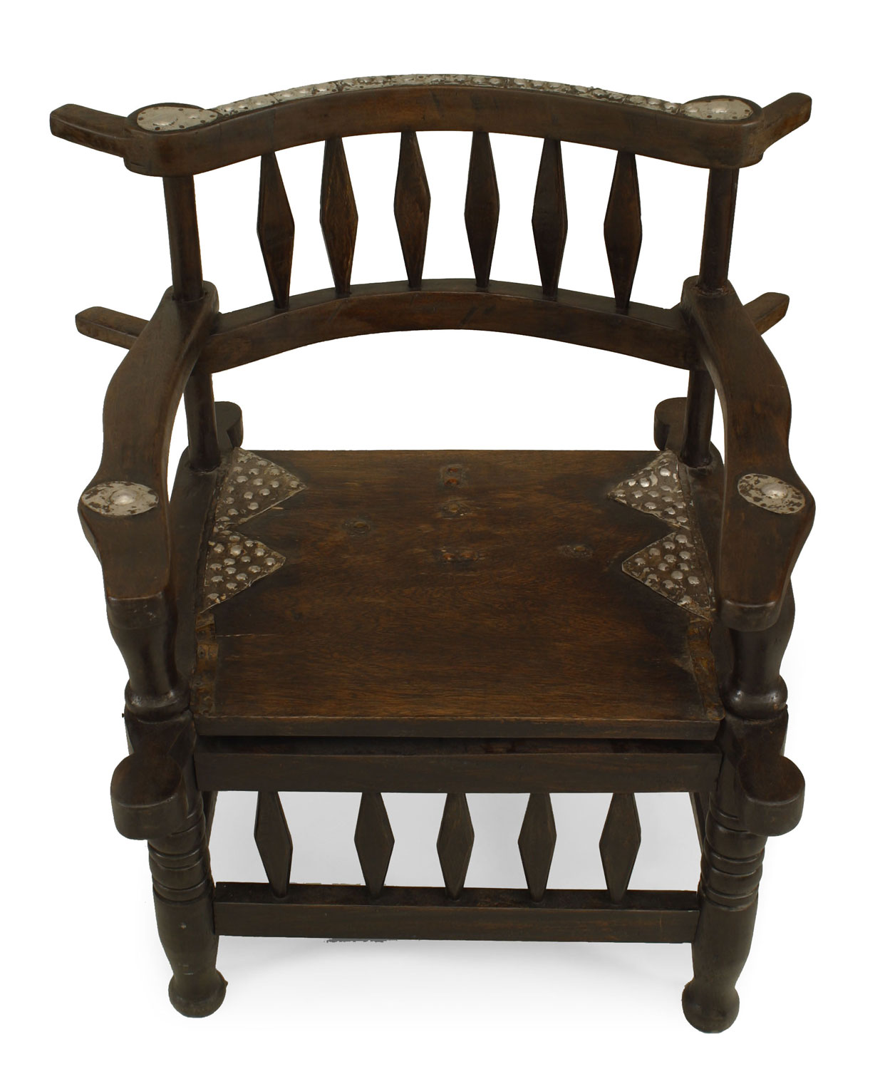 PAIR of African hardwood Armchairs with diamond design on back and stretcher trimmed with metal on arms and back.