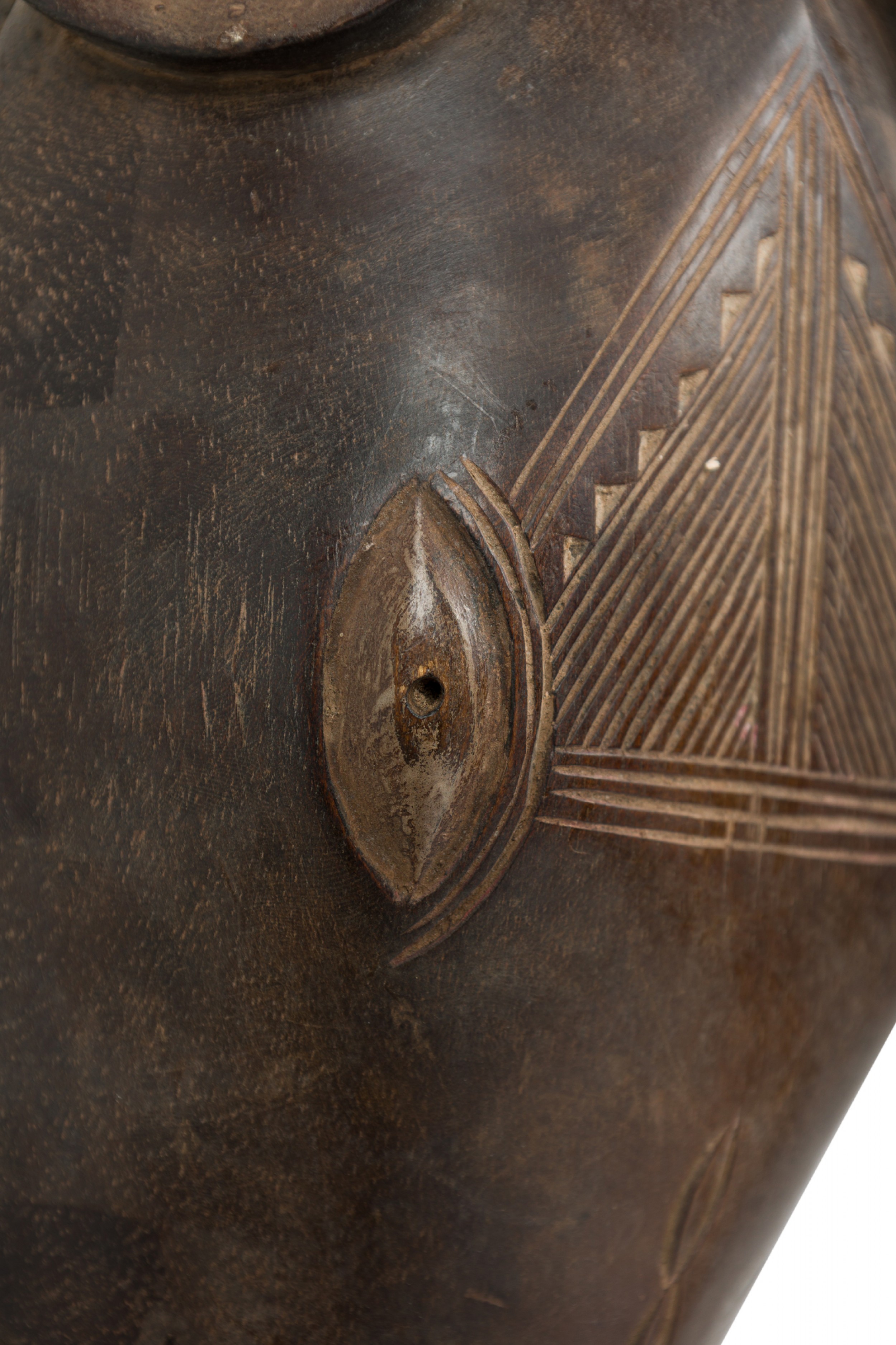 African Ivory Coast 20th Century carved wood ceremonial Goli (traditional African dance and masquerade of the Baule) face mask in elephant form with horns, incised decoration, eye and side holes, representing a clan totem animal..