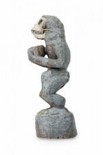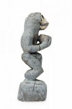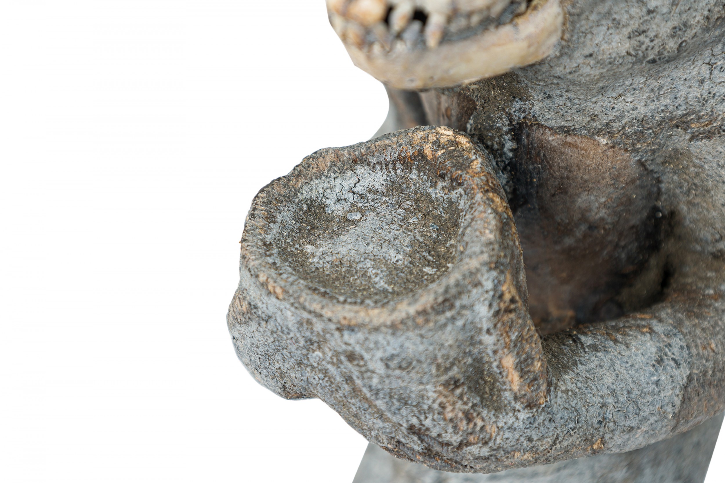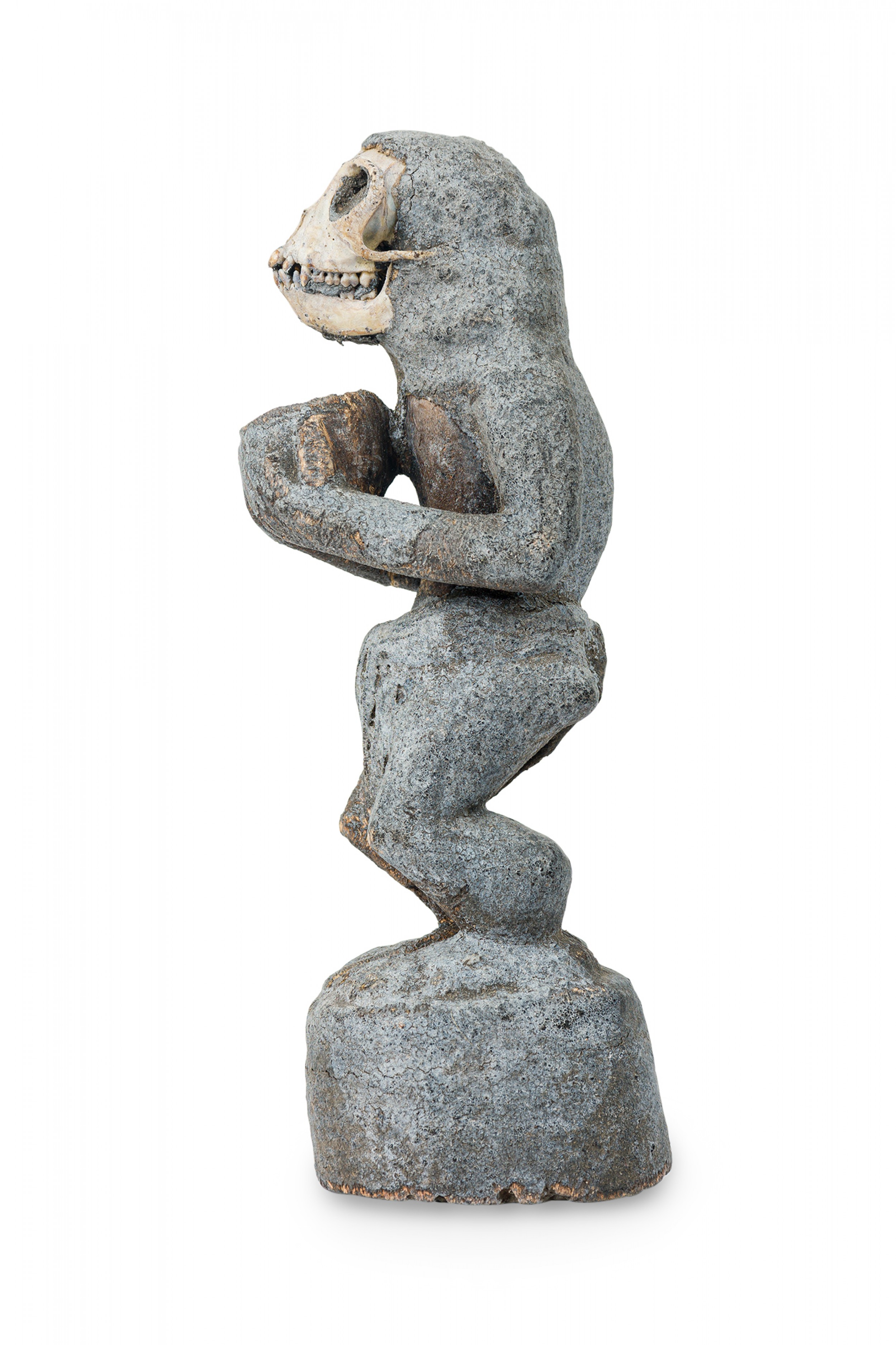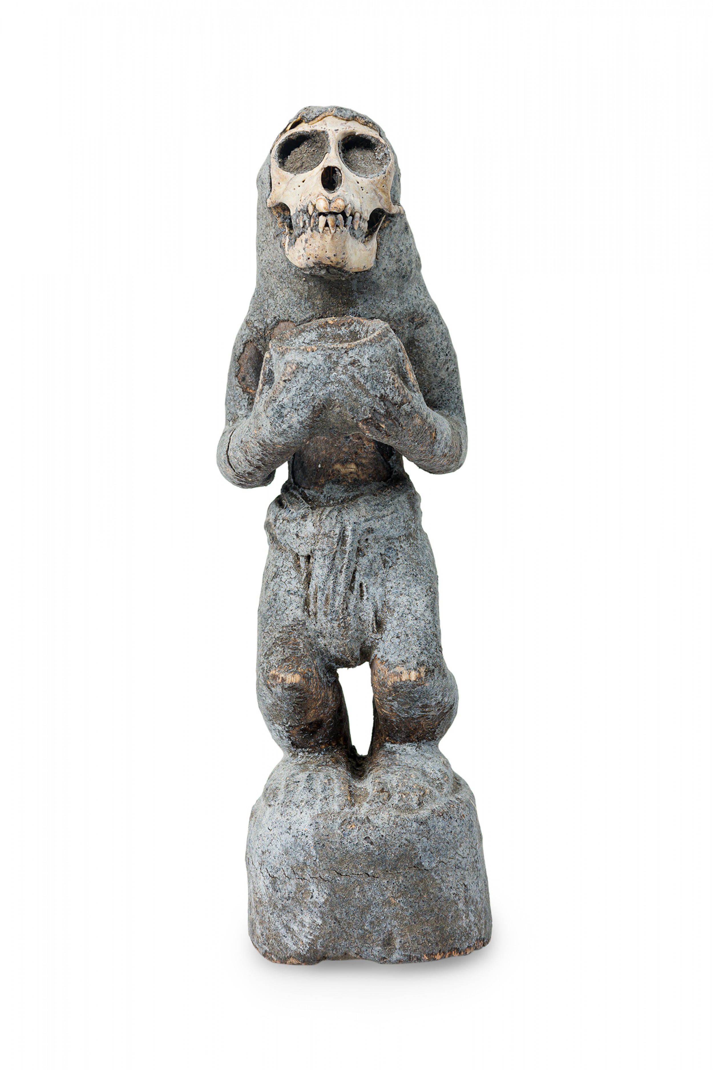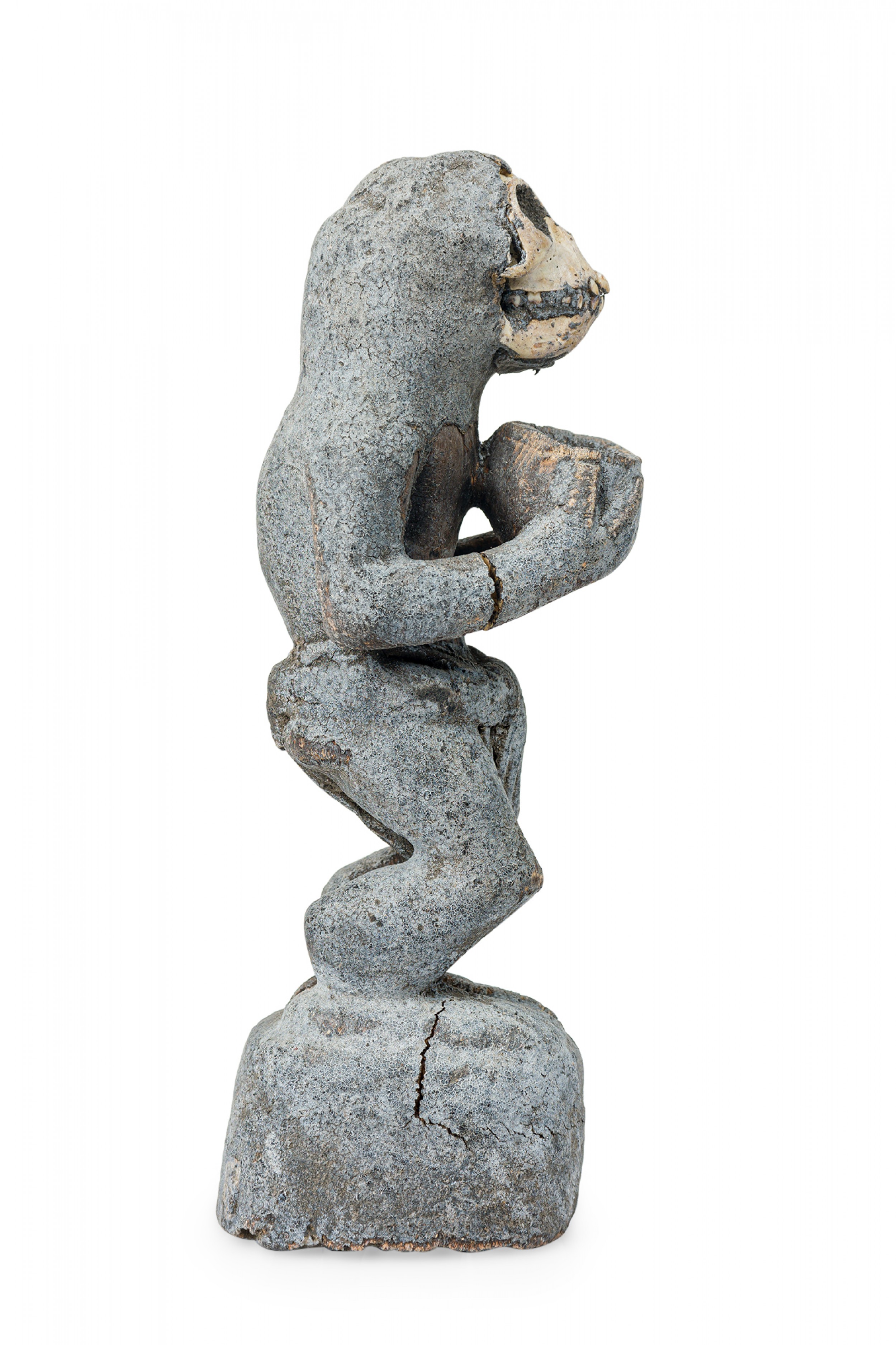 African Ivory Coast 20th Century carved wood composite monkey figure with skull, standing with bent legs, holding a ceremonial cup or bowl with both hands. (Similar item: NWL6866).