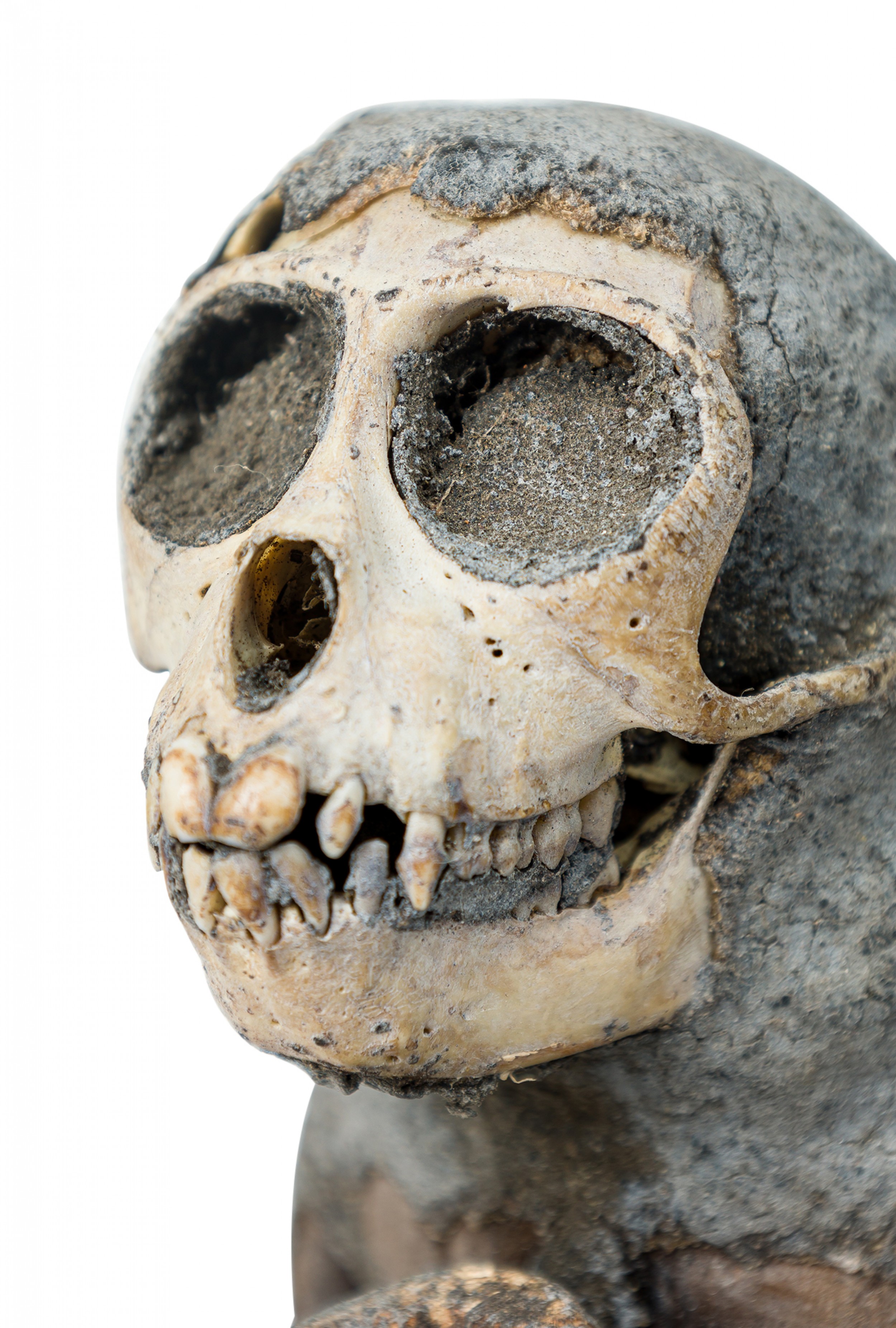 African Ivory Coast 20th Century Carved Wood Composite Baule Monkey Figure with Skull
