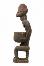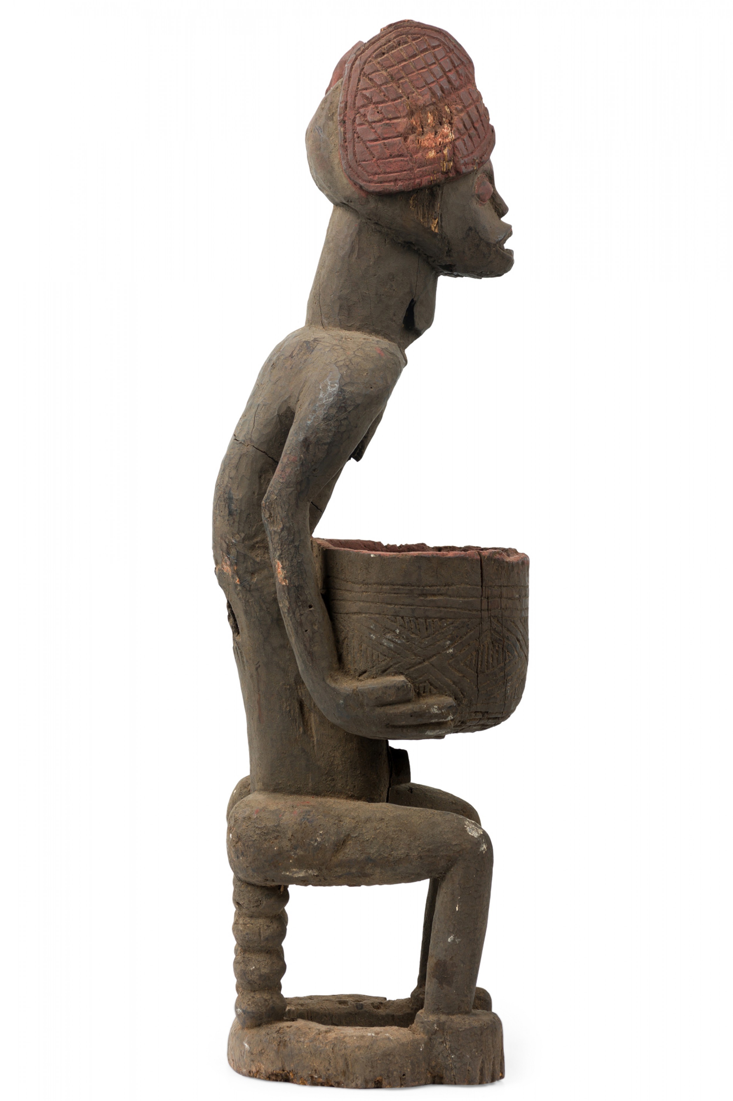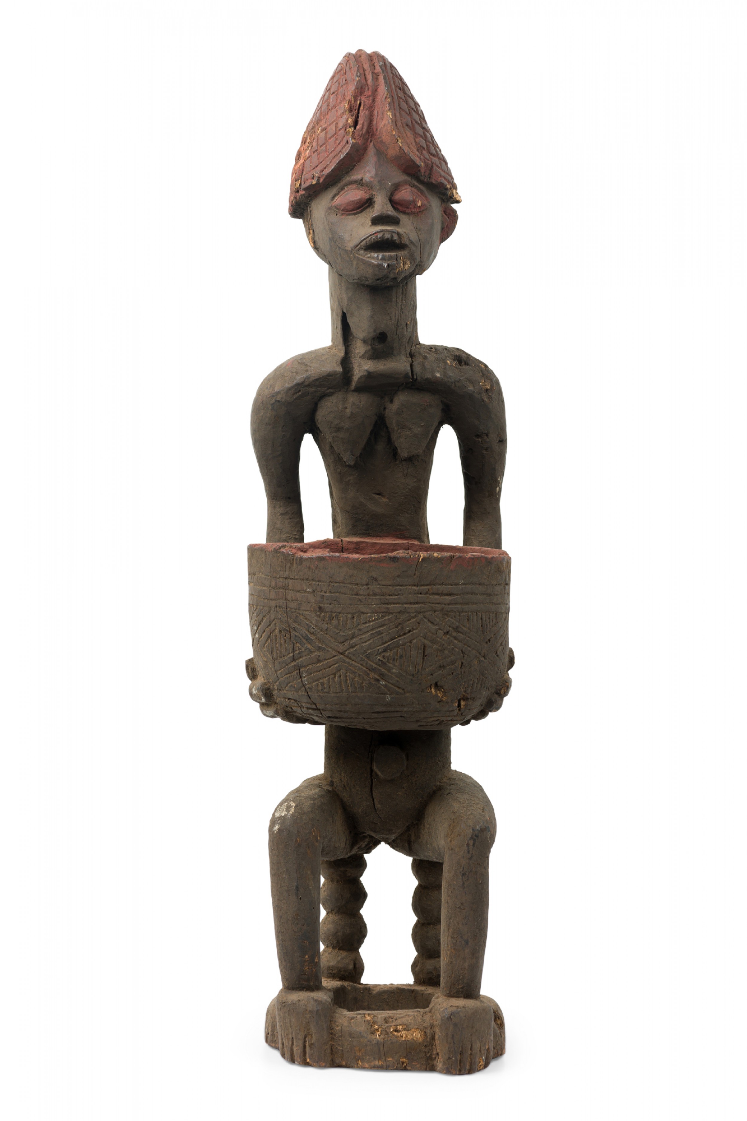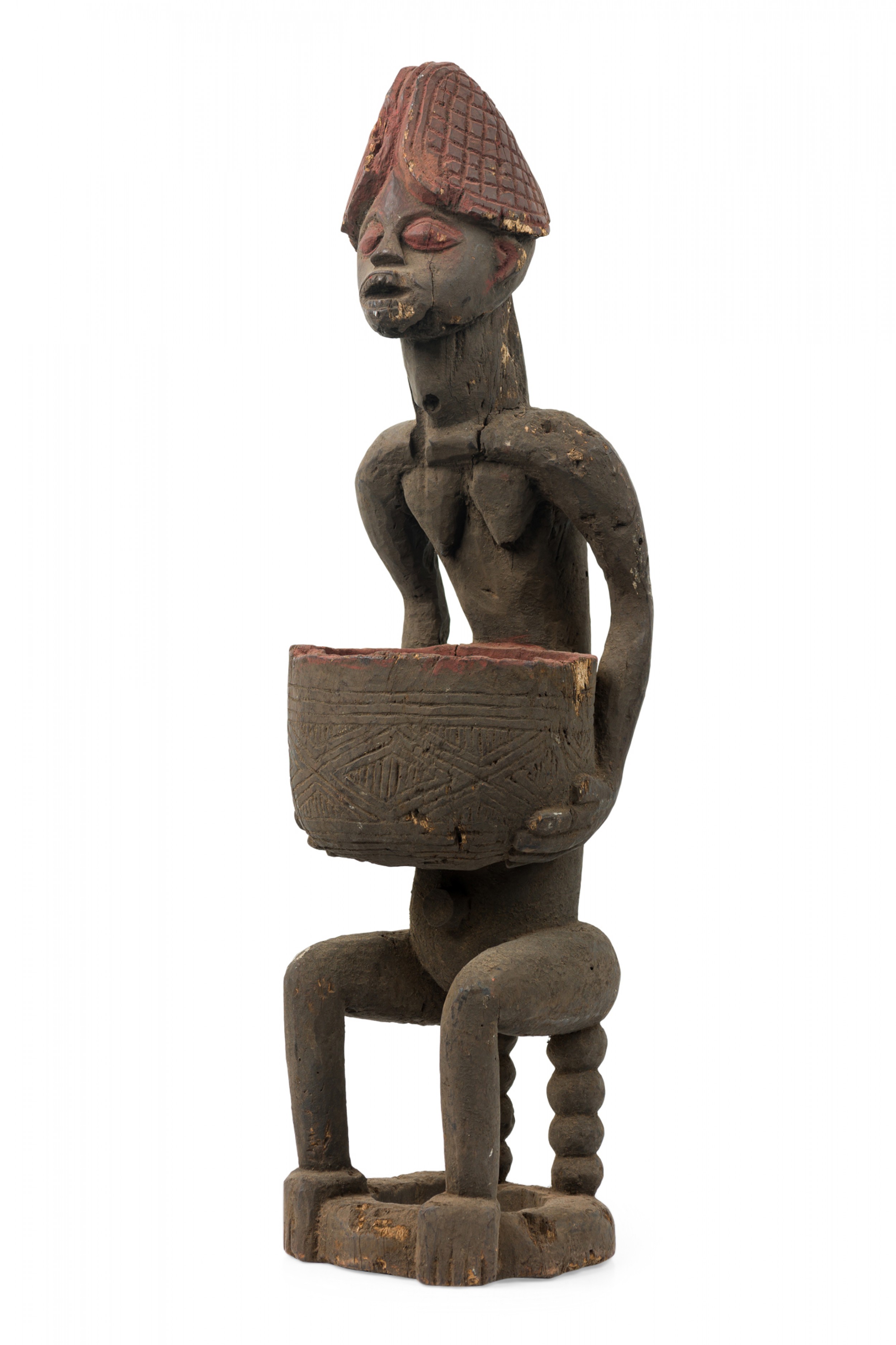African Nigeria 20th Century Carved Wood & Terra Cotta Yoruba Seated Village Female Figure with Bowl