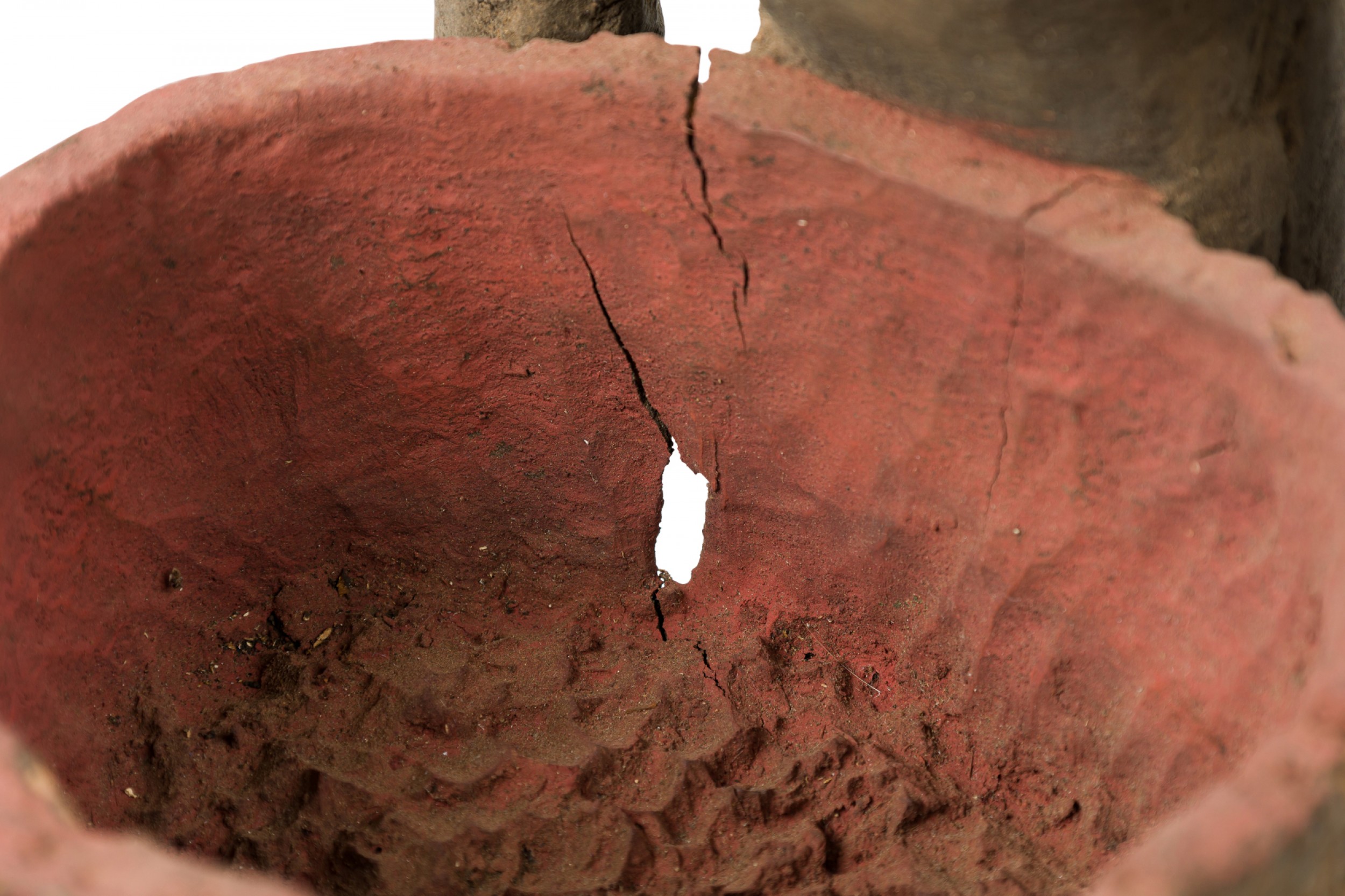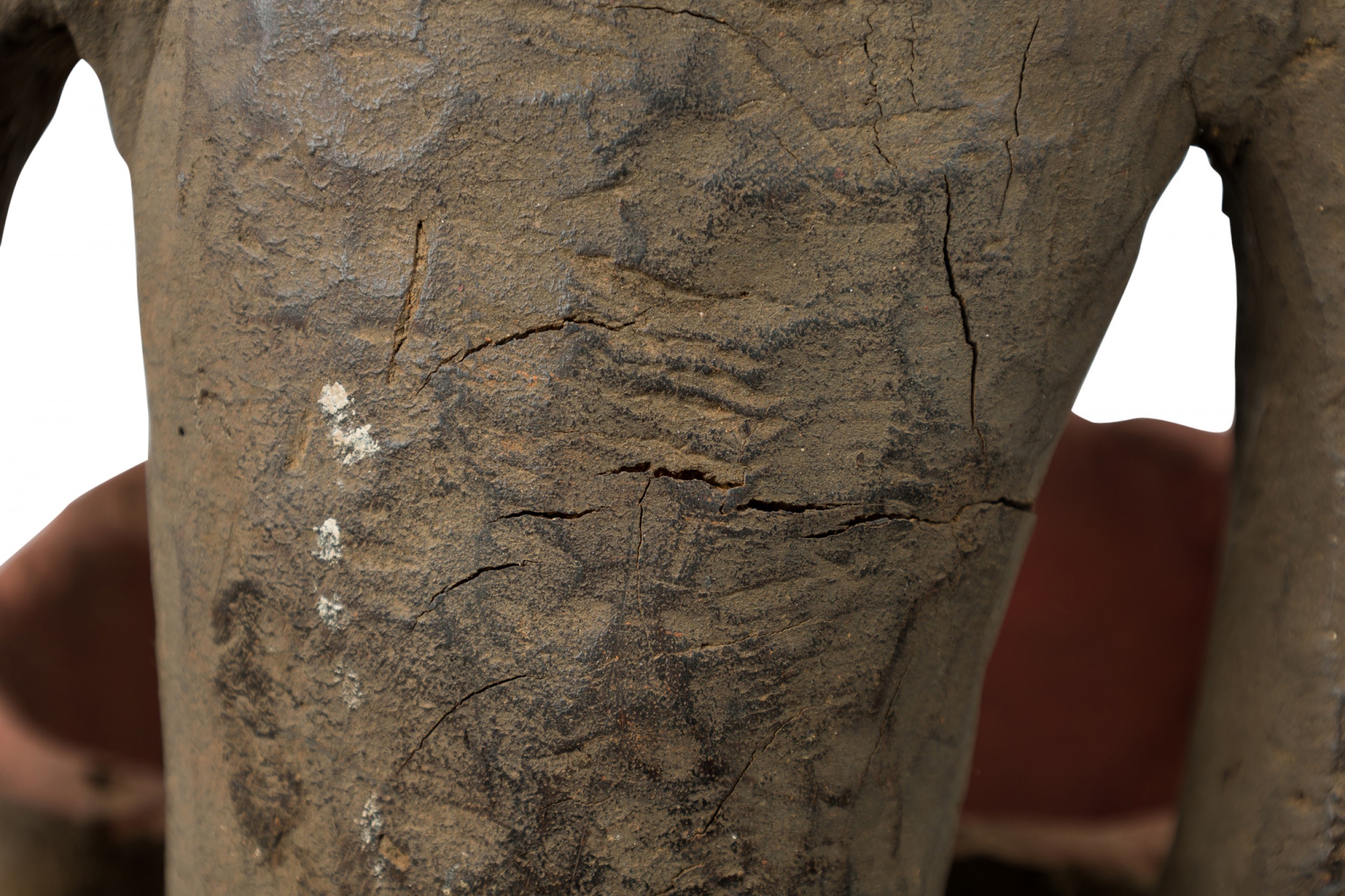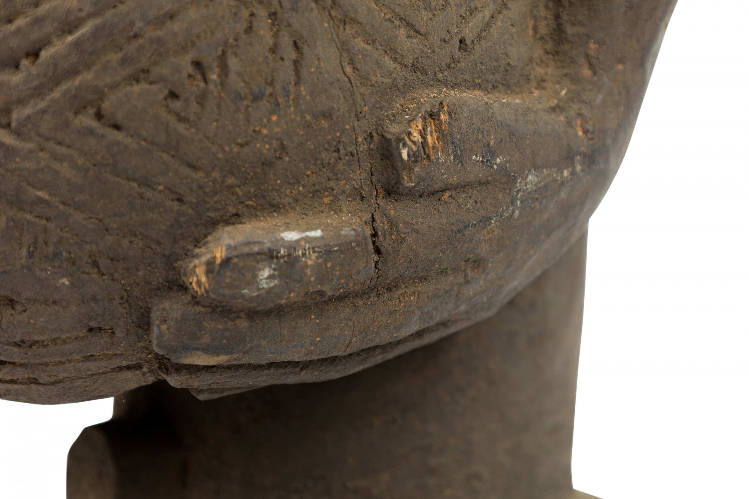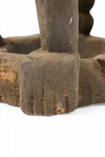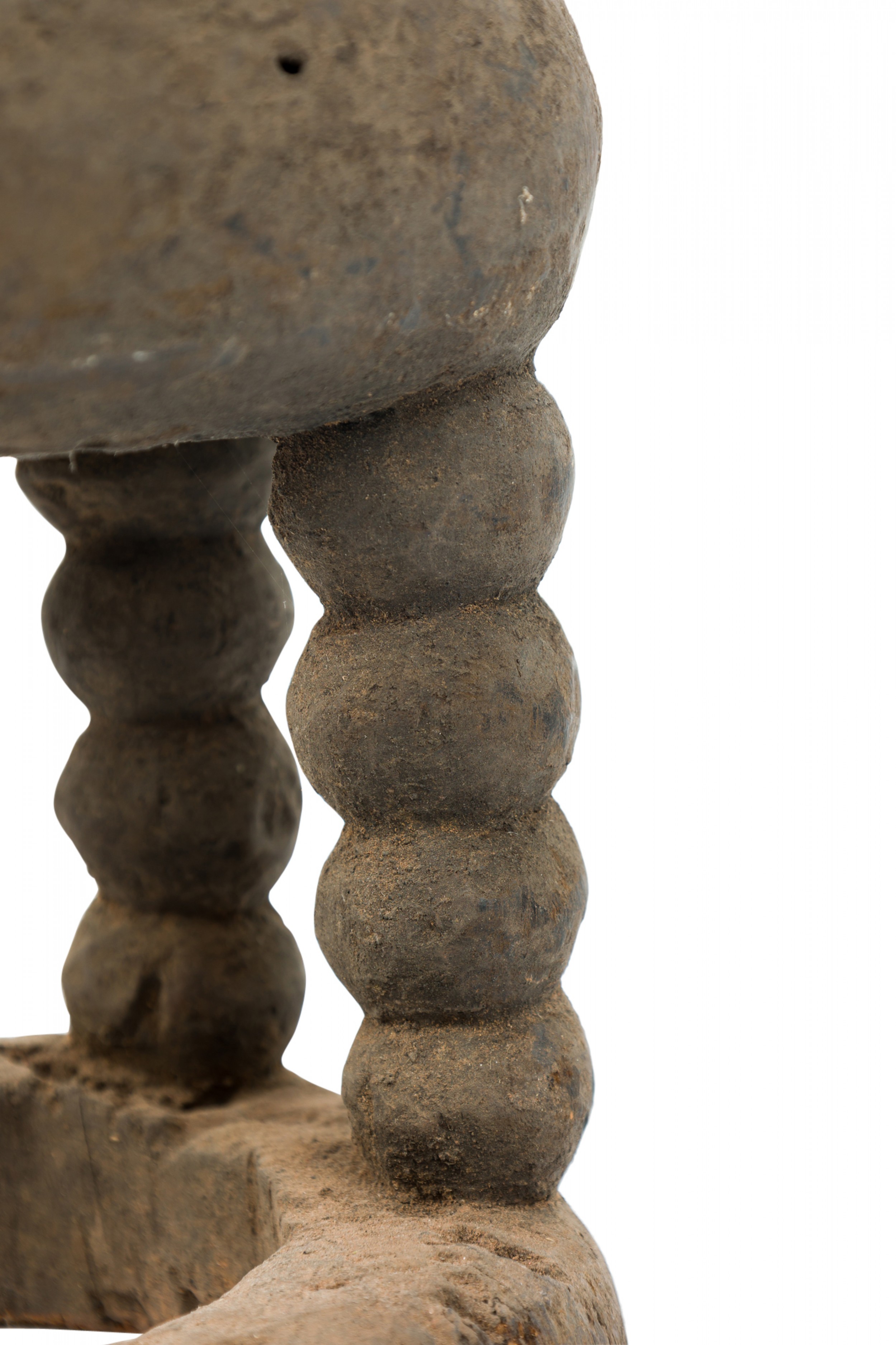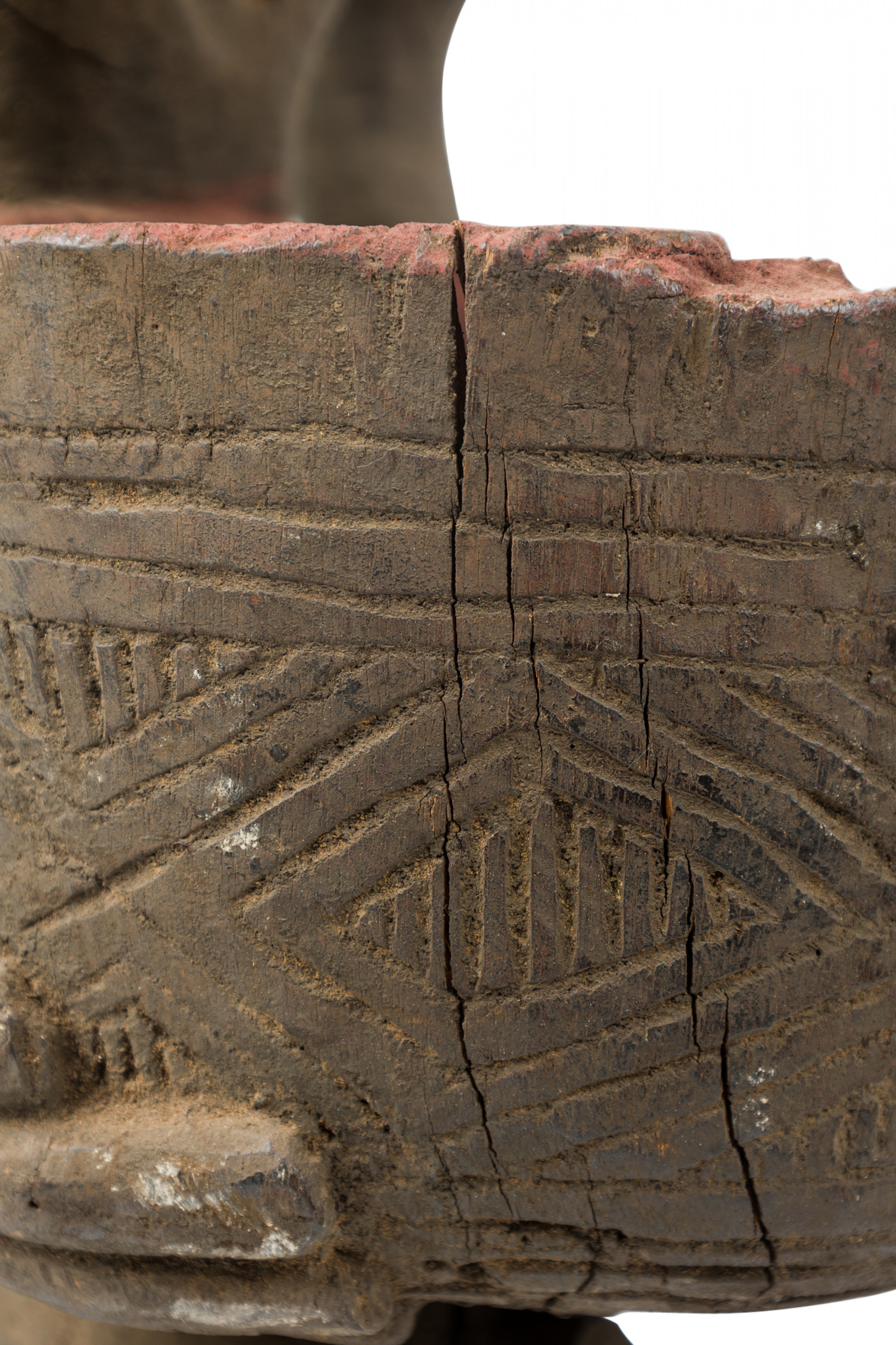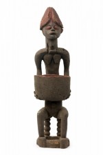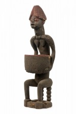 African Nigeria 20th Century carved wood & terra cotta Yoruba female figure seated on 2 posts, with crosshatched hair, holding a large ceremonial bowl with incised decoration, supported on an openwork oval base.