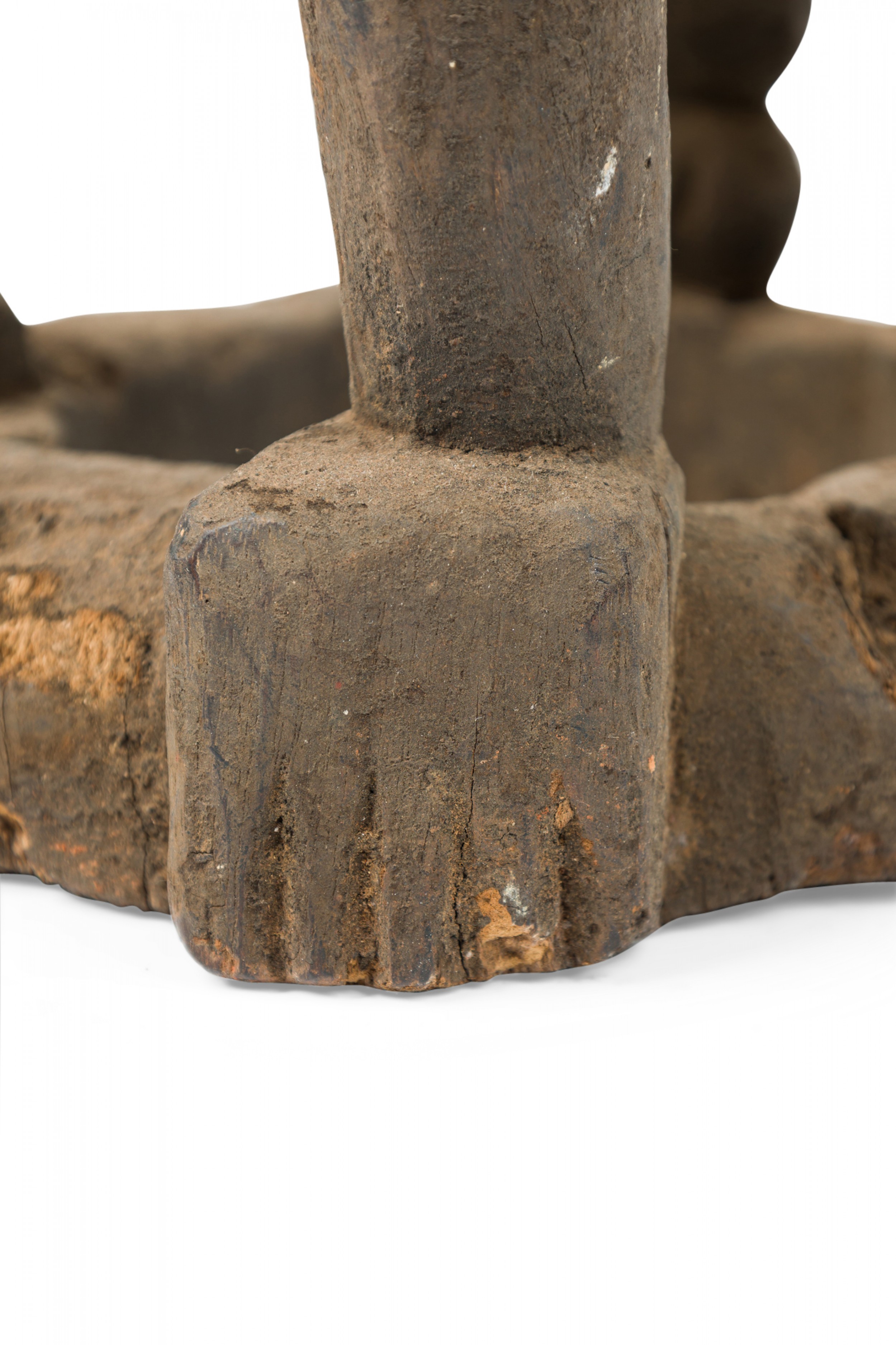 African Nigeria 20th Century carved wood & terra cotta Yoruba female figure seated on 2 posts, with crosshatched hair, holding a large ceremonial bowl with incised decoration, supported on an openwork oval base..