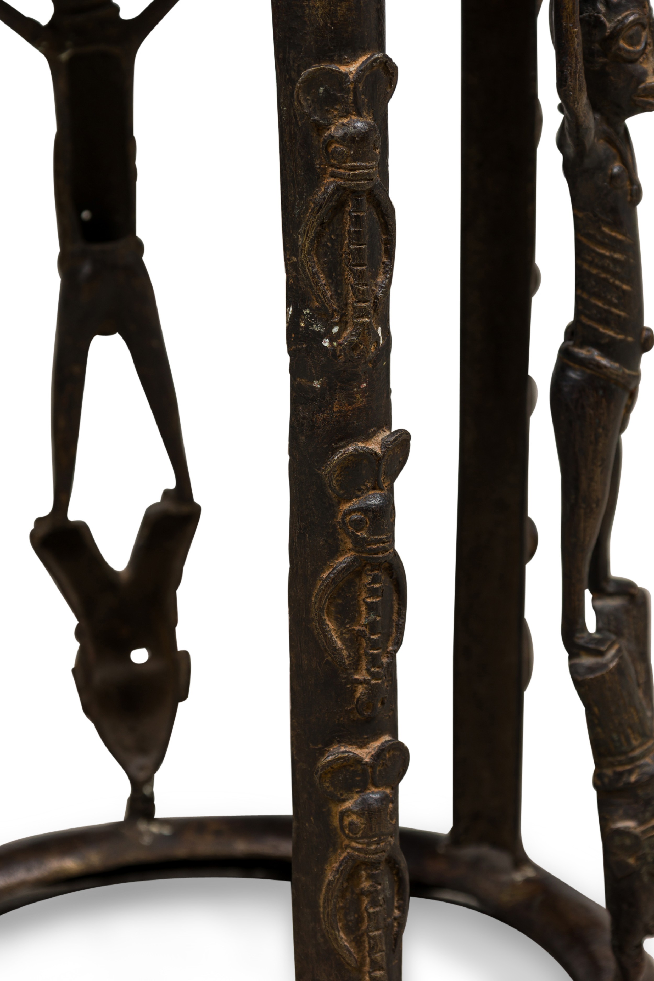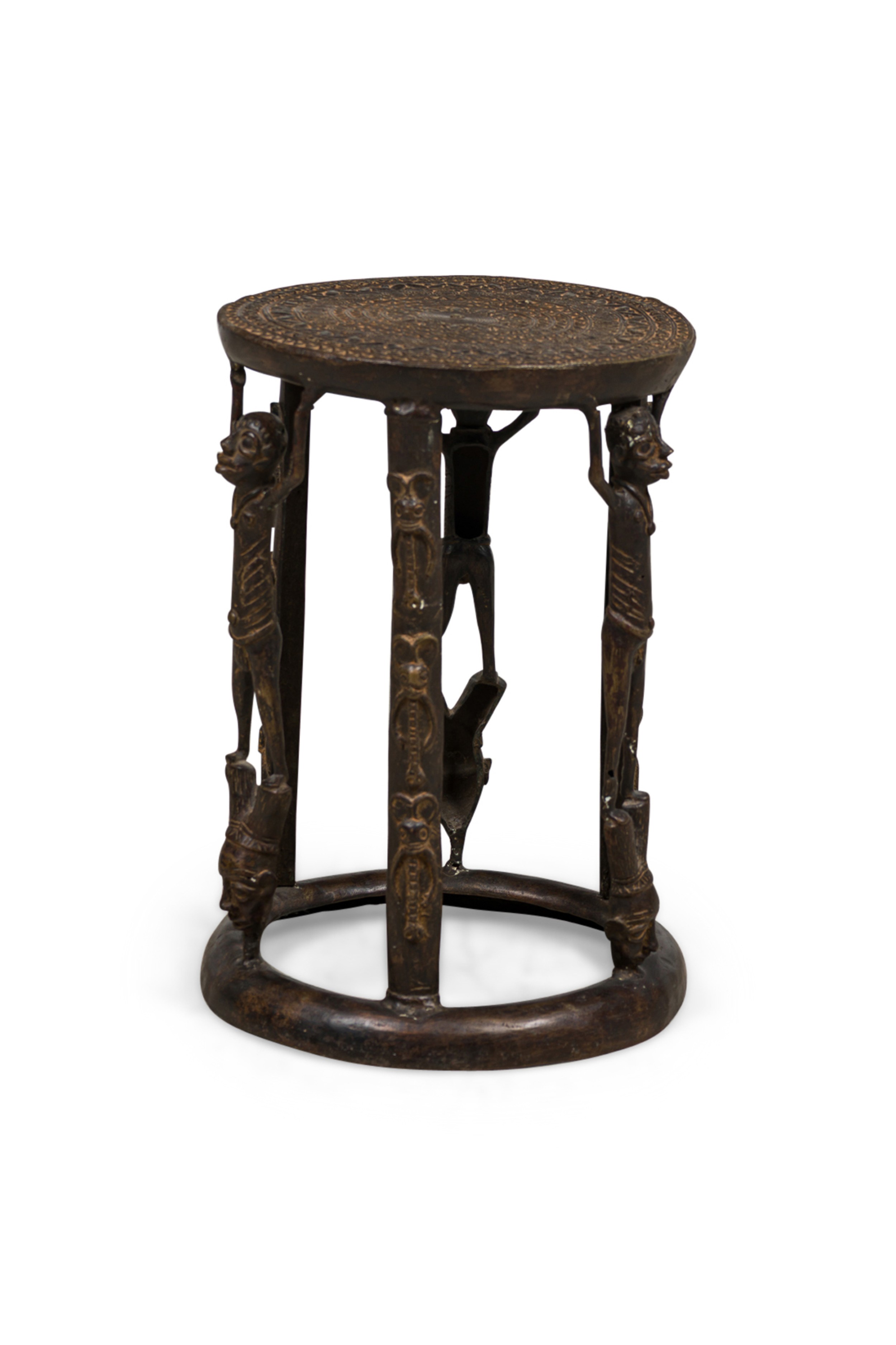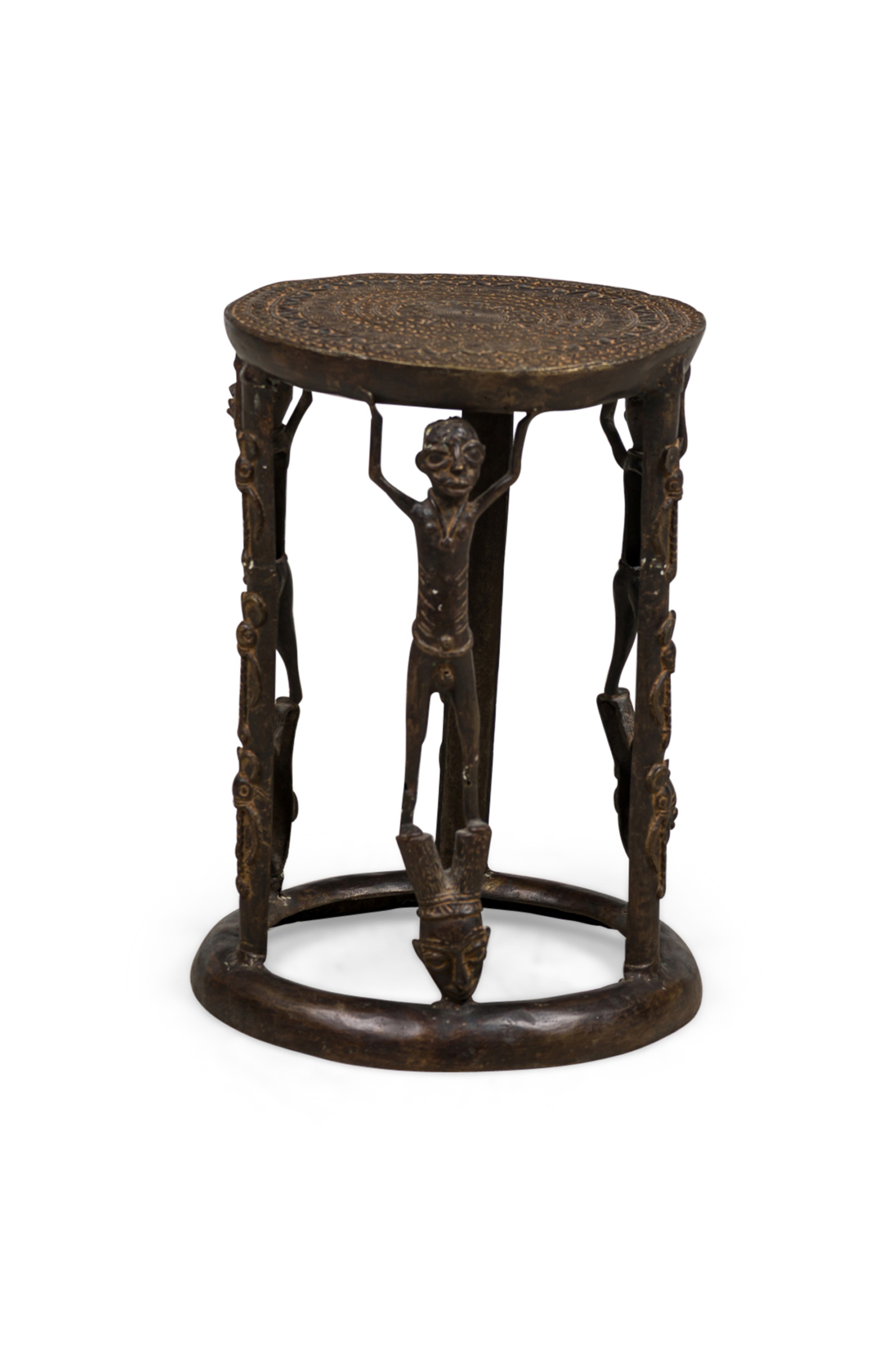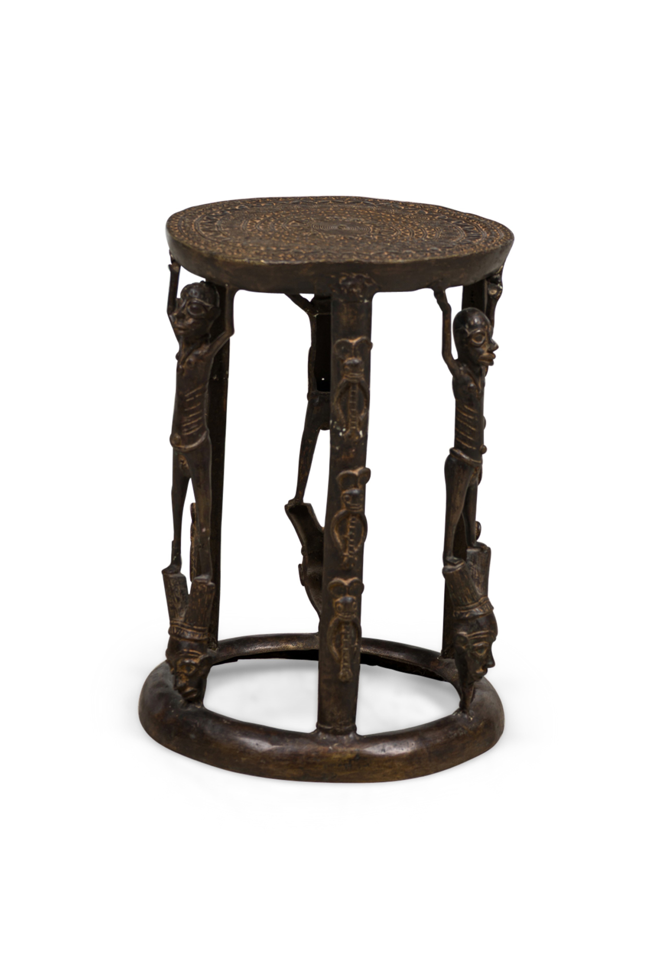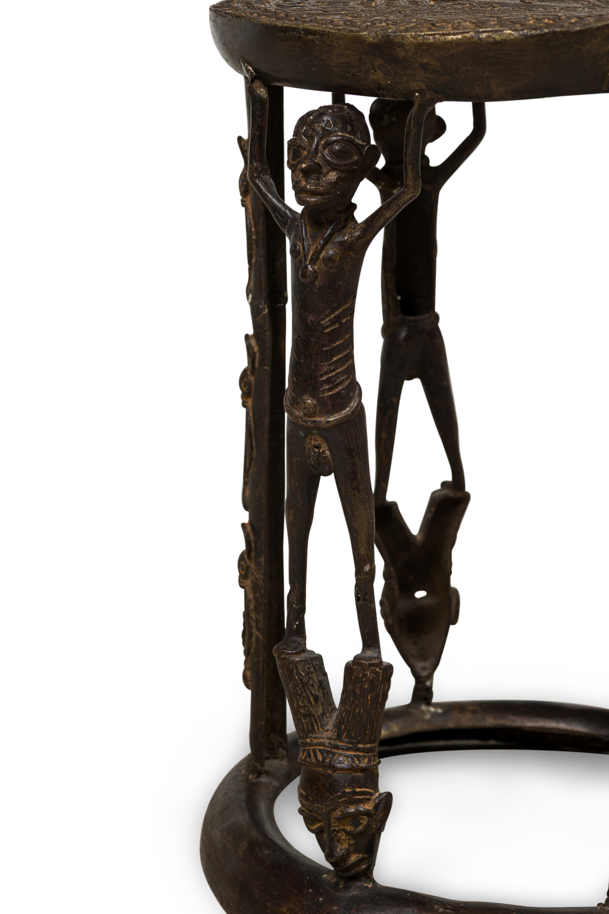 African Tikar bronze stool from Cameroon with 3 human figurines above 3 masks, holding the seating platform, originally used for ceremonial purposes.