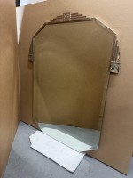 American Art Deco octagonal bevelled mirror with nickel plated pediment showcasing an octagonal design ornamented with a stepped design element.