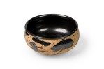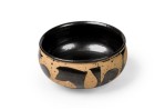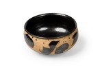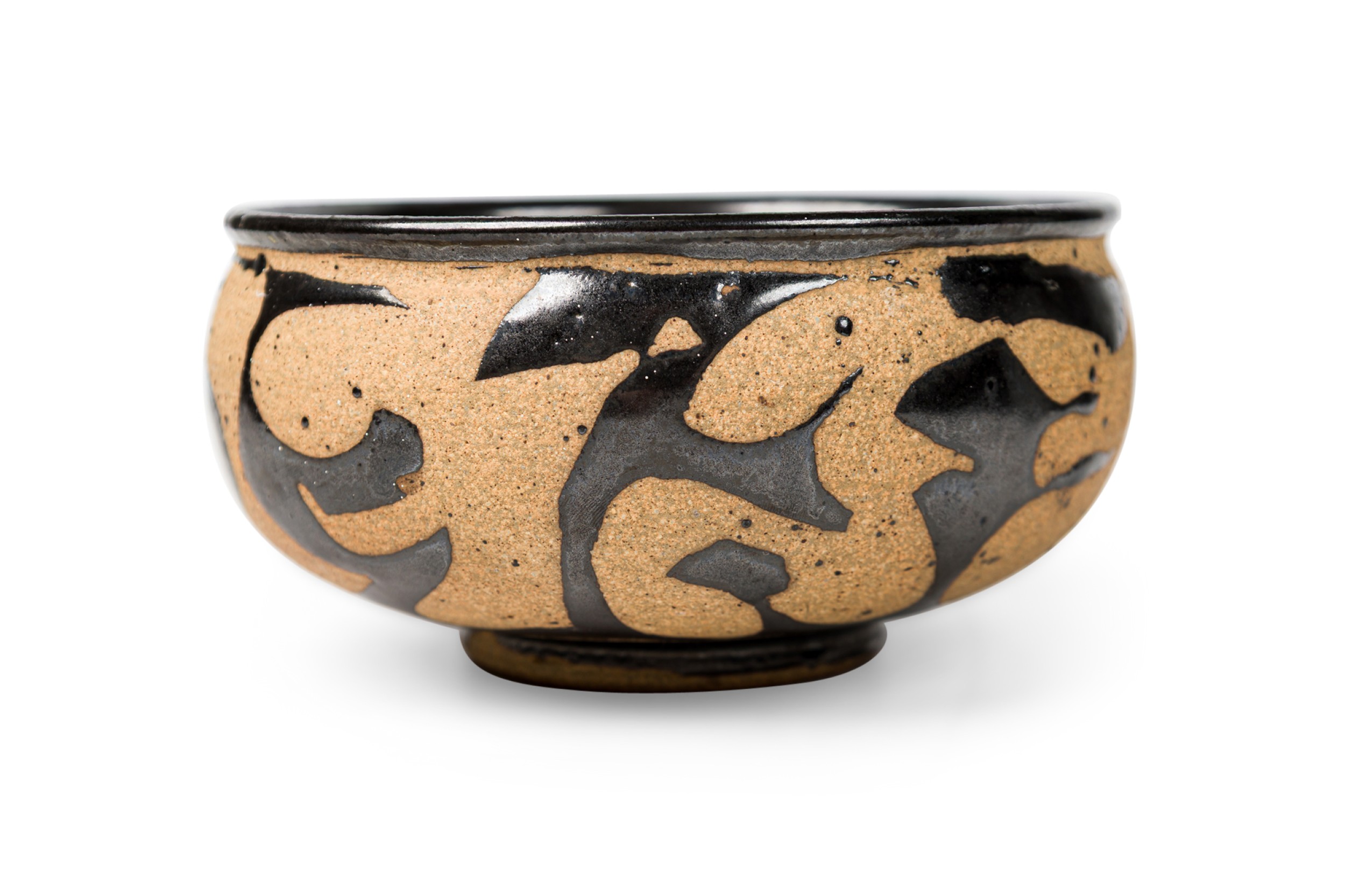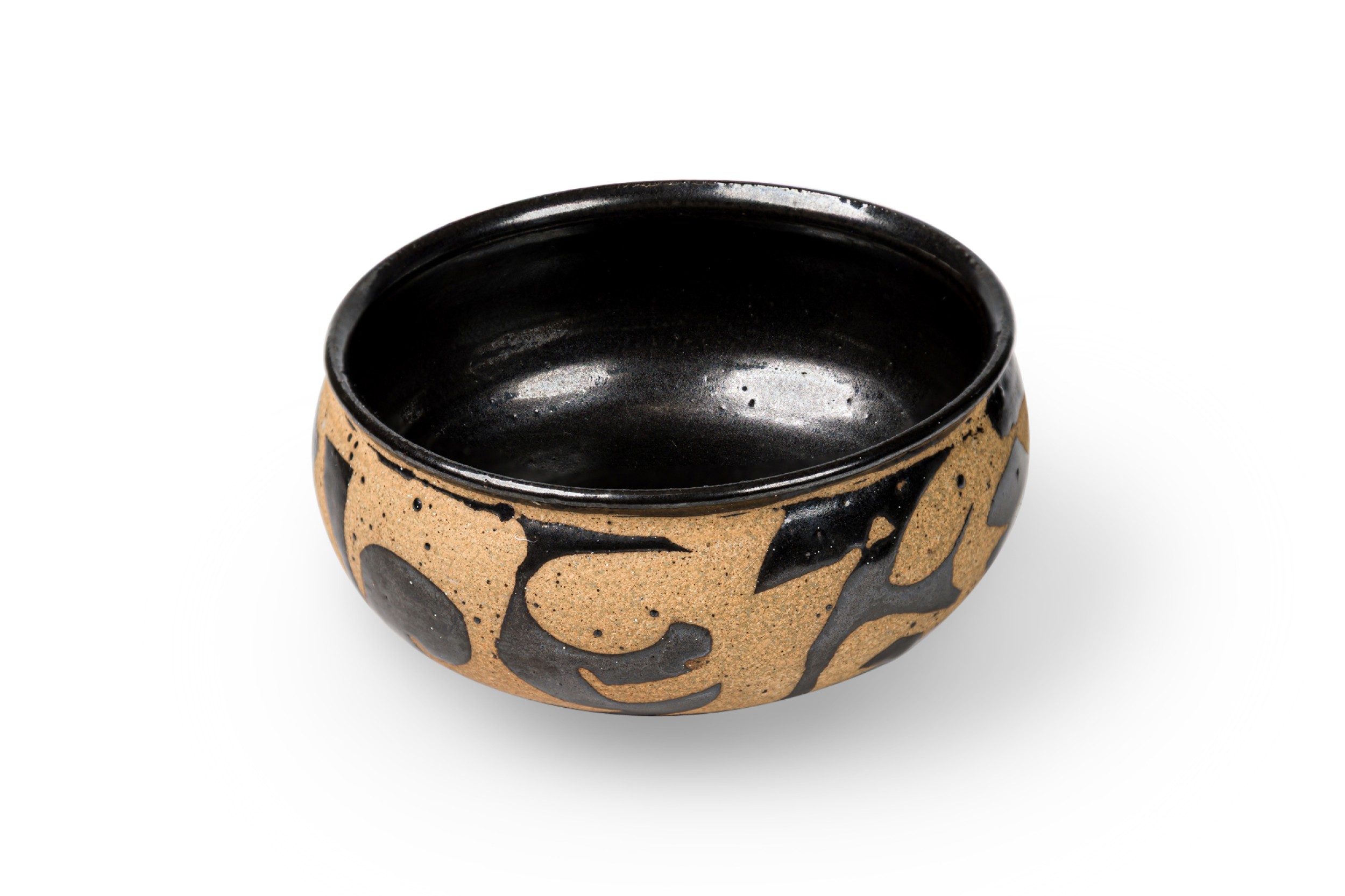 American Contemporary beige and blue abstract design bowl with a bulbous body and blue interior on a raised round base (marked on base).