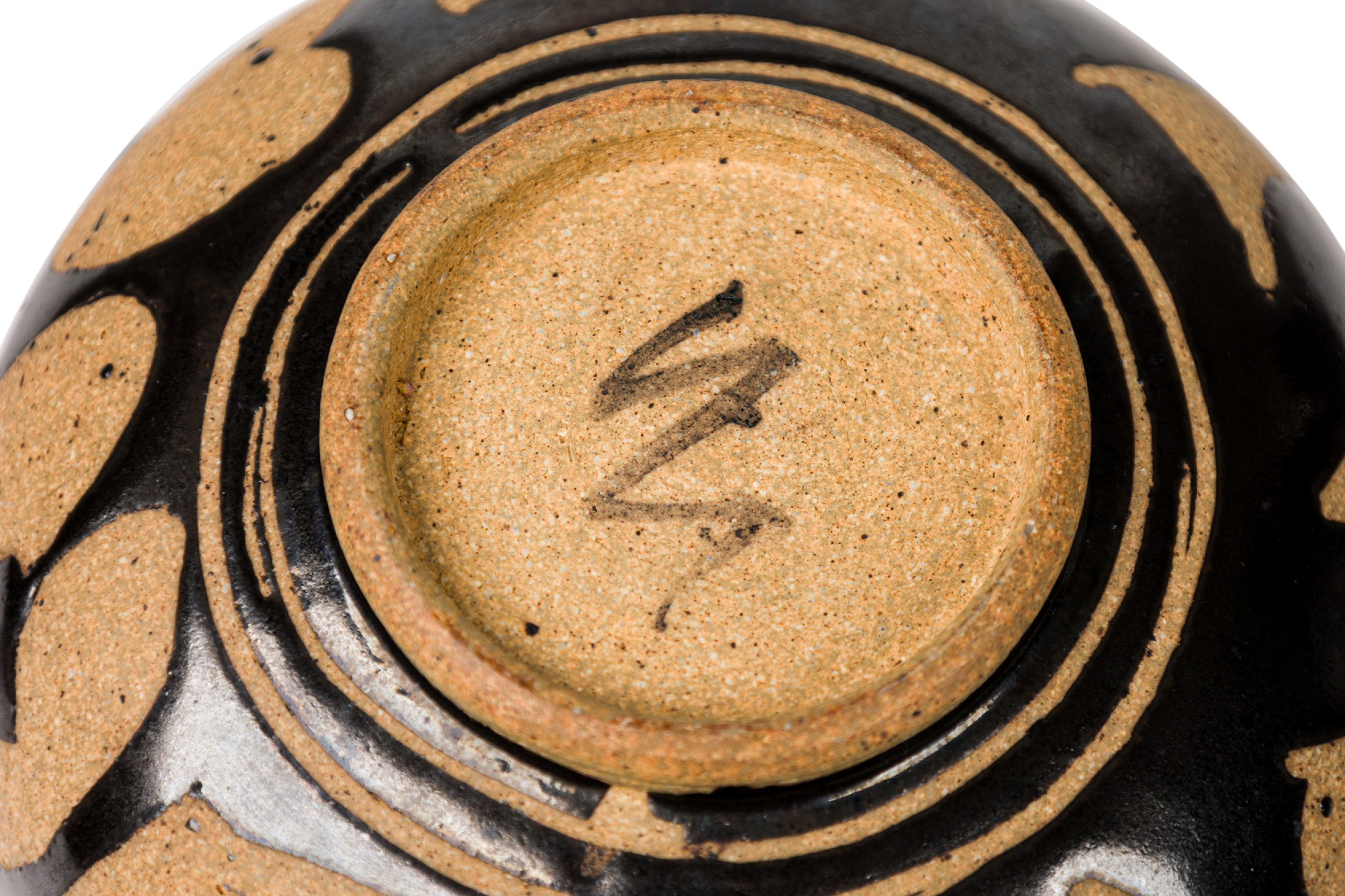 American Contemporary beige and blue abstract design bowl with a bulbous body and blue interior on a raised round base (marked on base)