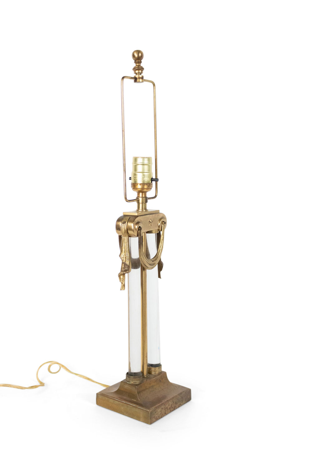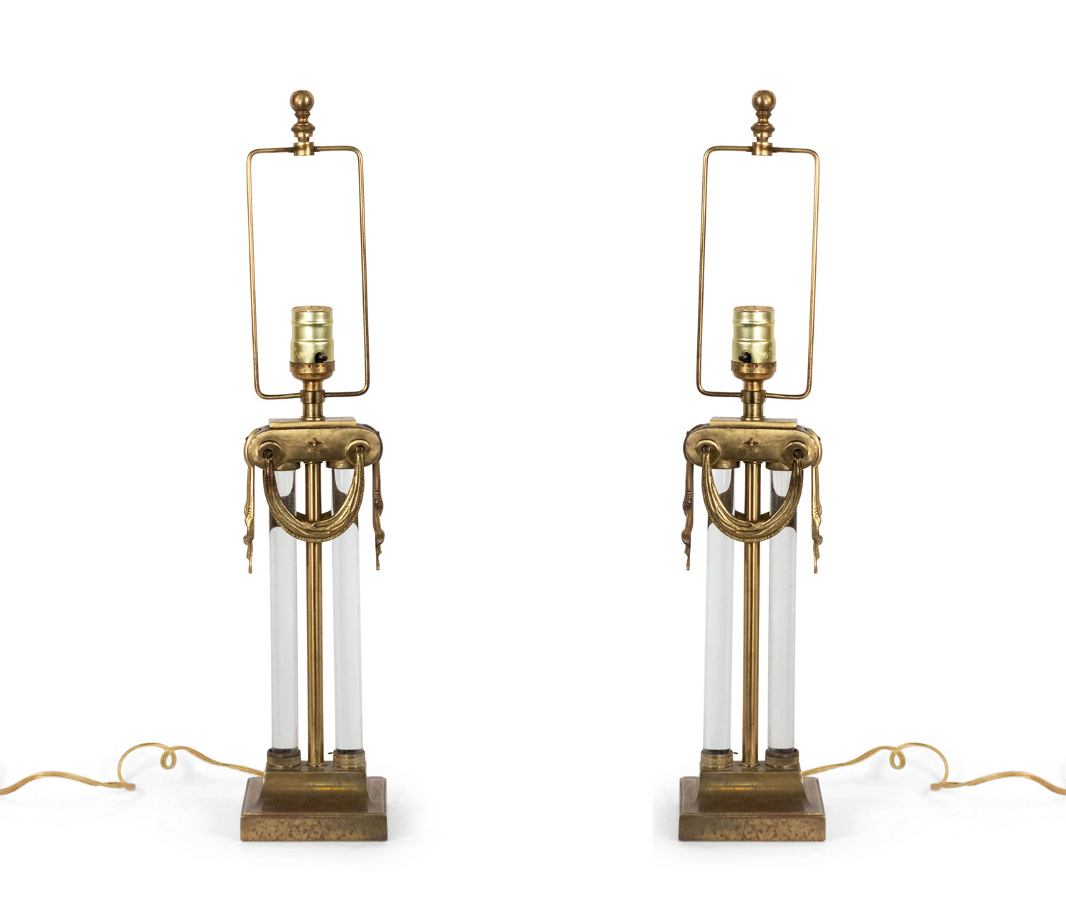 PAIR of American Mid-Century brass & glass table lamps with swag hung capital above paired glass cylinders (PRICED AS PAIR).