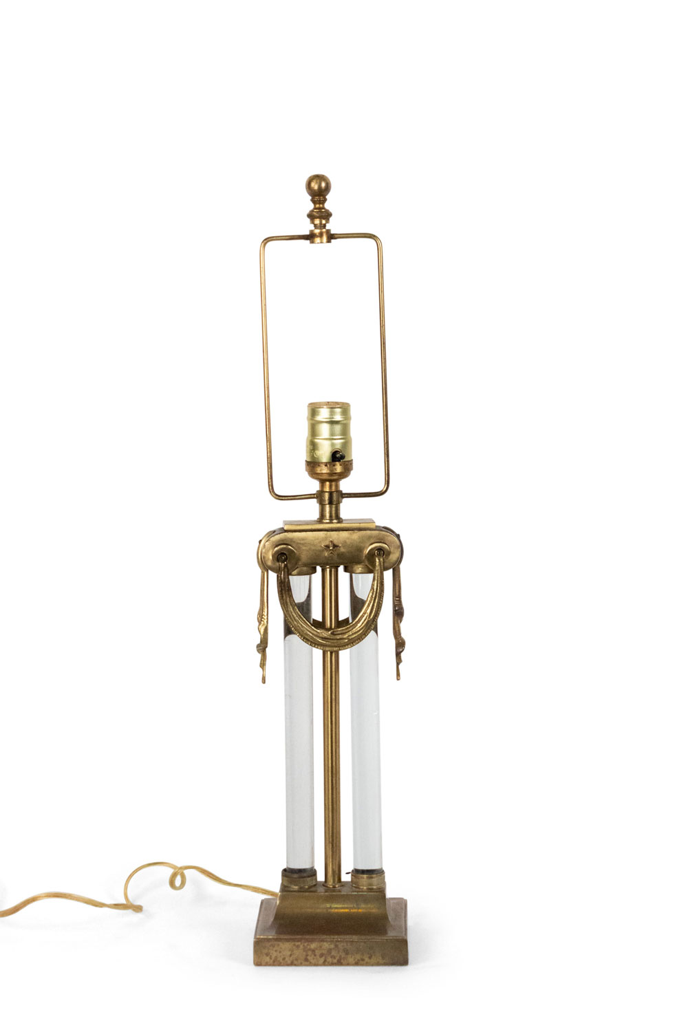 PAIR of American Mid-Century brass & glass table lamps with swag hung capital above paired glass cylinders (PRICED AS PAIR)..