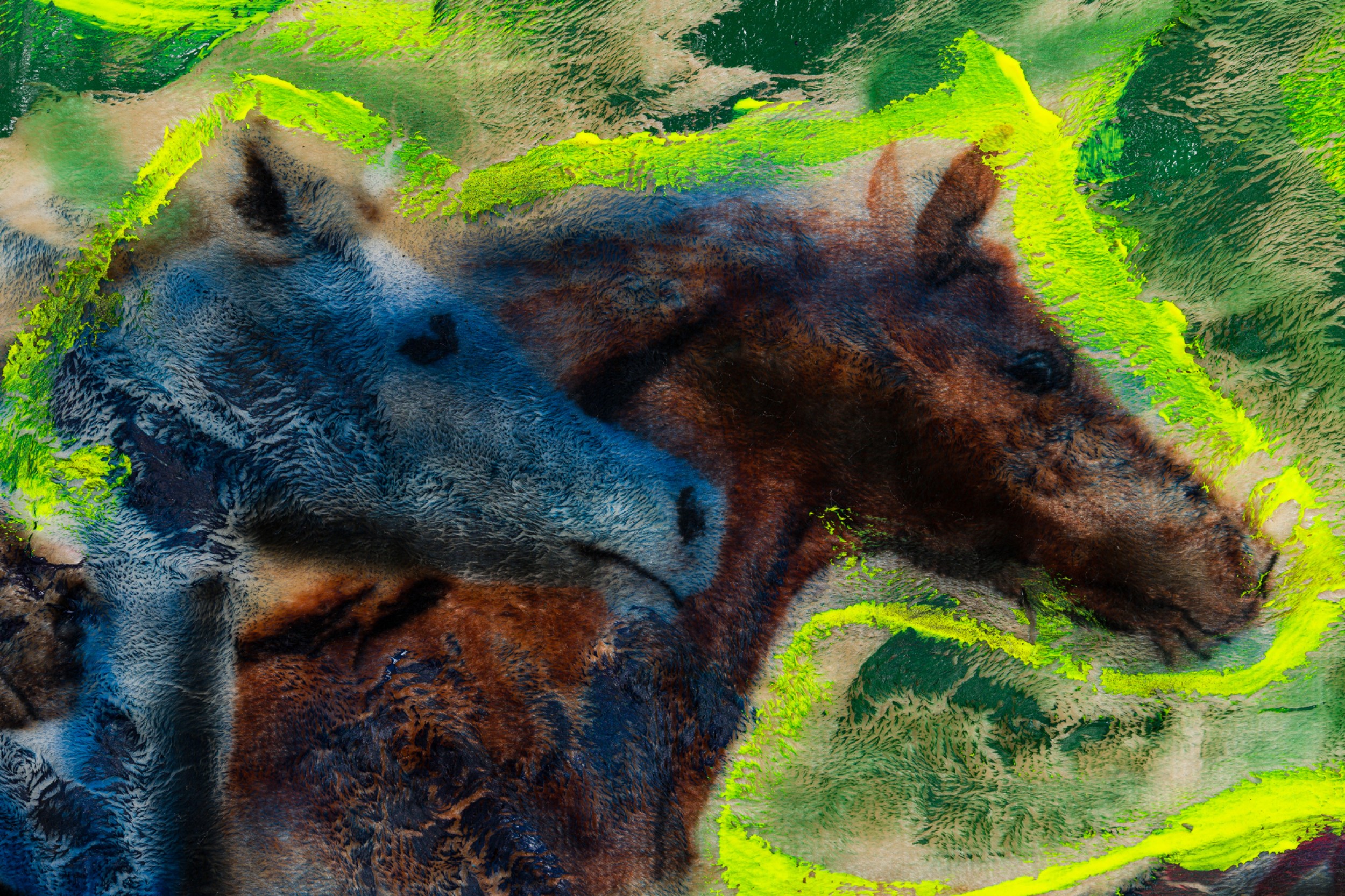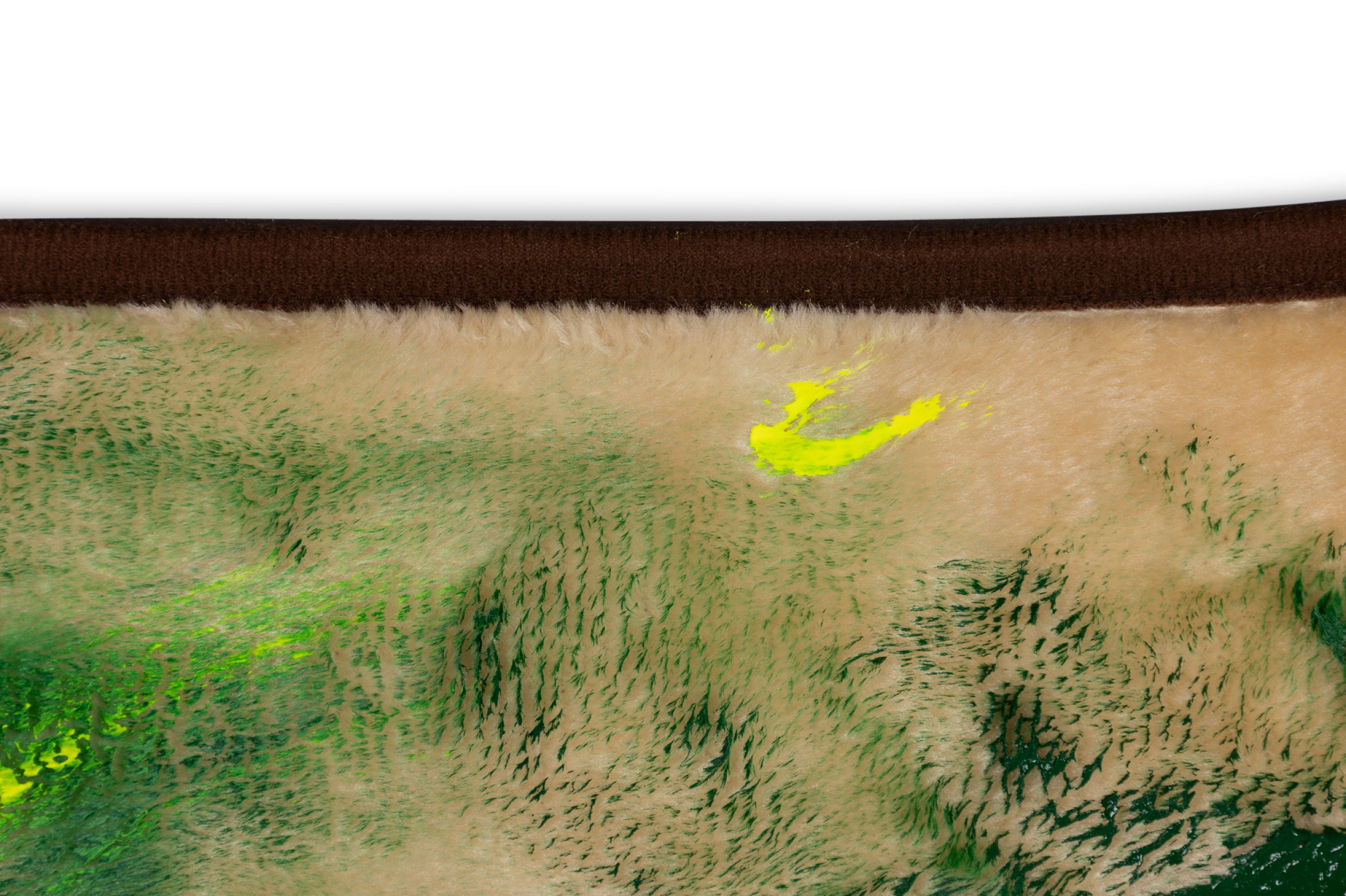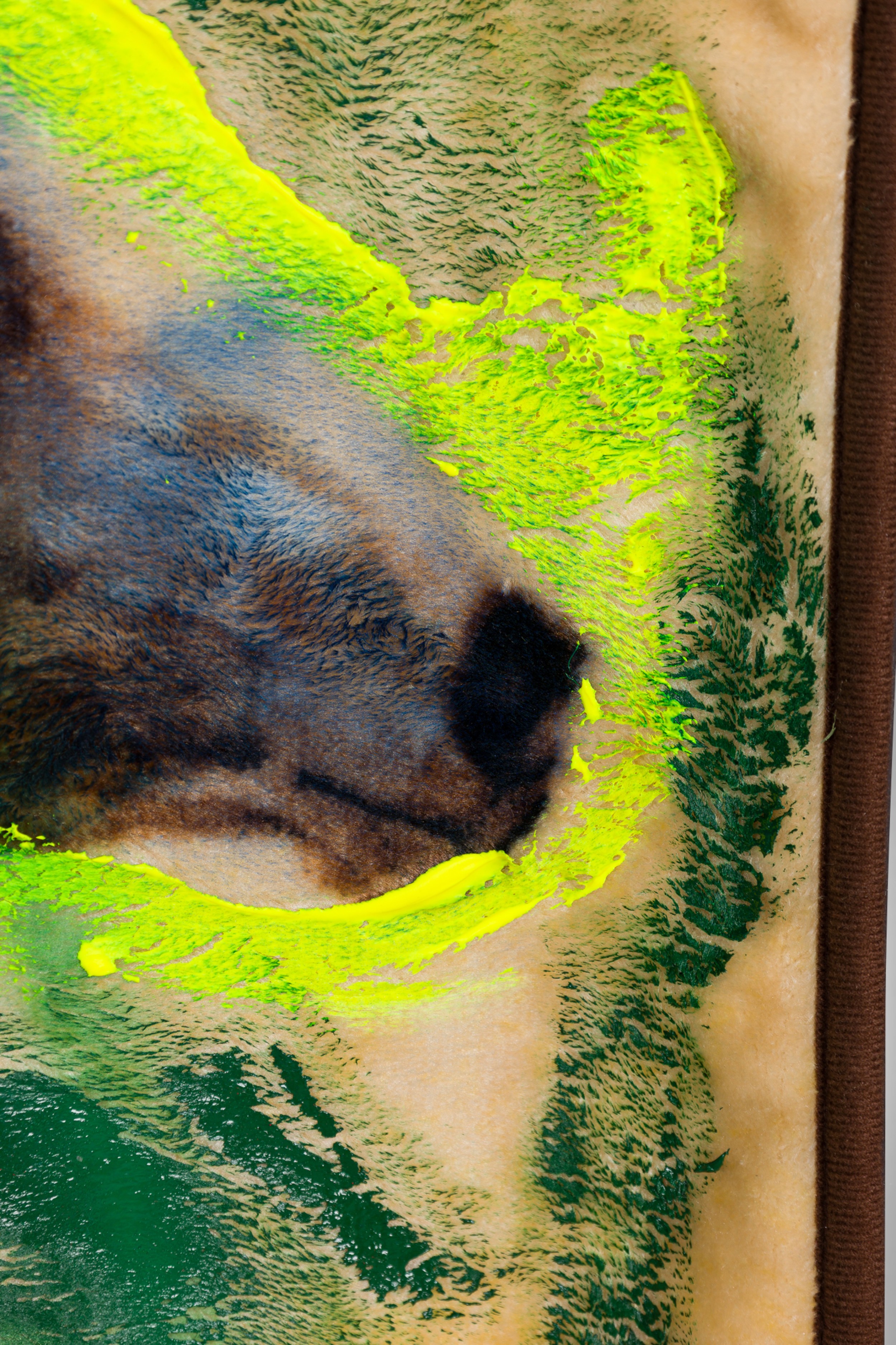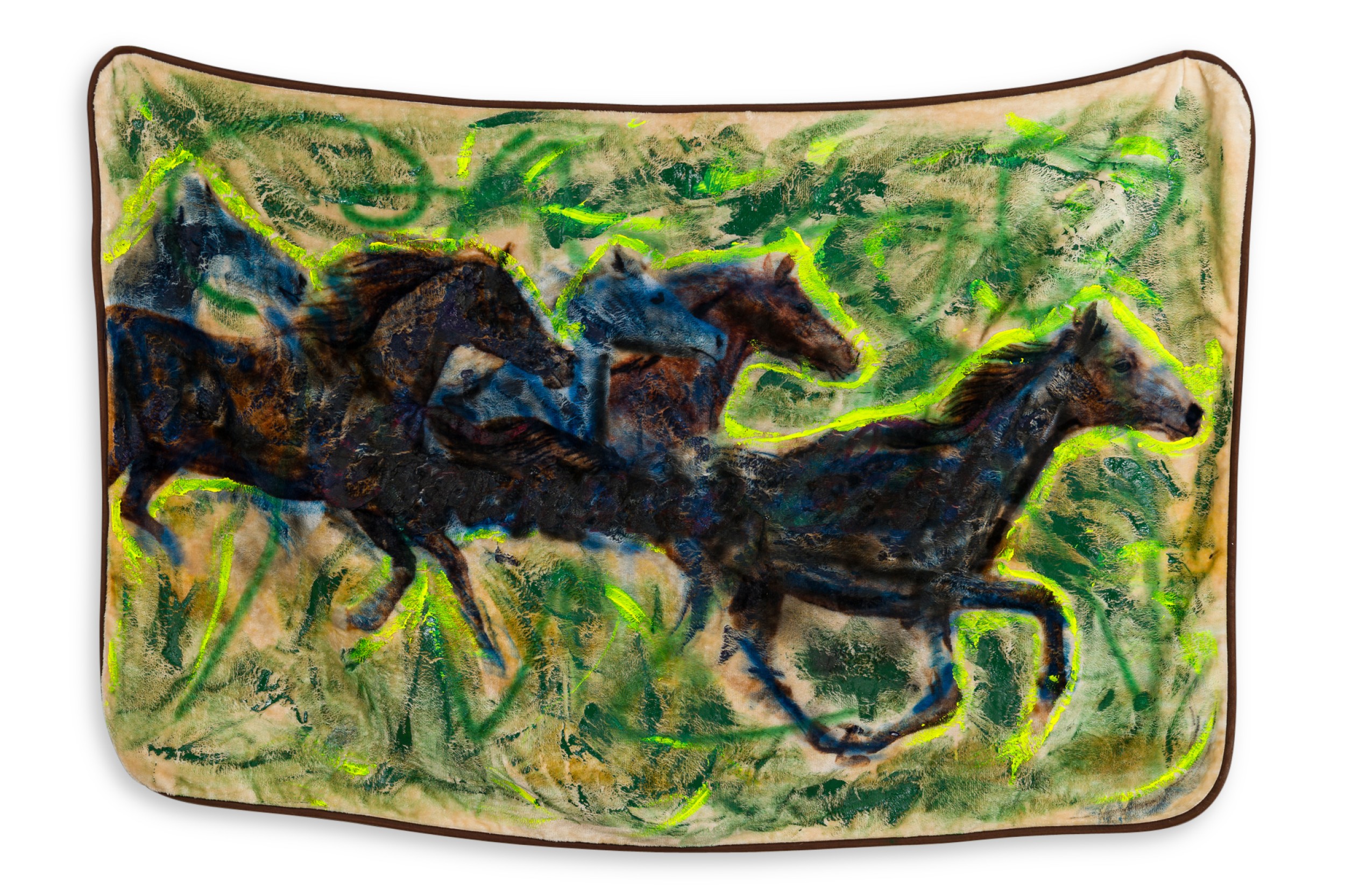 American Contemporary Readymade Artwork of a dye sublimated fleece horse blanket modified with neon blue and green acrylic paint and enamel (Signed Verso: GORDON HOLDEN)