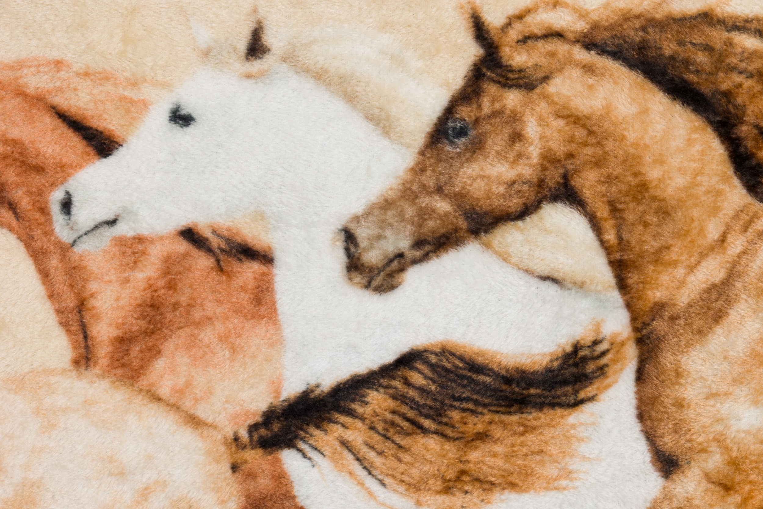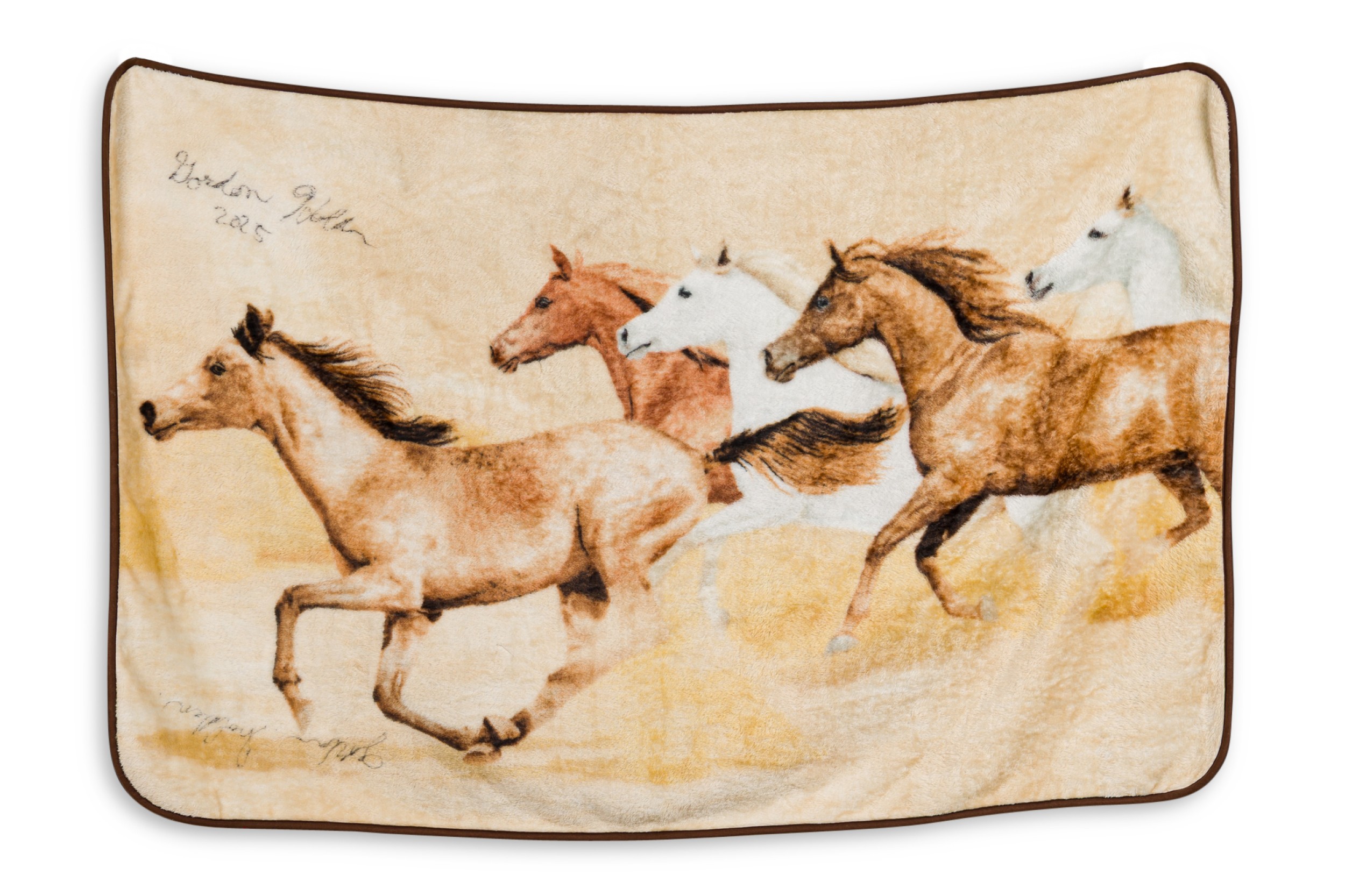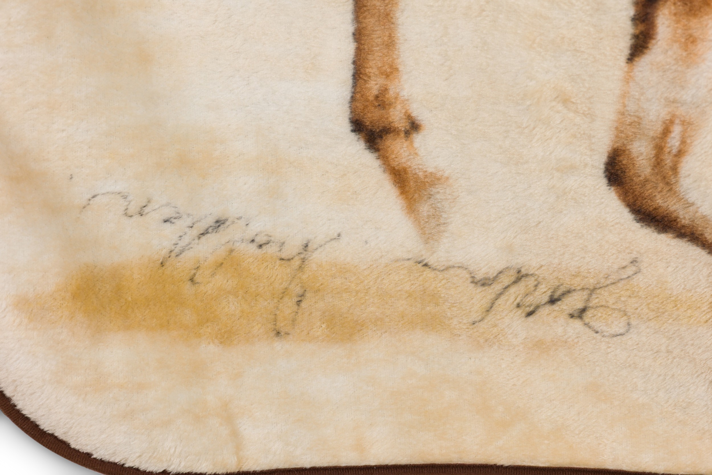 American Contemporary Readymade Artwork of a dye sublimated fleece horse blanket modified with neon blue and green acrylic paint and enamel (Signed Verso: GORDON HOLDEN).