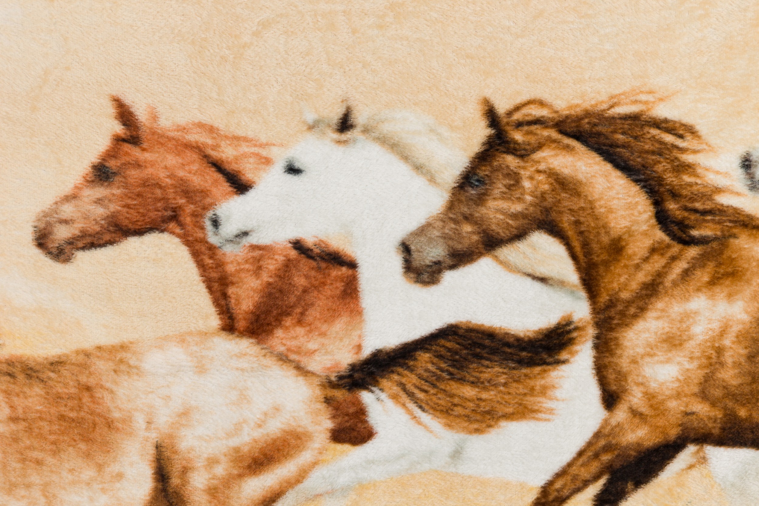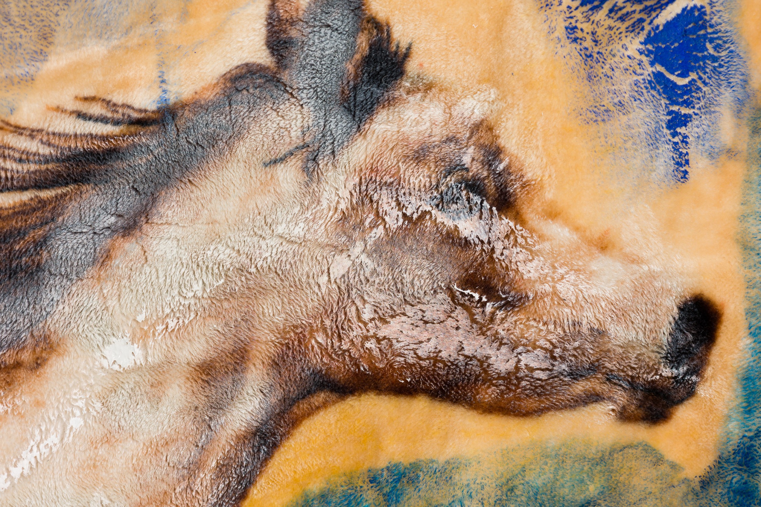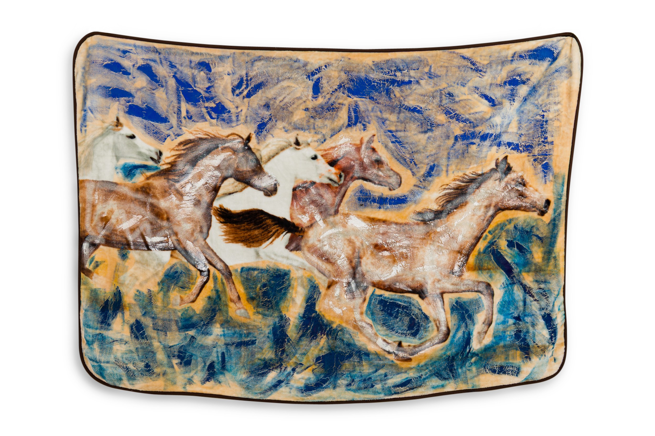 American Contemporary Readymade Artwork of a dye sublimented fleece horse blanket modified with blue and white acrylic paint and enamel (Signed Verso: GORDON HOLDEN).