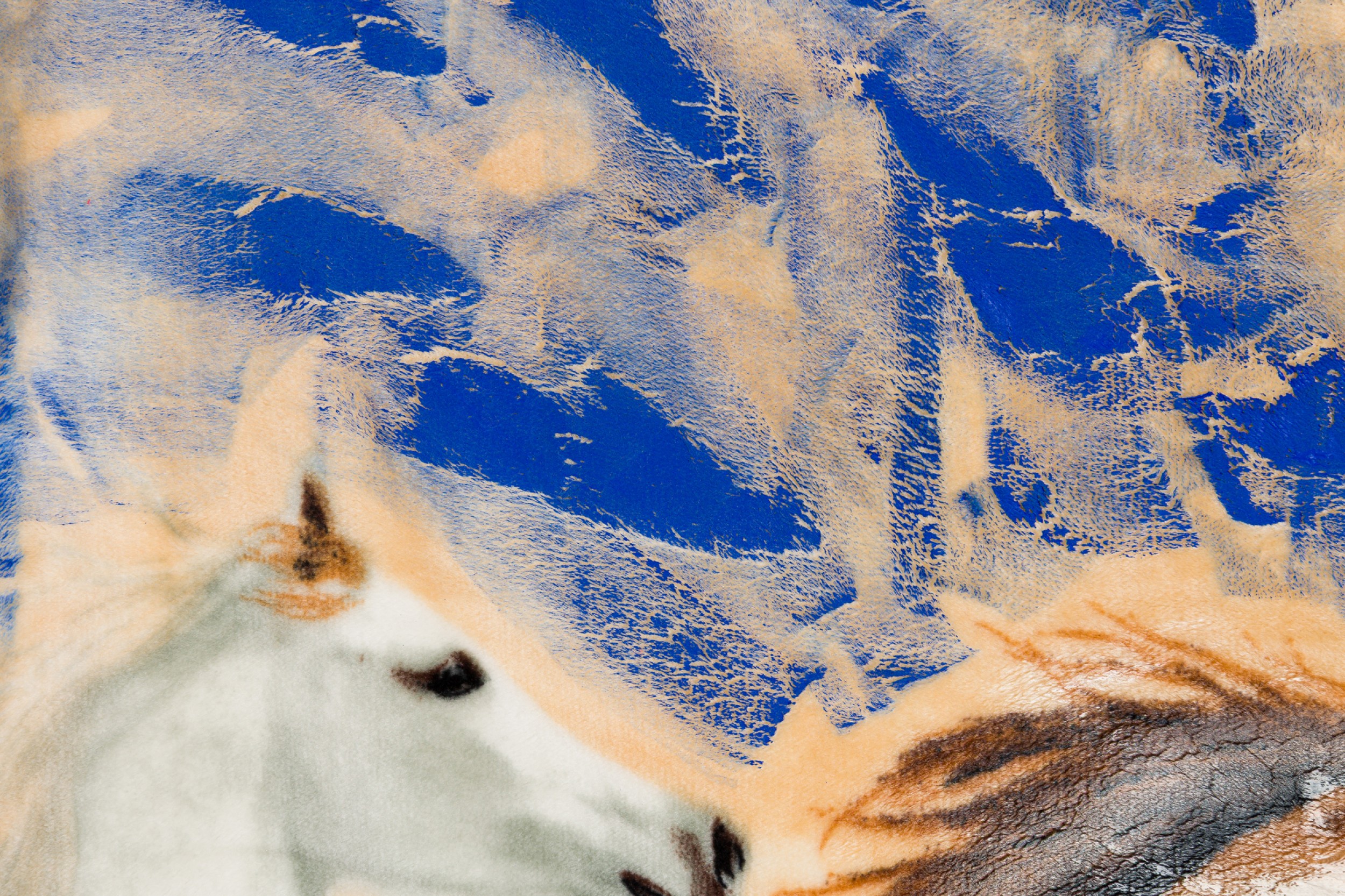 American Contemporary Readymade Artwork of a dye sublimented fleece horse blanket modified with blue and white acrylic paint and enamel (Signed Verso: GORDON HOLDEN)